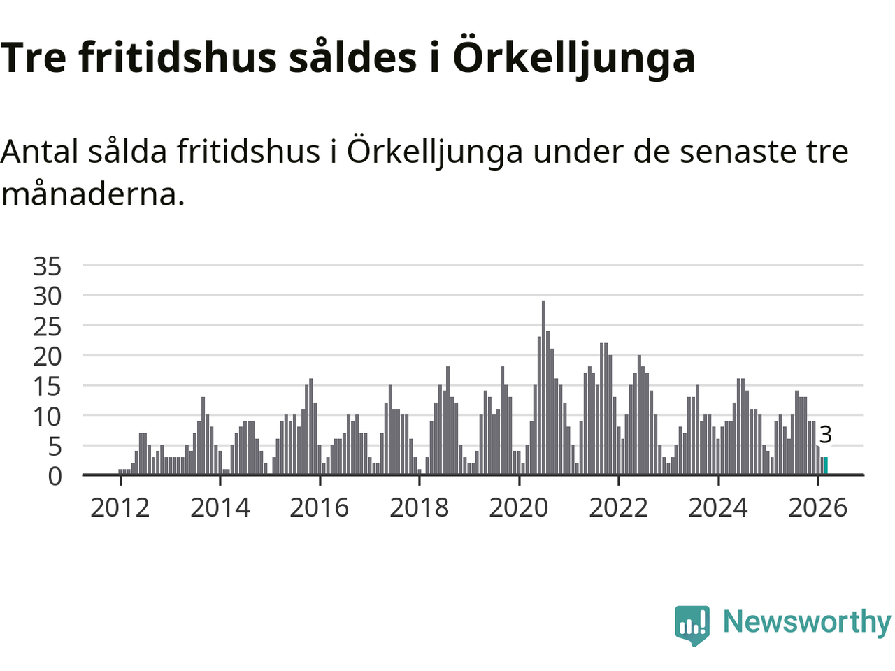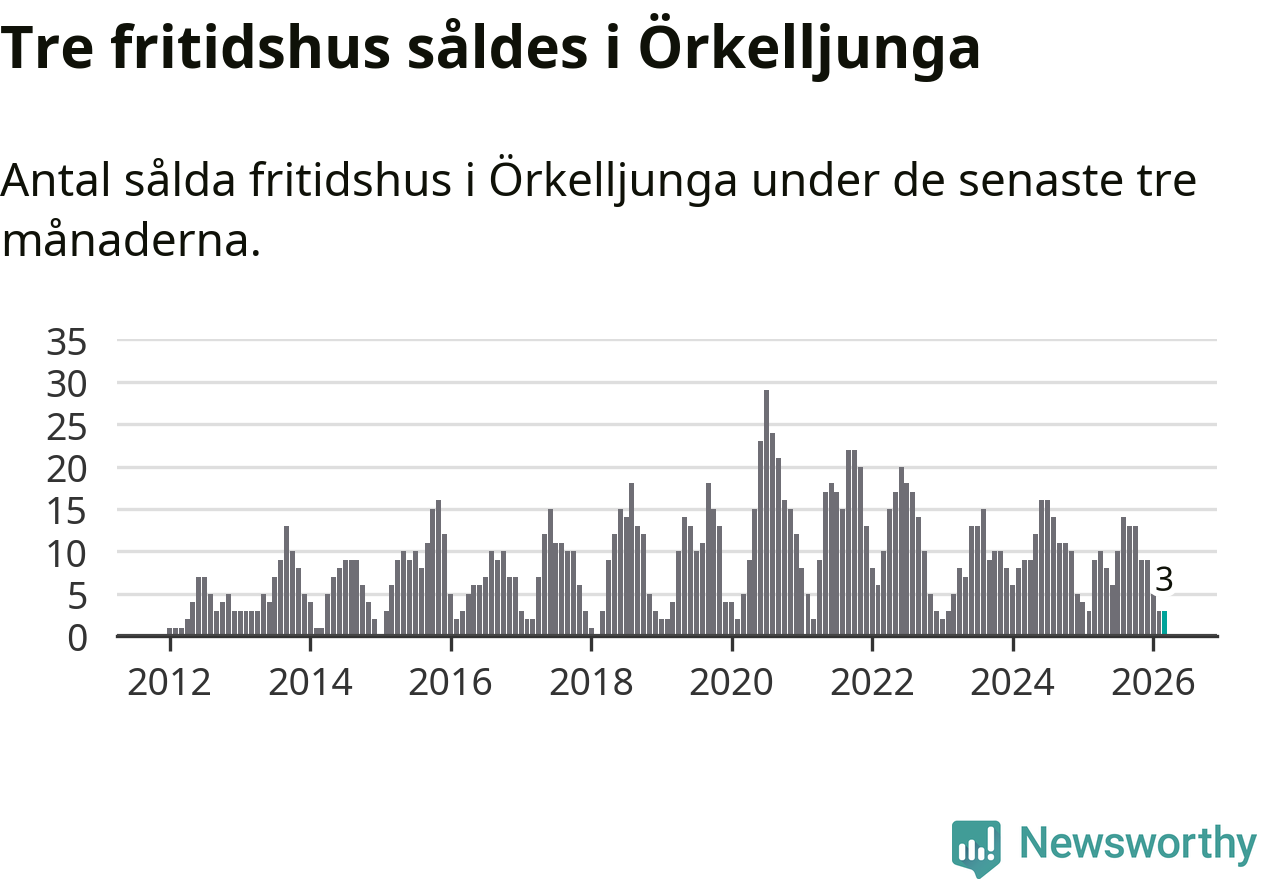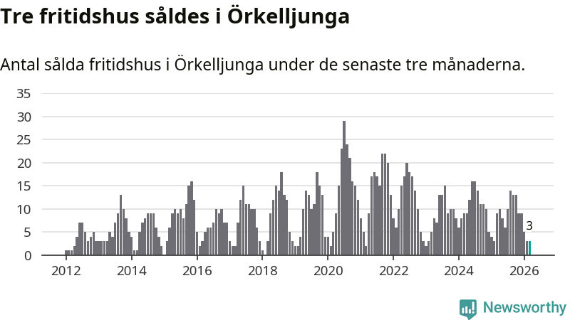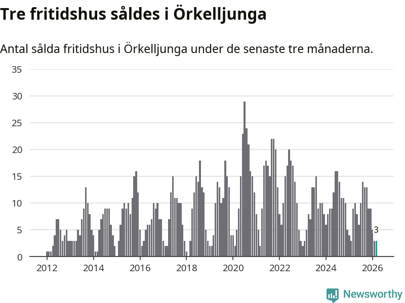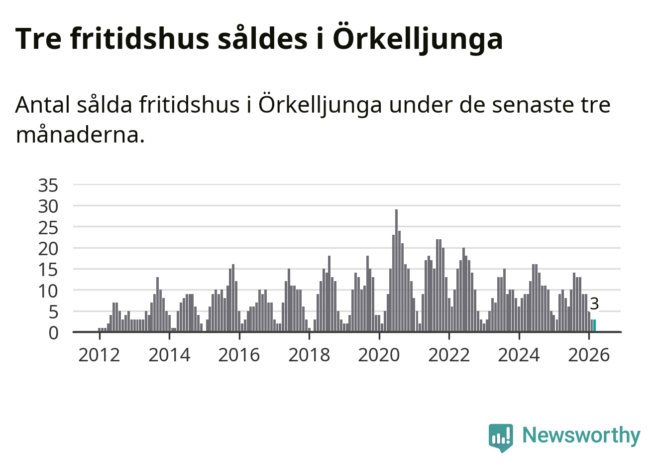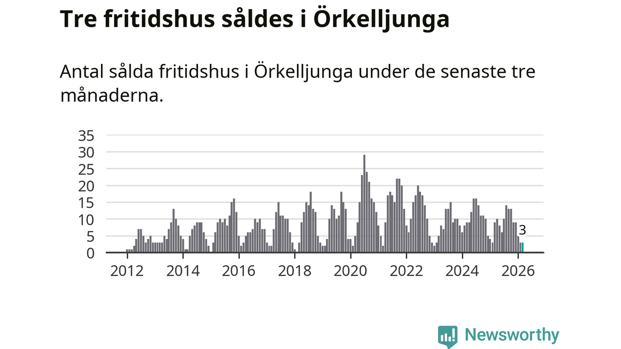Mellan januari och mars såldes 27 villor i Örkelljunga kommun. Det är relativt många sett till aktiviteten på bostadsmarknaden i kommunen under de senaste tolv månaderna, samt det historiska snittet för den här tiden på året.