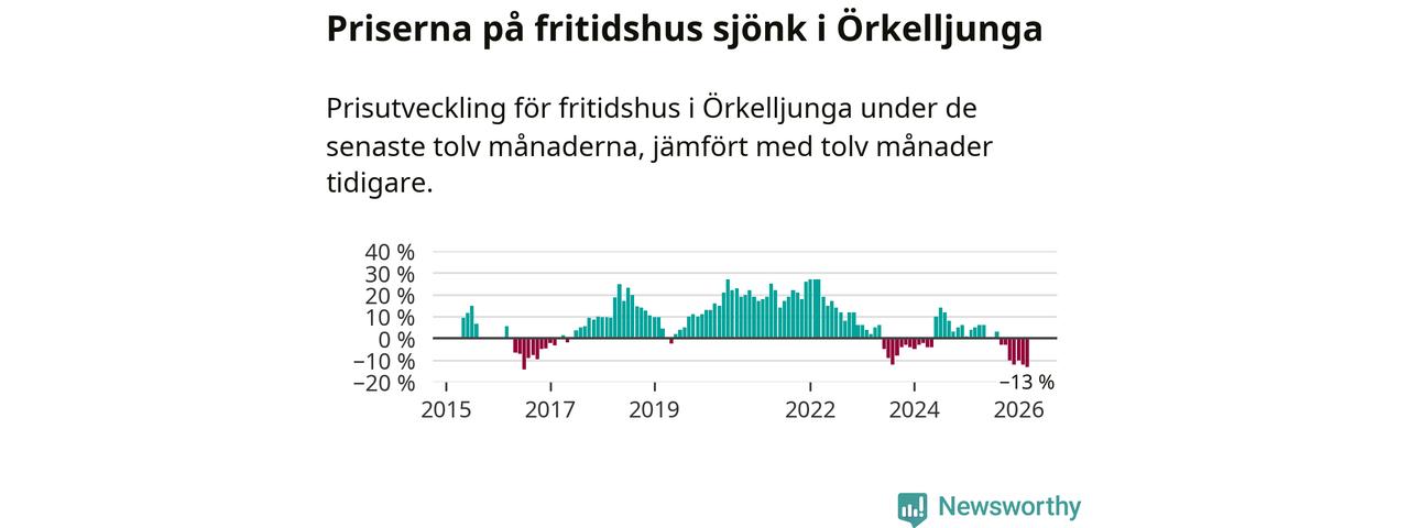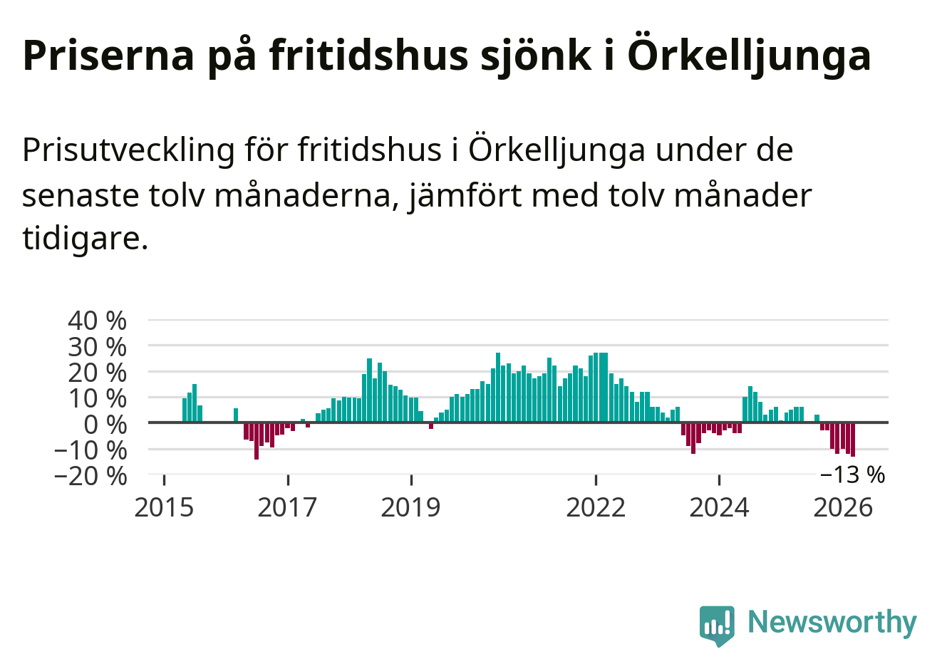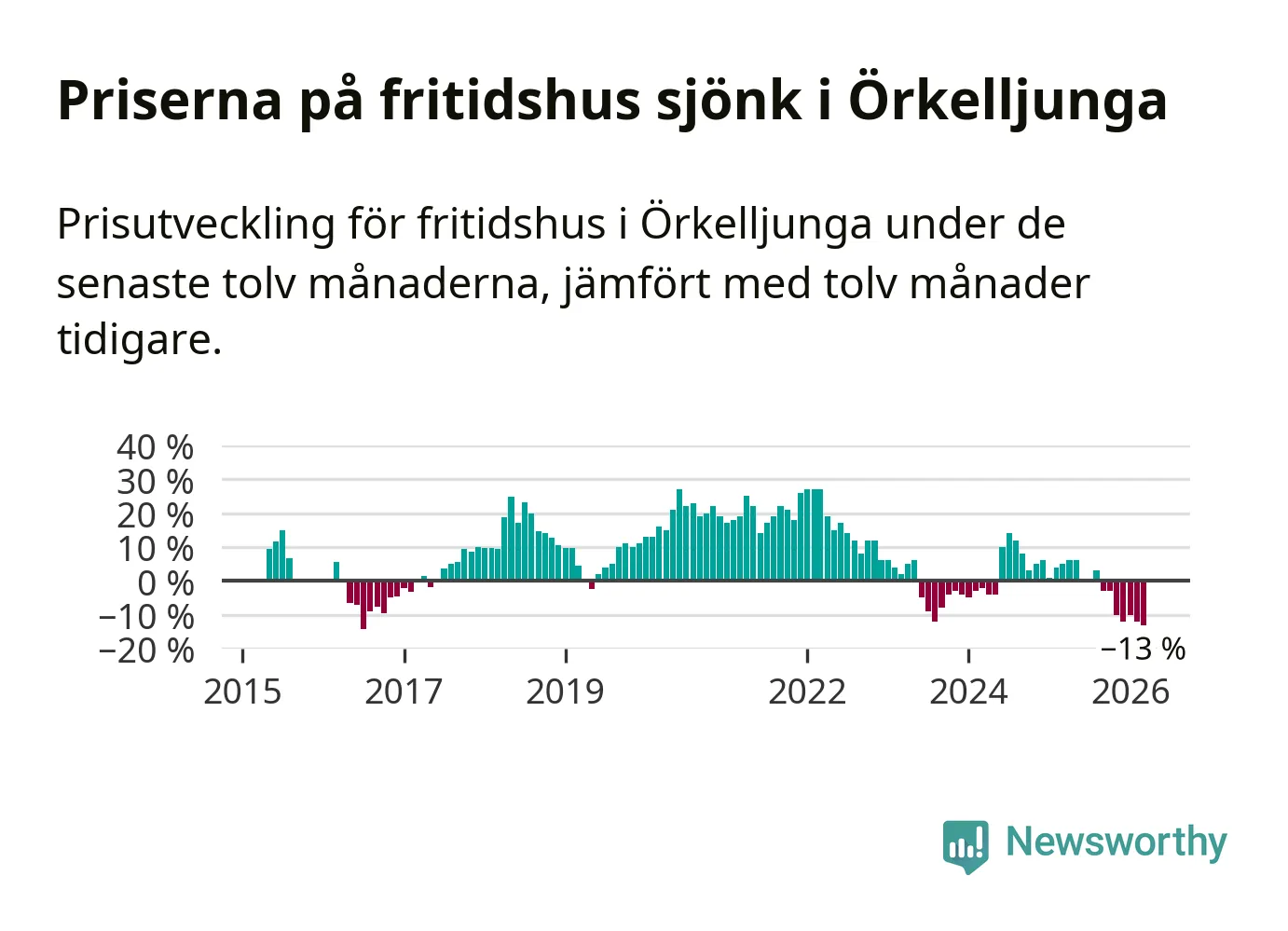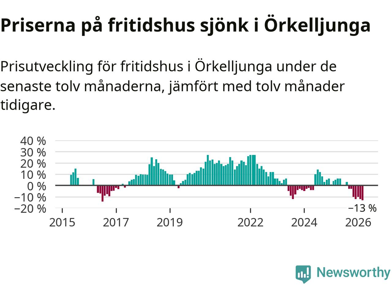 Priserna på fritidshus har gått ner i Örkelljunga kommun. Medelpriset på försäljningarna under de senaste tolv månaderna visar på en nedgång med 13 procent.