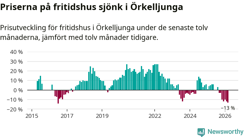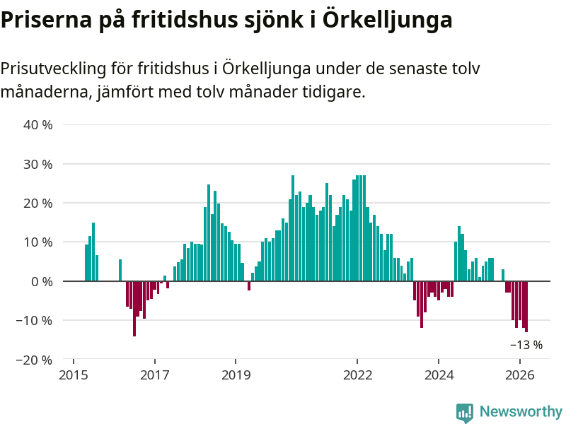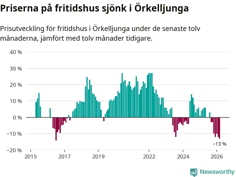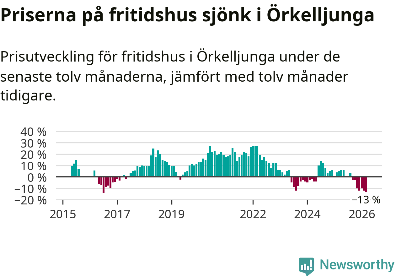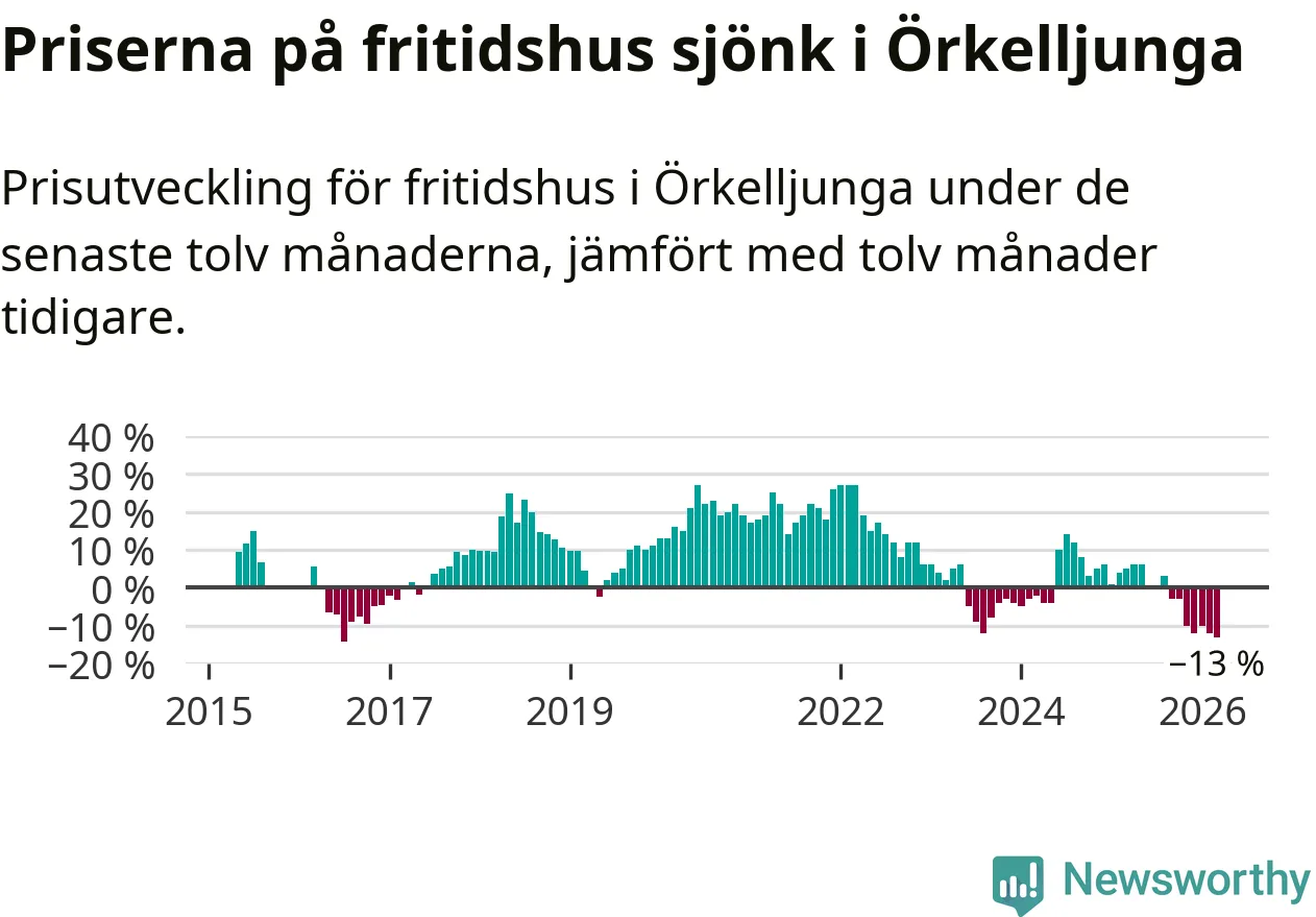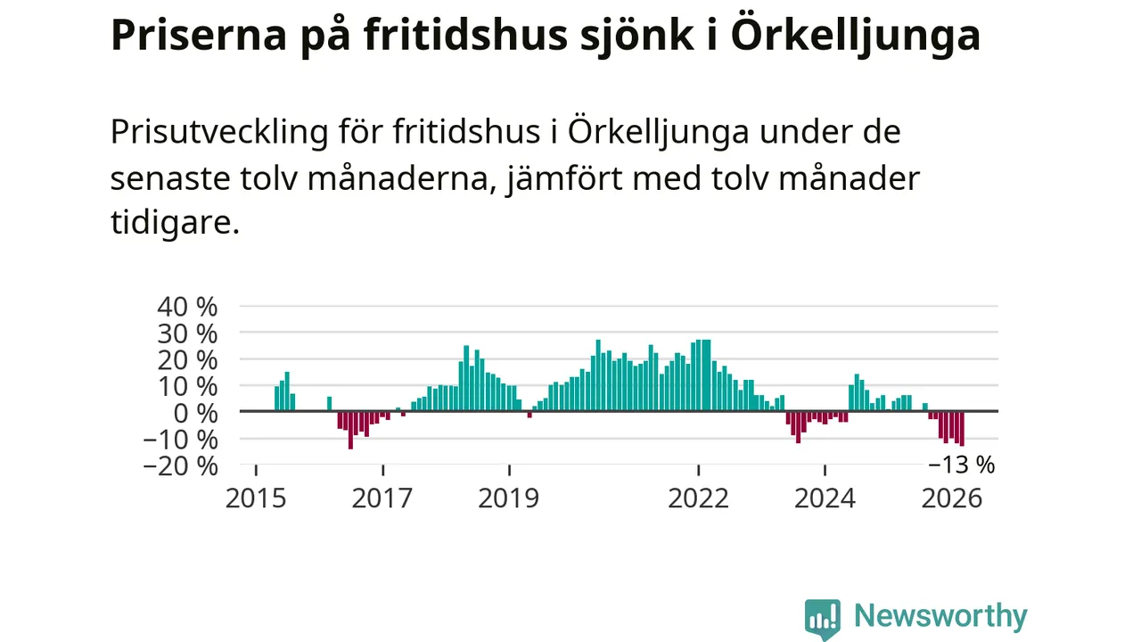 Priserna på fritidshus har gått ner i Örkelljunga kommun. Medelpriset på försäljningarna under de senaste tolv månaderna visar på en nedgång med 13 procent.