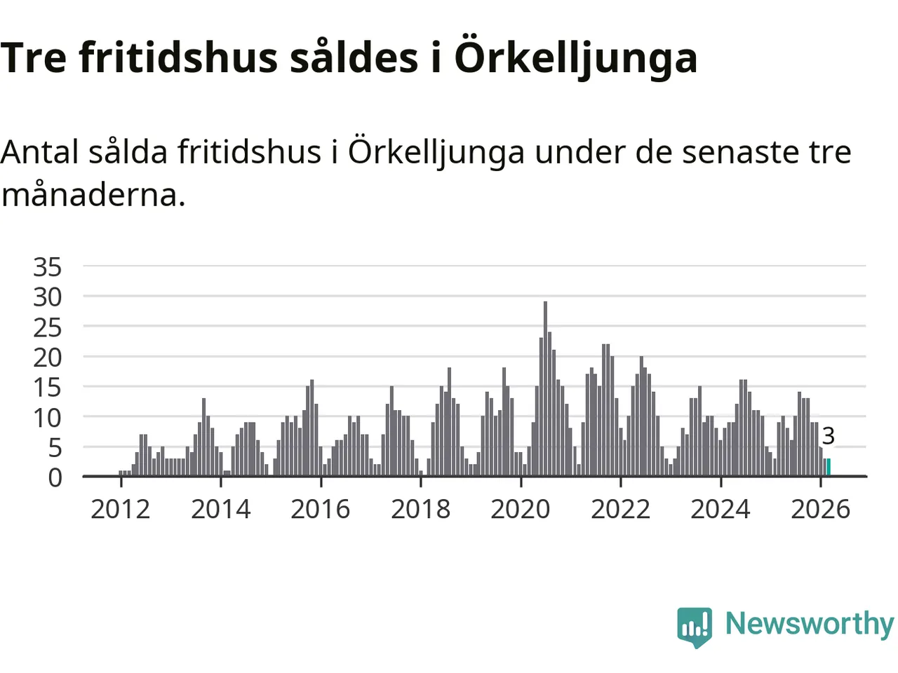 Sammanlagt såldes tre fritidshus i Örkelljunga kommun mellan januari och mars till ett genomsnittligt pris på 1,1 miljoner kronor. I fjol gjordes nio affärer vid den här tiden på året.