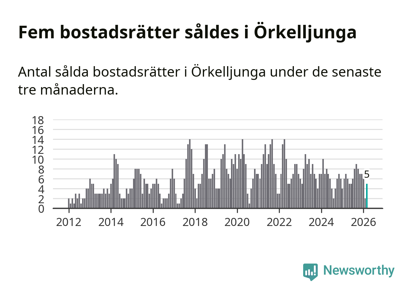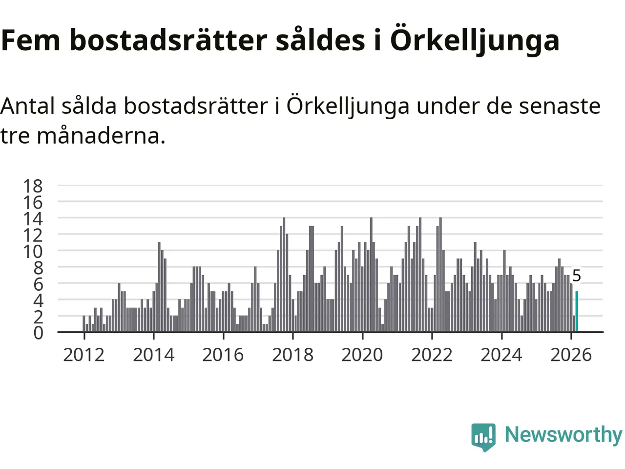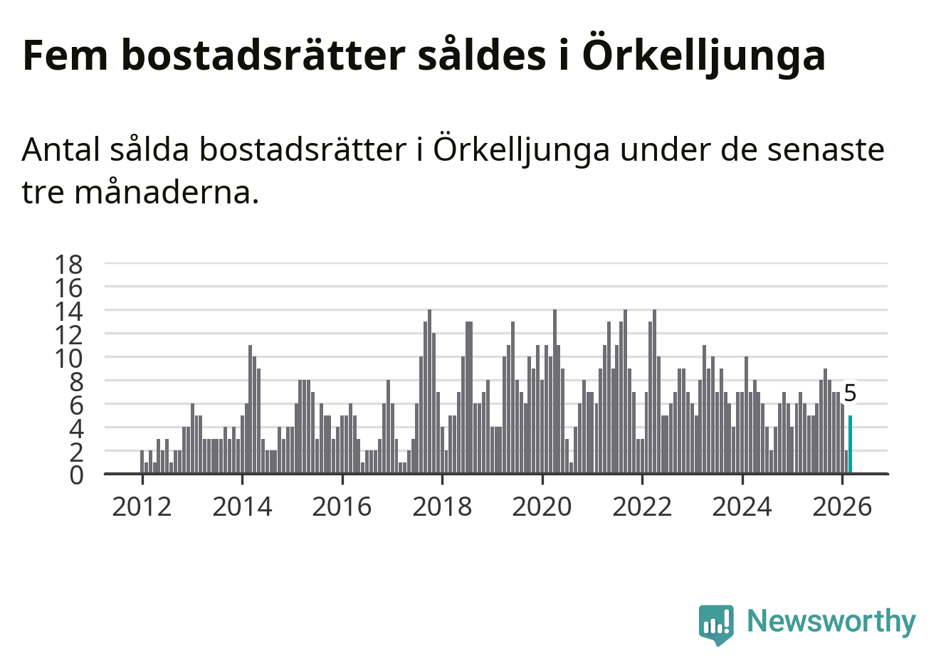 Mellan januari och mars gjordes sammanlagt fem affärer med bostadsrätter i Örkelljunga kommun. Det kan jämföras med sju vid motsvarande tid i fjol.