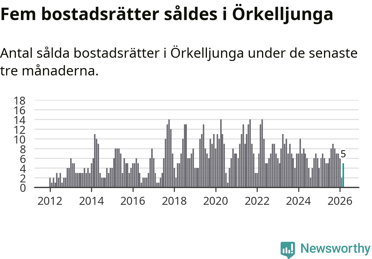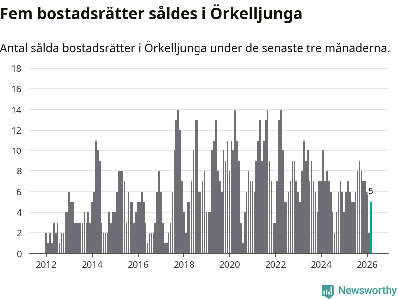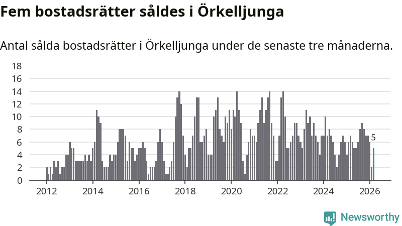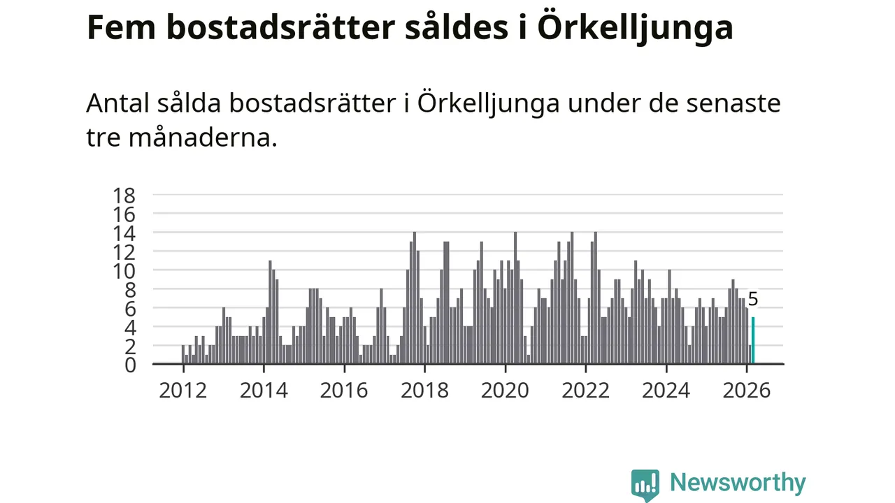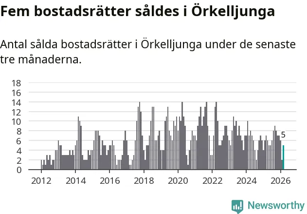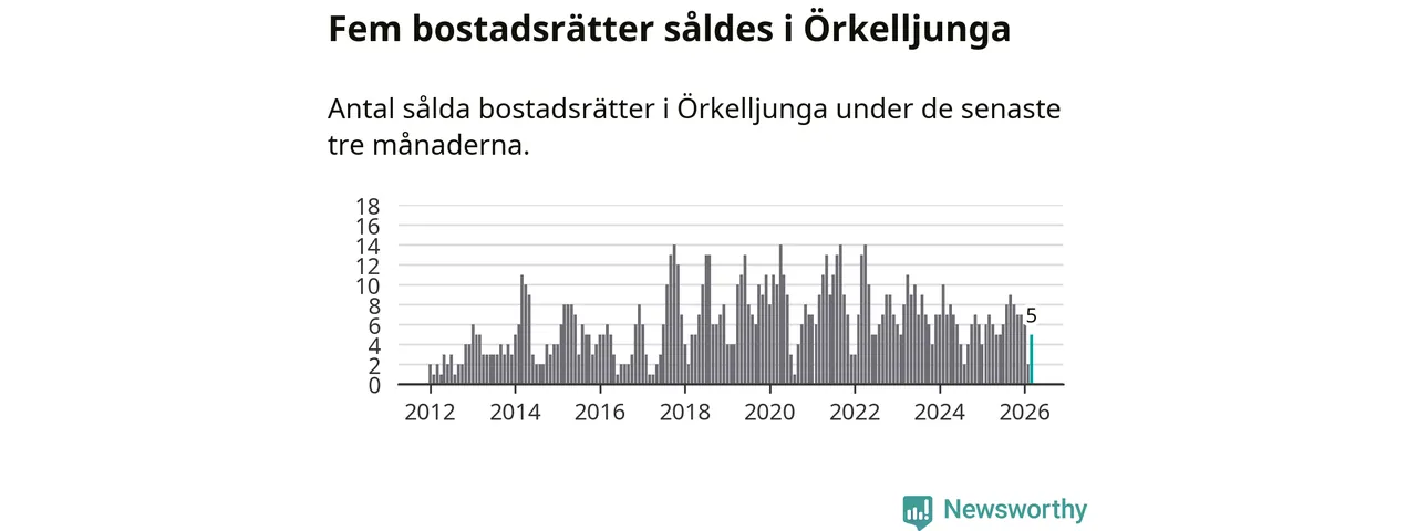 Mellan januari och mars gjordes sammanlagt fem affärer med bostadsrätter i Örkelljunga kommun. Det kan jämföras med sju vid motsvarande tid i fjol.
