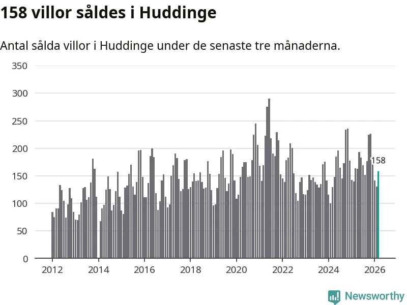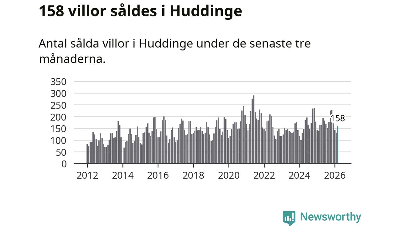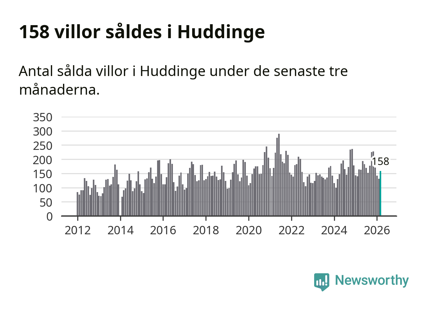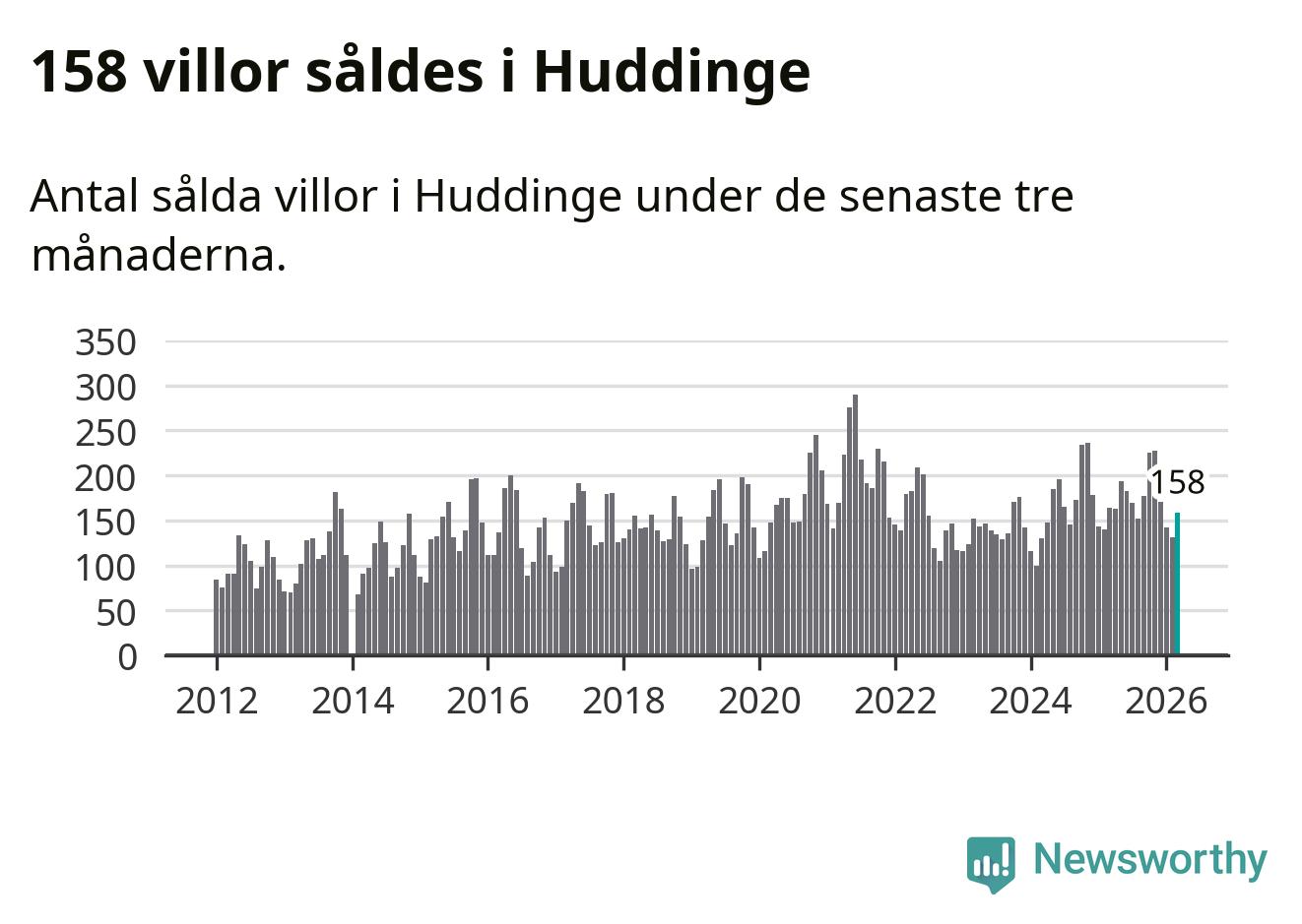Sammanlagt såldes 158 villor i Huddinge kommun mellan januari och mars till ett genomsnittligt pris på 6,8 miljoner kronor. I fjol gjordes 164 affärer vid den här tiden på året.