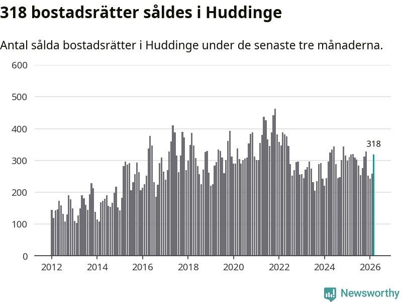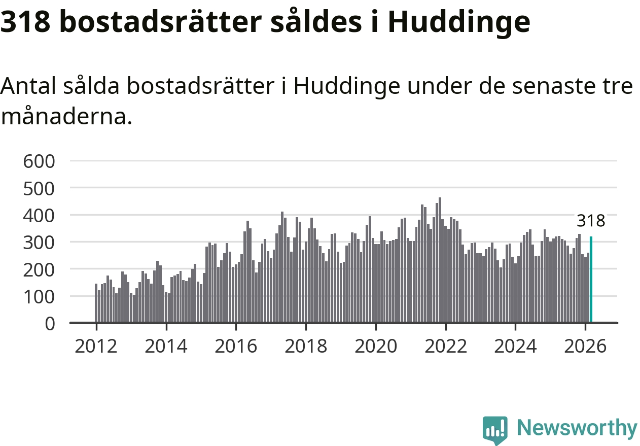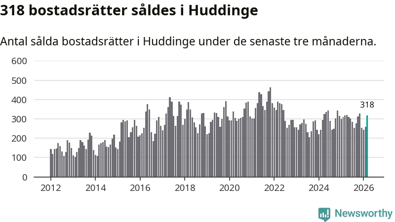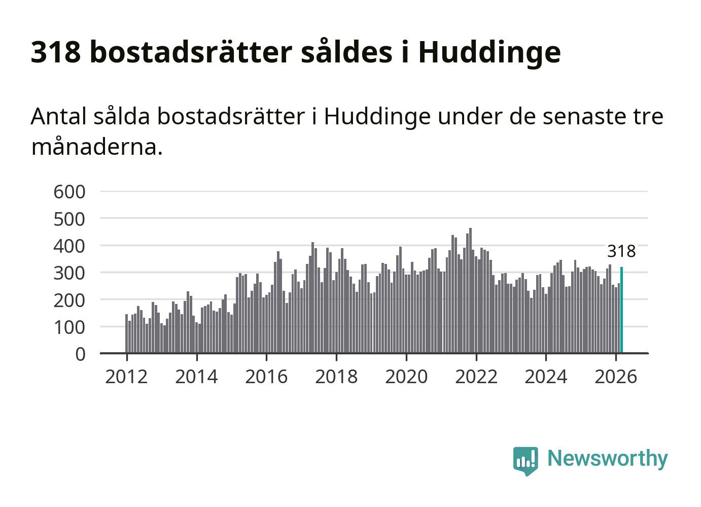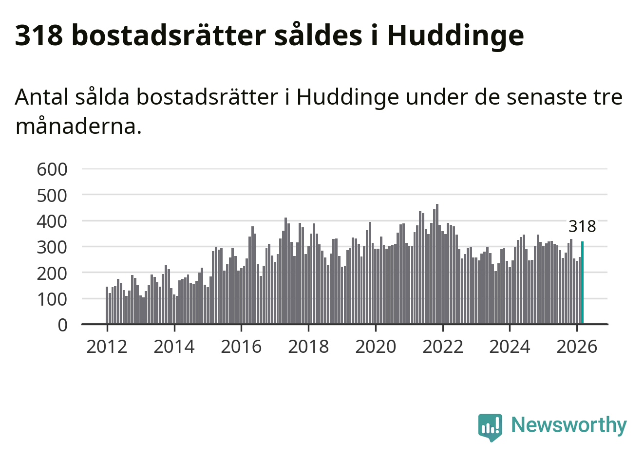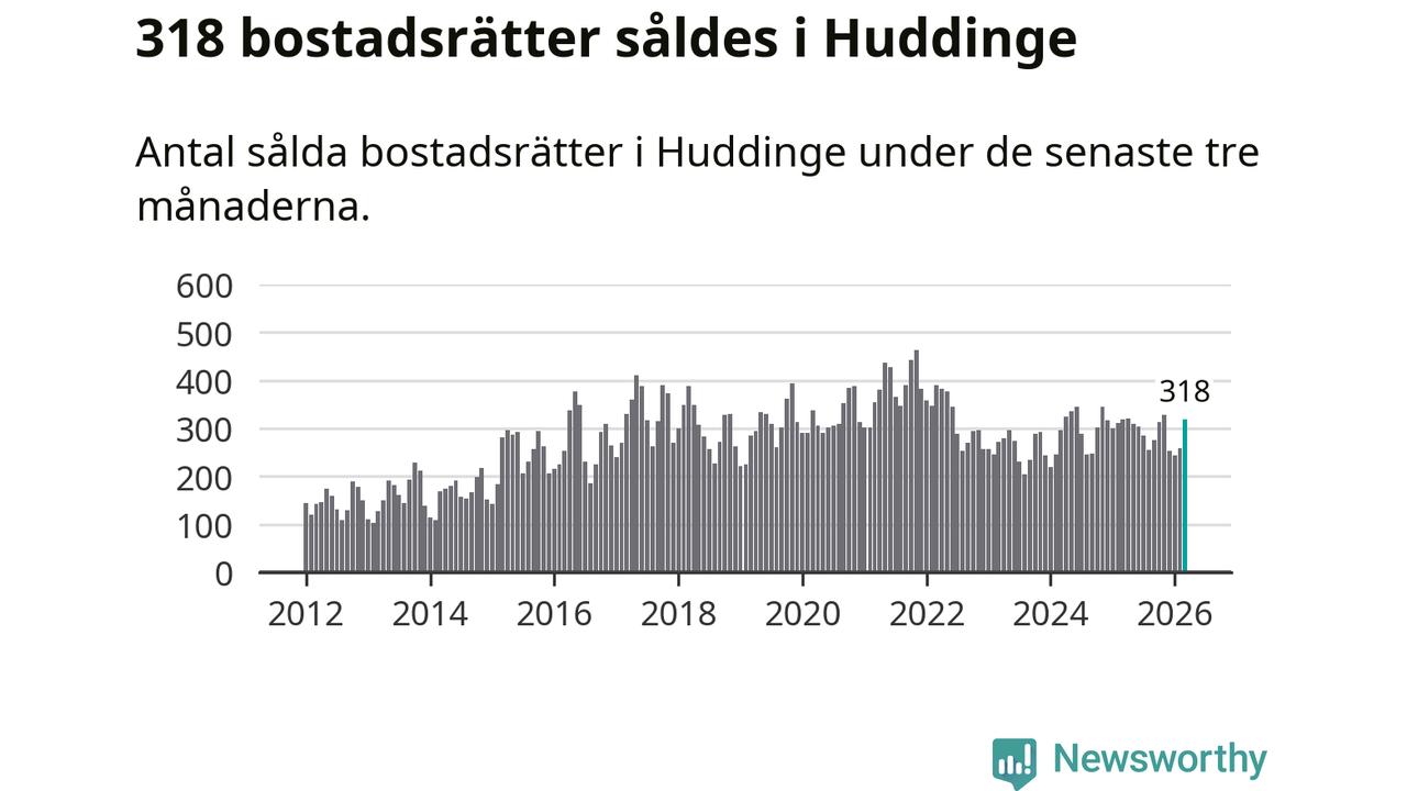 Sammanlagt såldes 318 bostadsrätter i Huddinge kommun mellan januari och mars till ett genomsnittligt pris på 2,8 miljoner kronor. I fjol gjordes 319 affärer vid den här tiden på året.