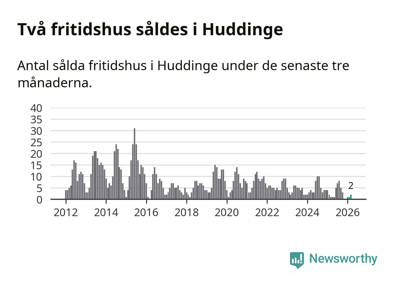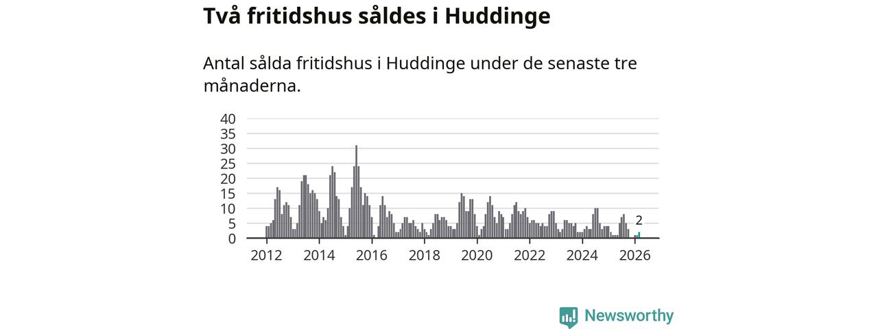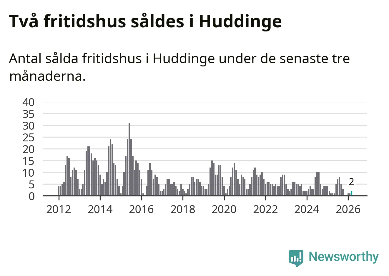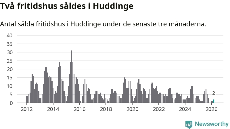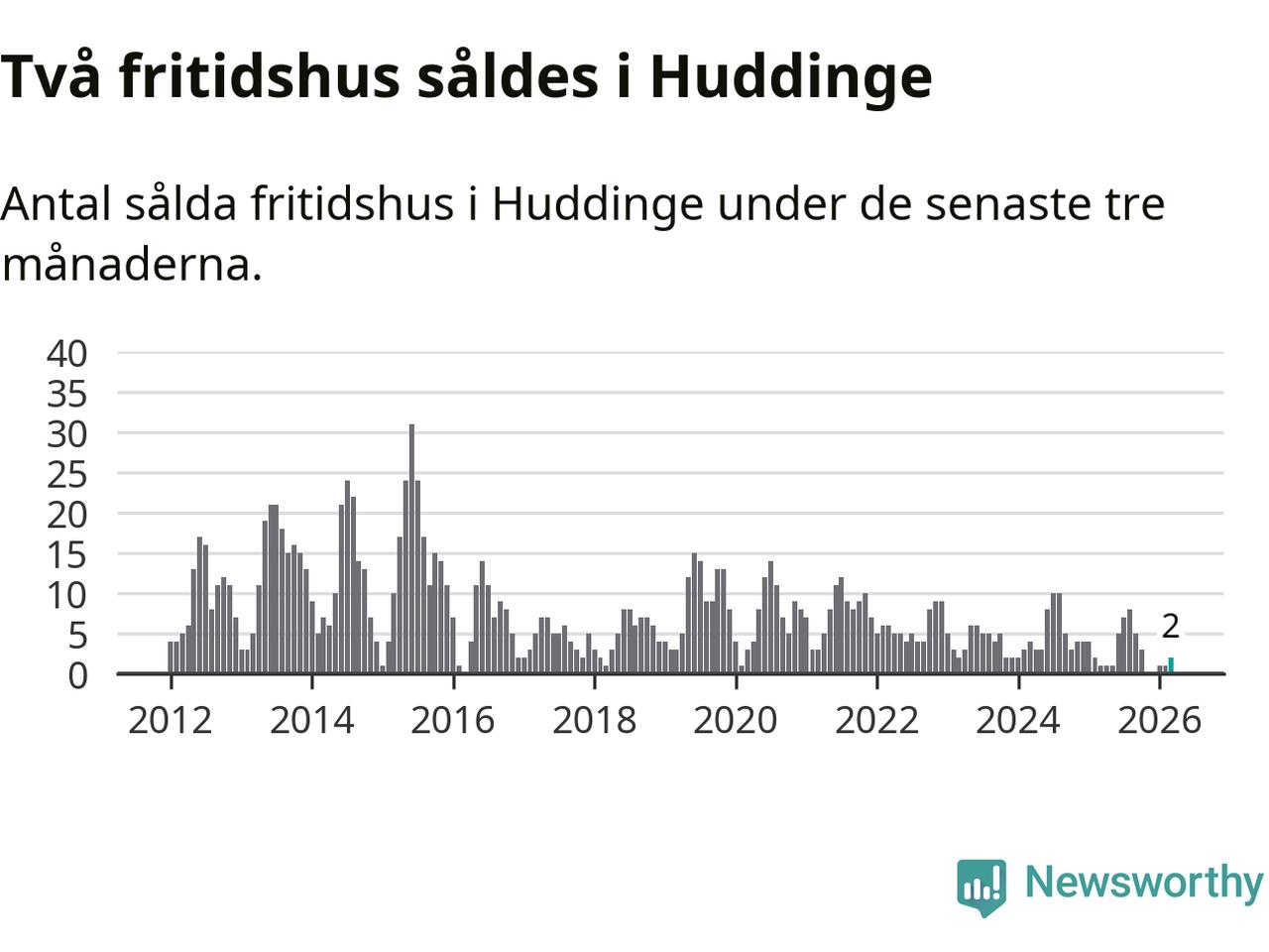 Mellan januari och mars gjordes sammanlagt två affärer med fritidshus i Huddinge kommun. Det kan jämföras med ett vid motsvarande tid i fjol.