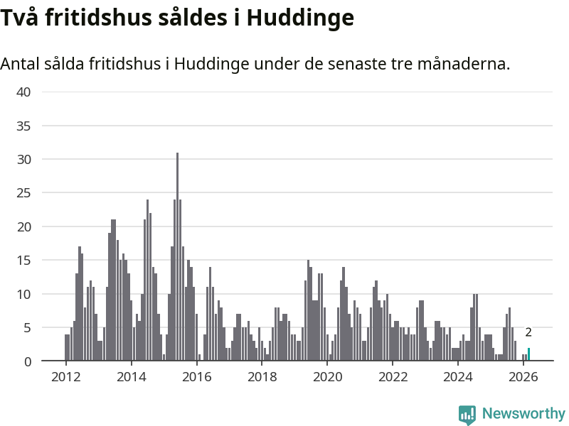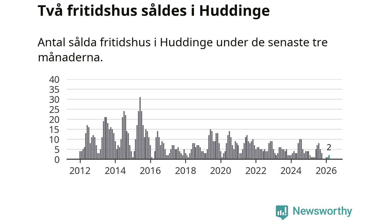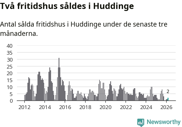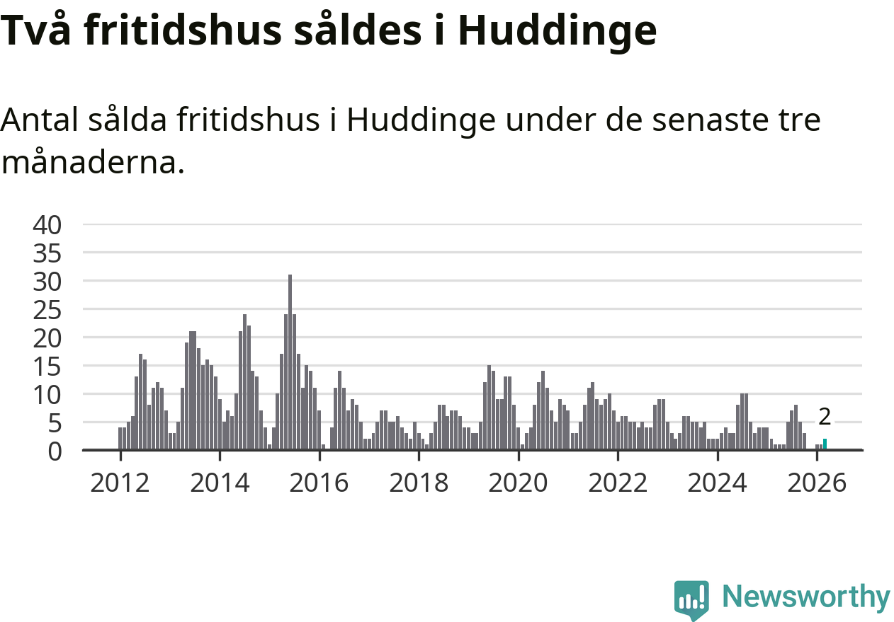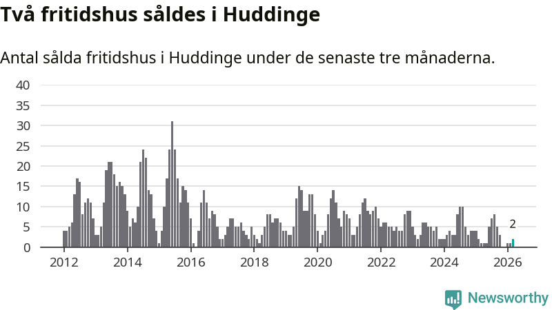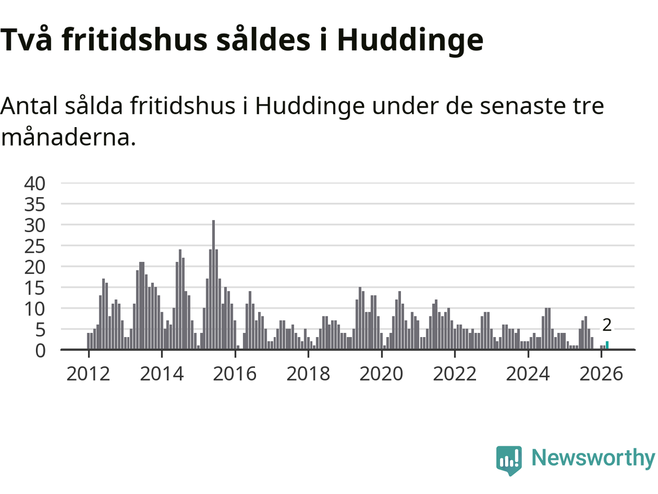 Mellan januari och mars gjordes sammanlagt två affärer med fritidshus i Huddinge kommun. Det kan jämföras med ett vid motsvarande tid i fjol.