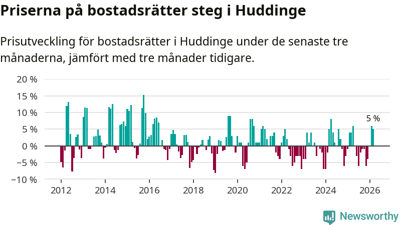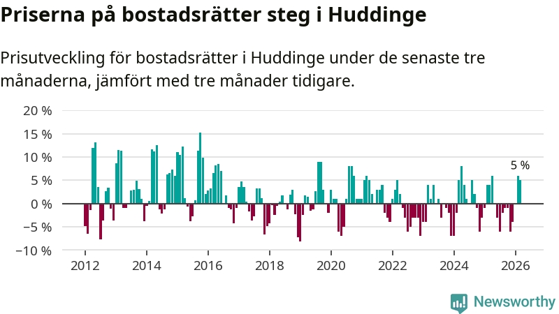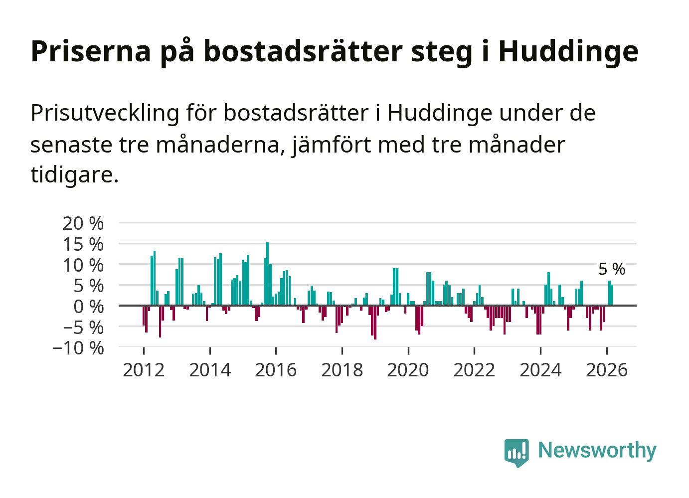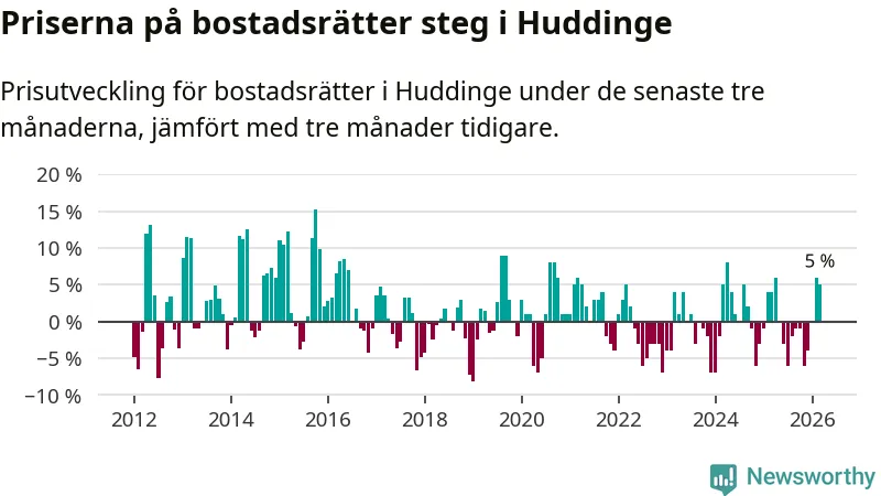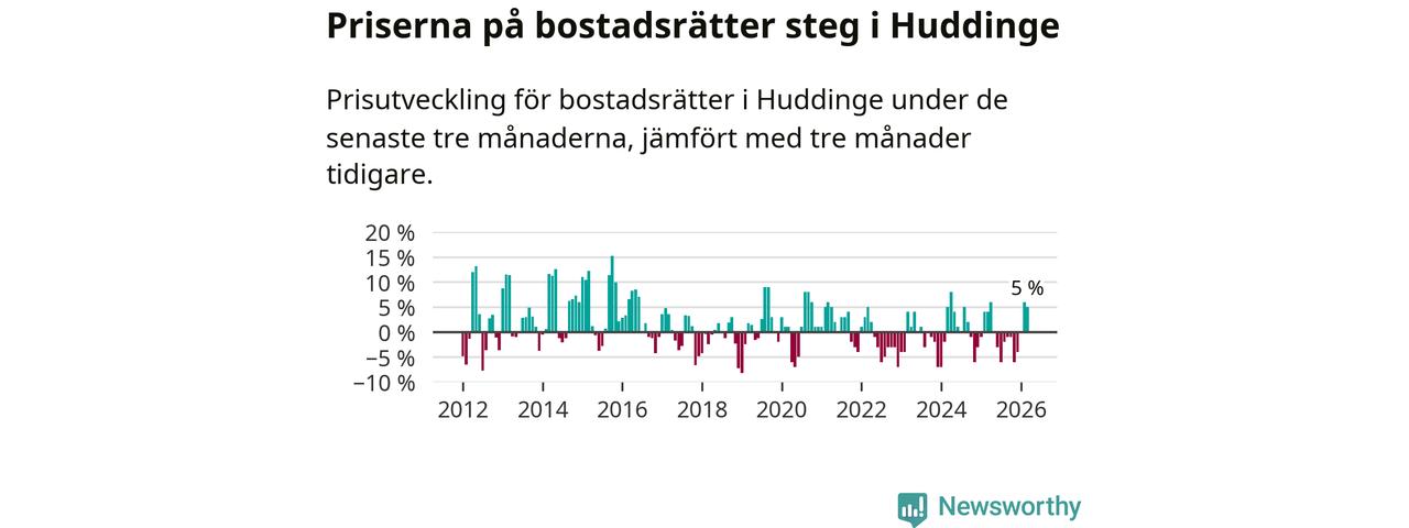 Priserna på bostadsrätter har gått upp i Huddinge kommun. Medelpriset på försäljningarna under de senaste tre månaderna visar på en uppgång med 5 procent.