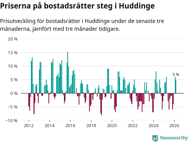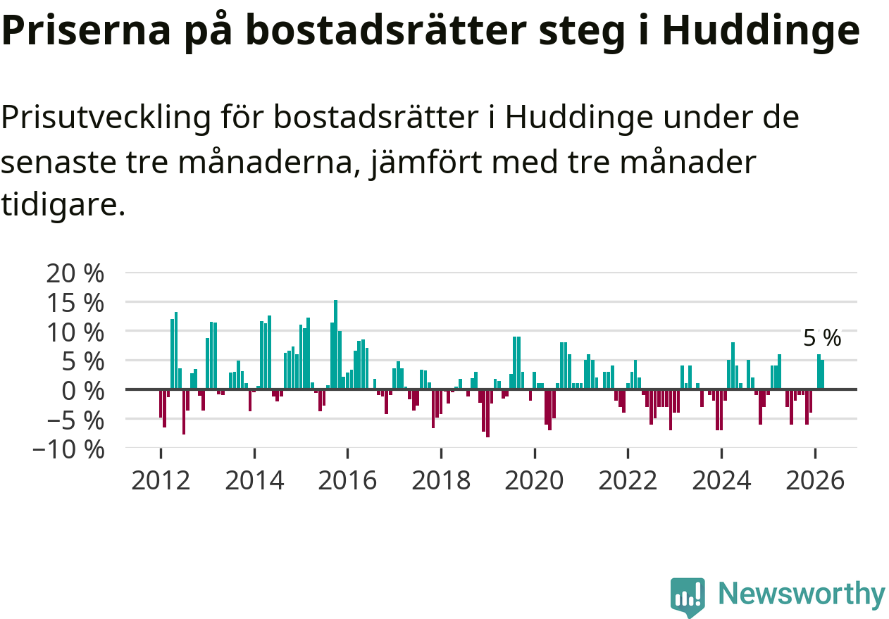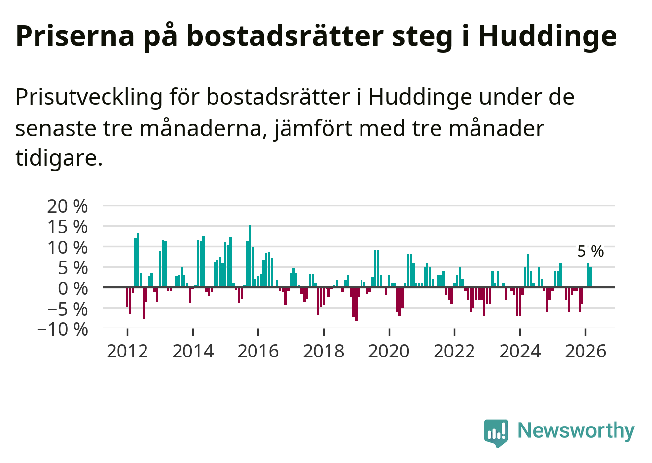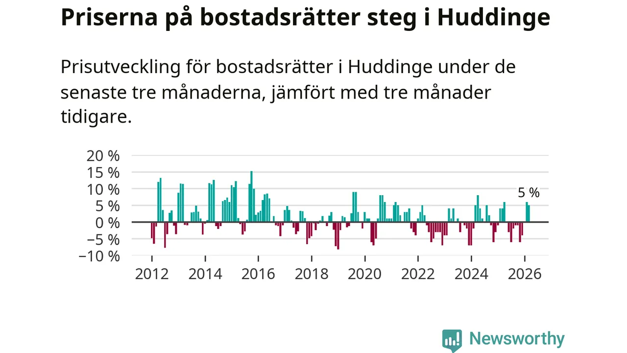 Priserna på bostadsrätter har gått upp i Huddinge kommun. Medelpriset på försäljningarna under de senaste tre månaderna visar på en uppgång med 5 procent.