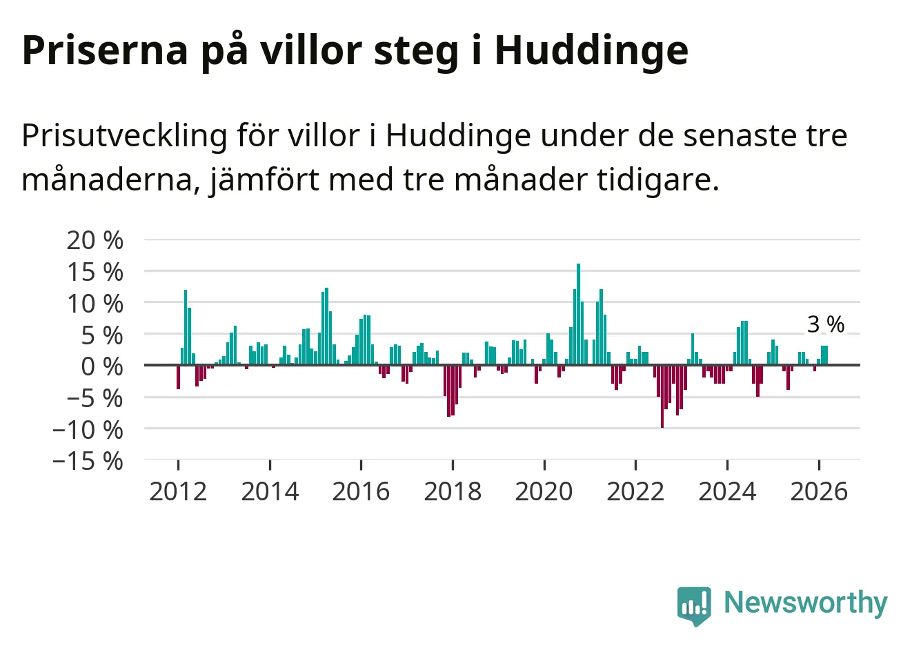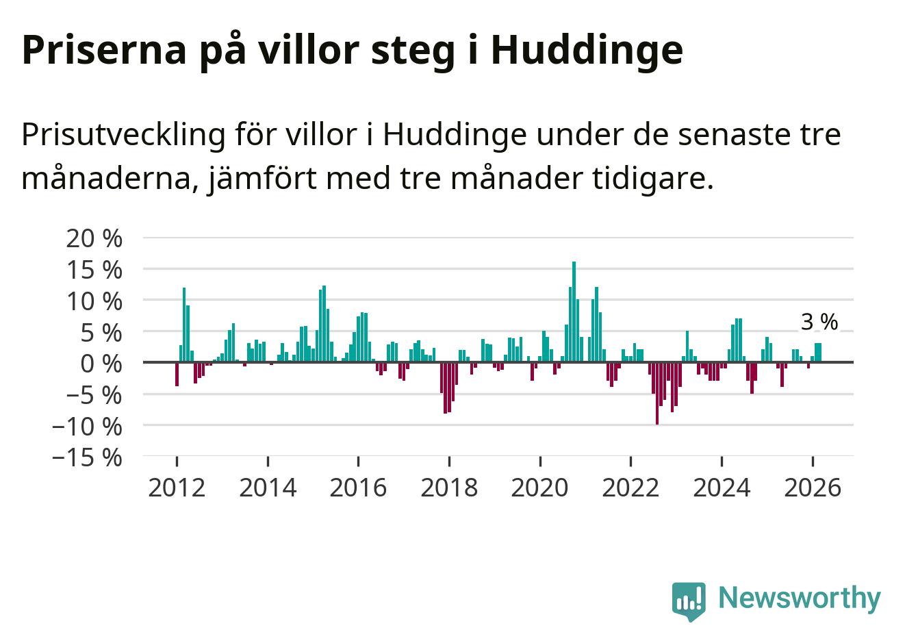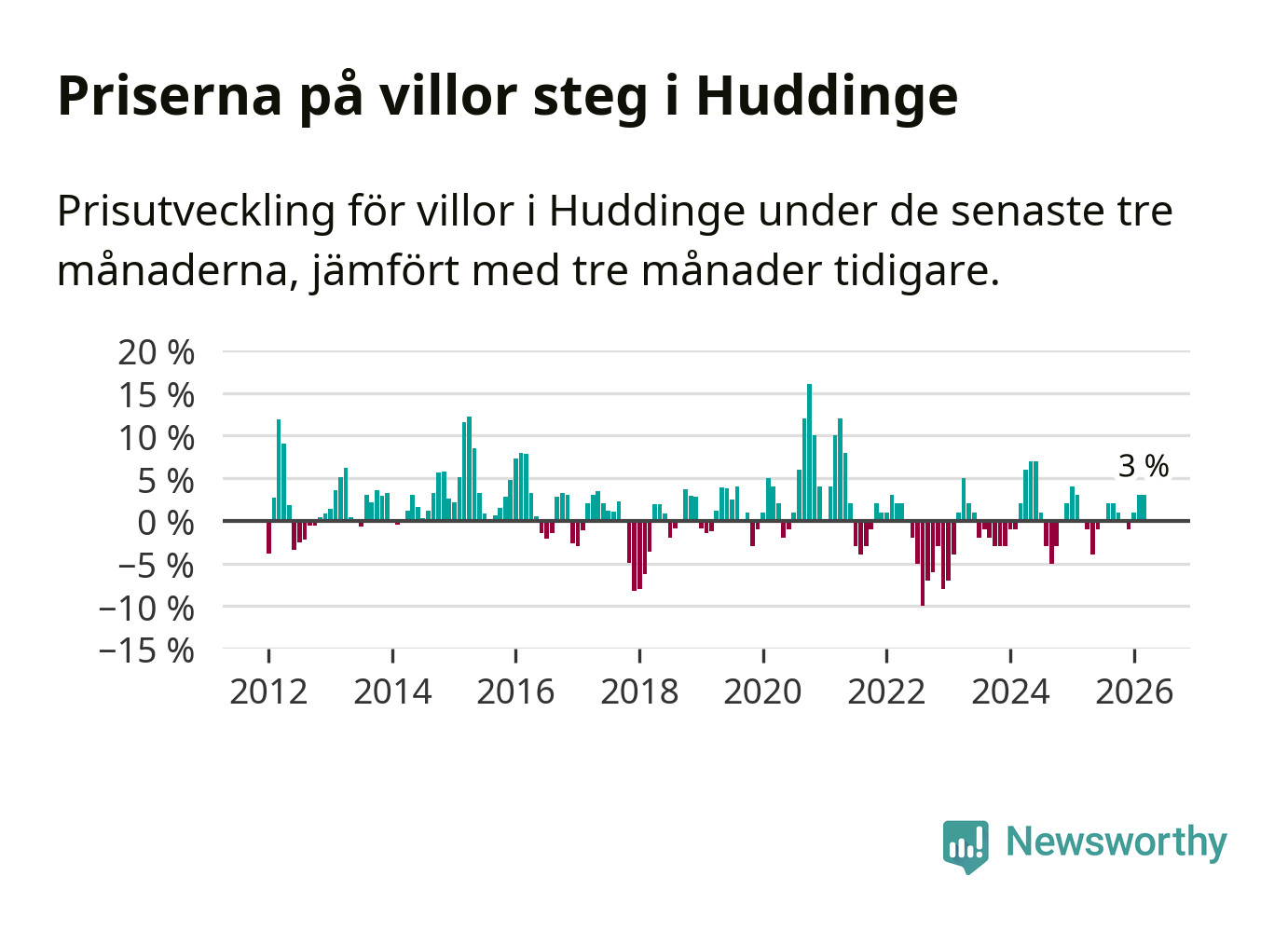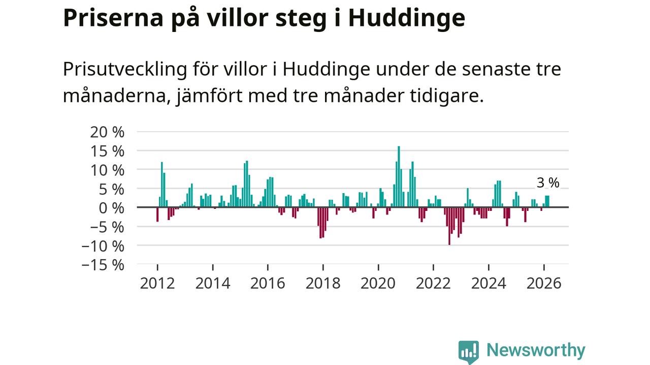 Villapriserna har gått upp i Huddinge kommun. Medelpriset på försäljningarna under de senaste tre månaderna visar på en uppgång med 3 procent.