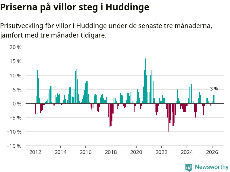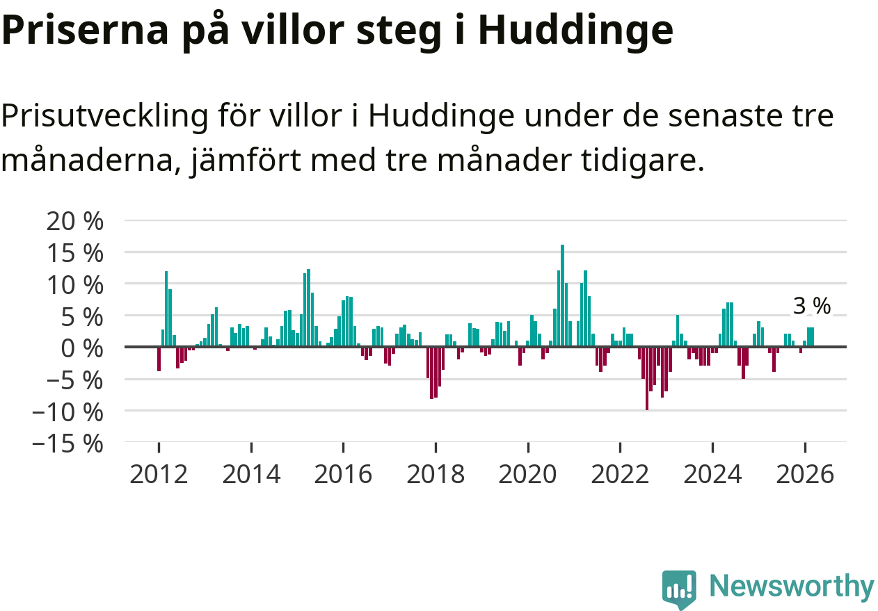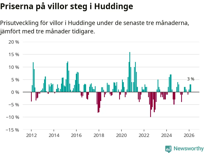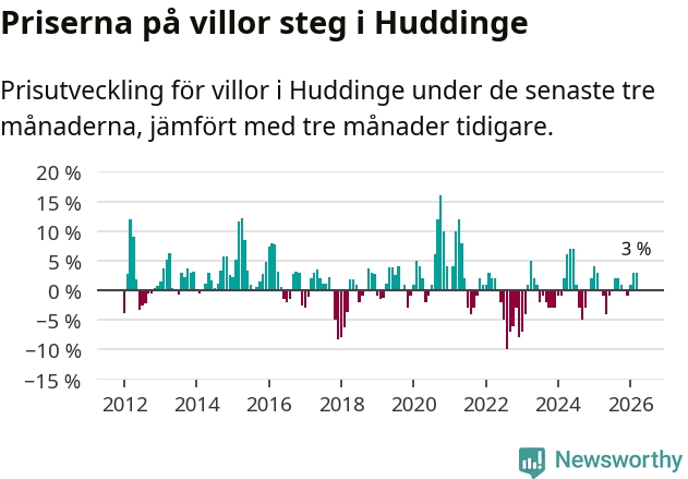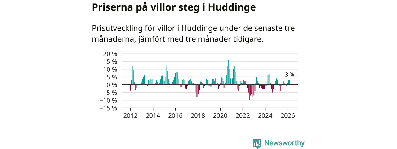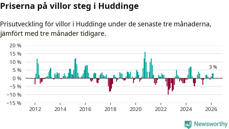 Villapriserna har gått upp i Huddinge kommun. Medelpriset på försäljningarna under de senaste tre månaderna visar på en uppgång med 3 procent.