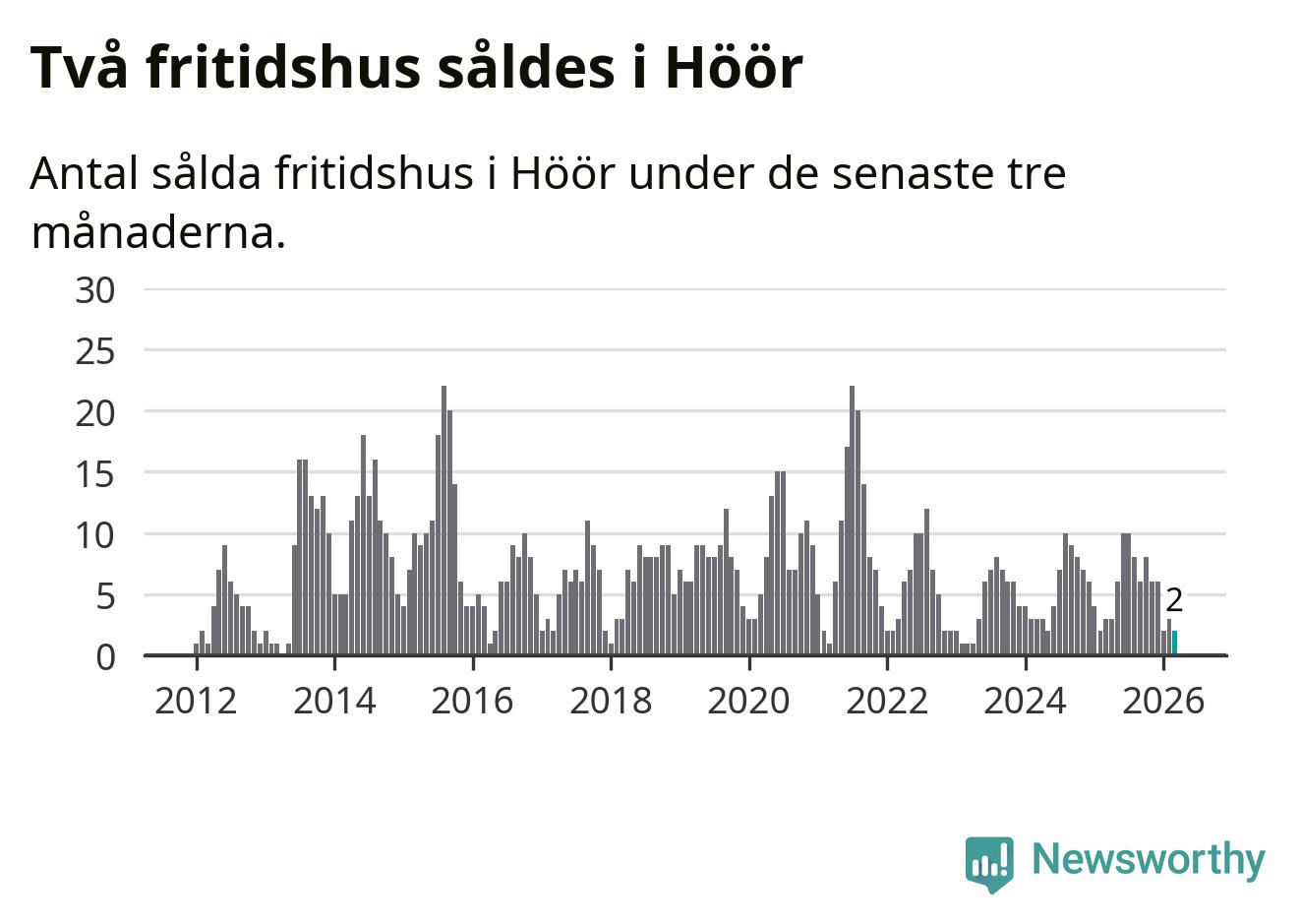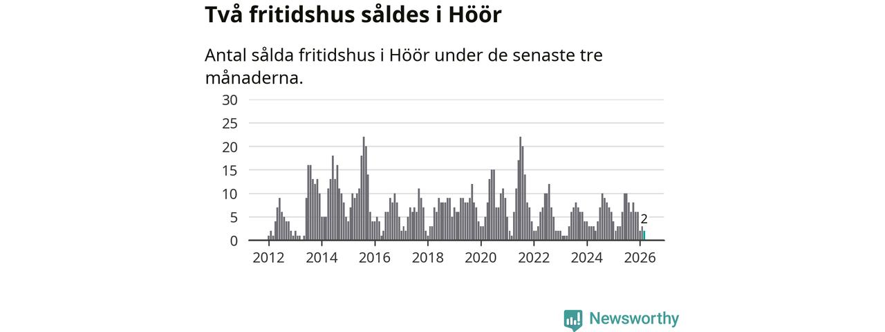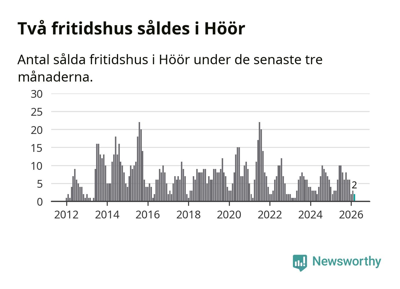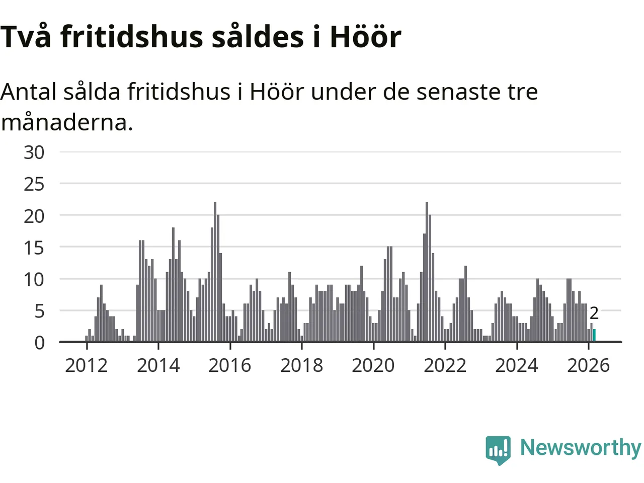 Mellan januari och mars gjordes sammanlagt två affärer med fritidshus i Höörs kommun. Det kan jämföras med tre vid motsvarande tid i fjol.