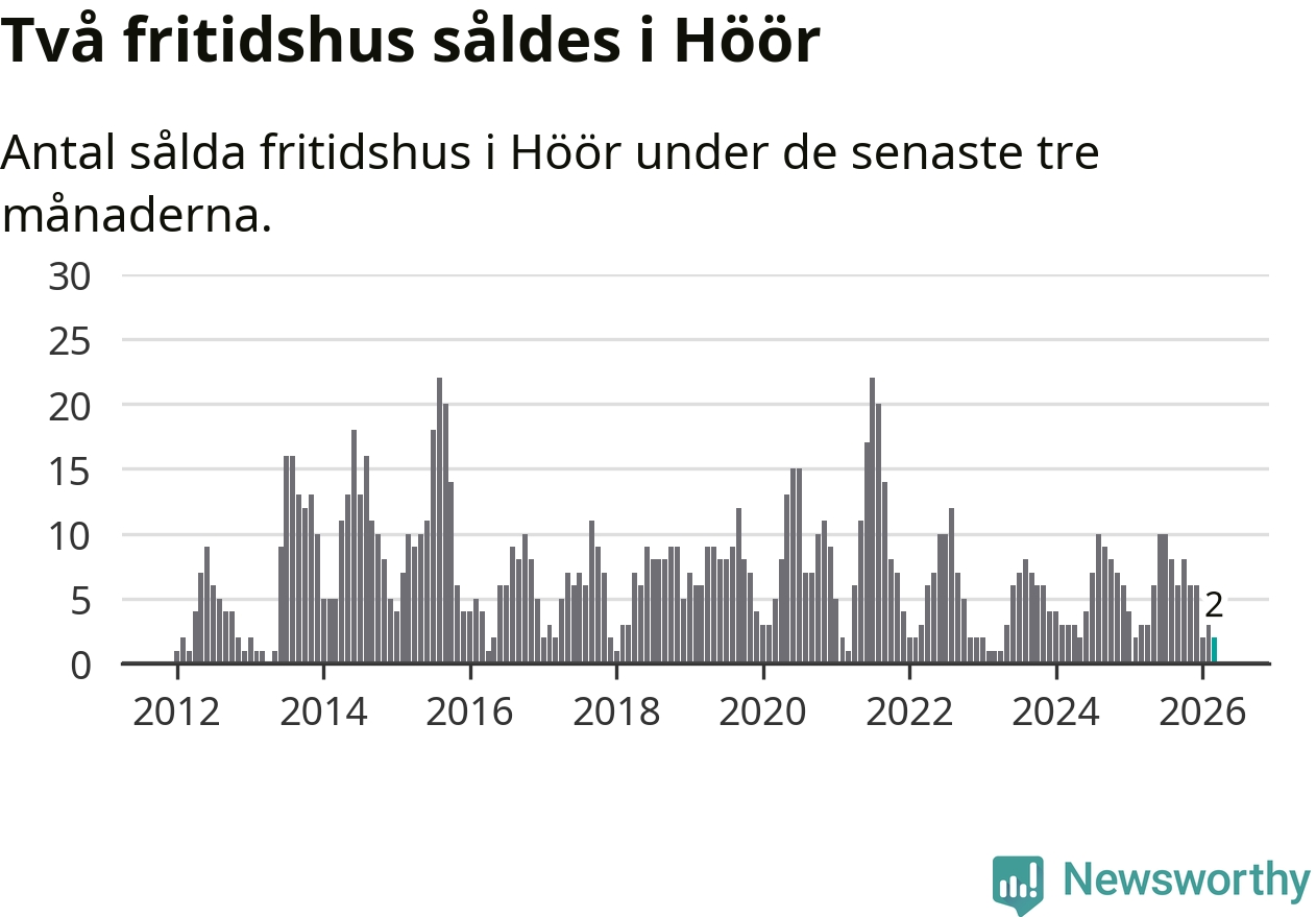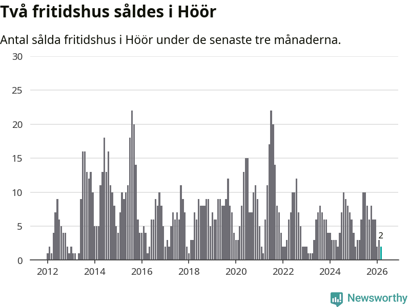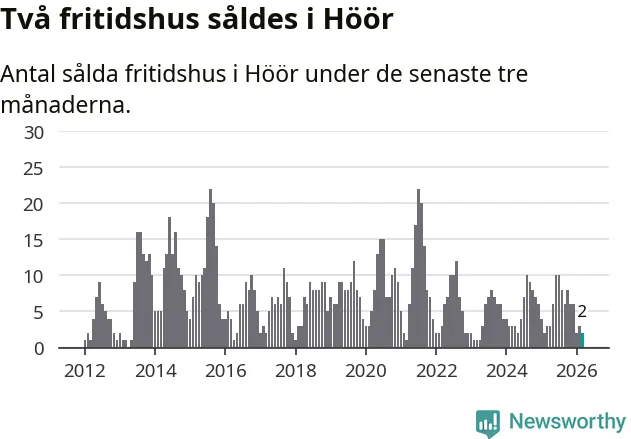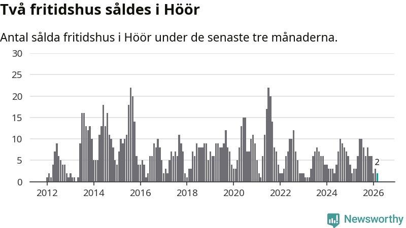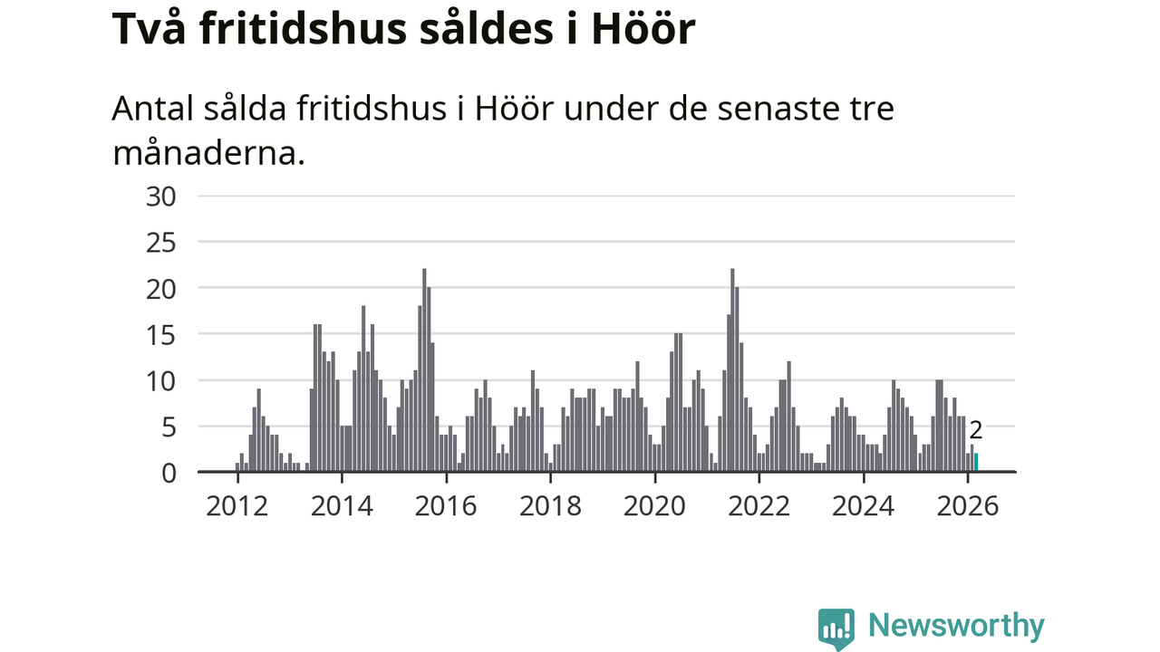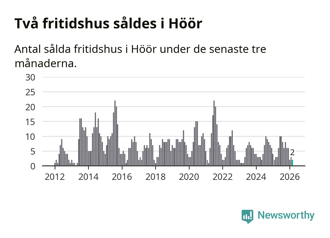 Mellan januari och mars gjordes sammanlagt två affärer med fritidshus i Höörs kommun. Det kan jämföras med tre vid motsvarande tid i fjol.