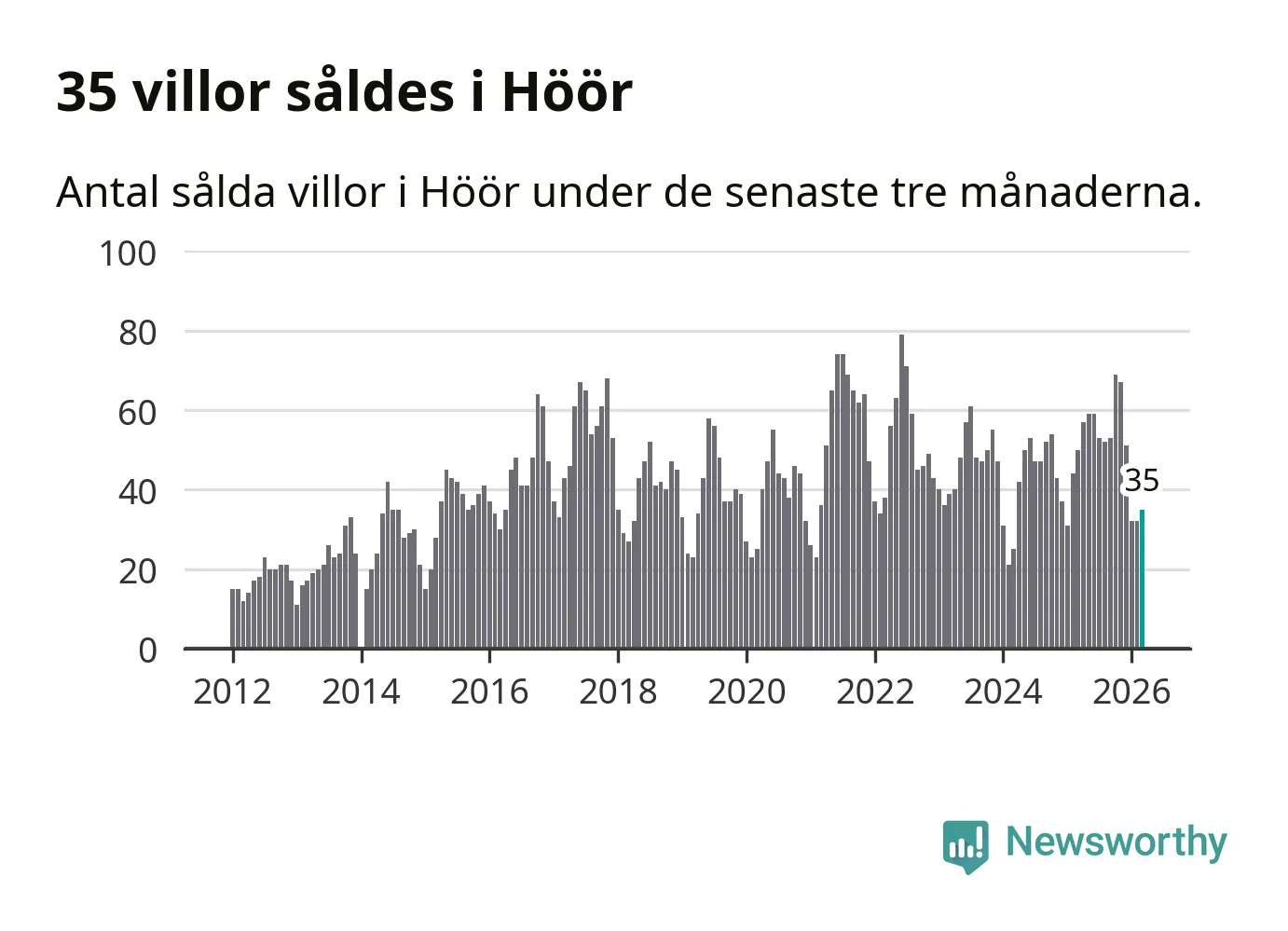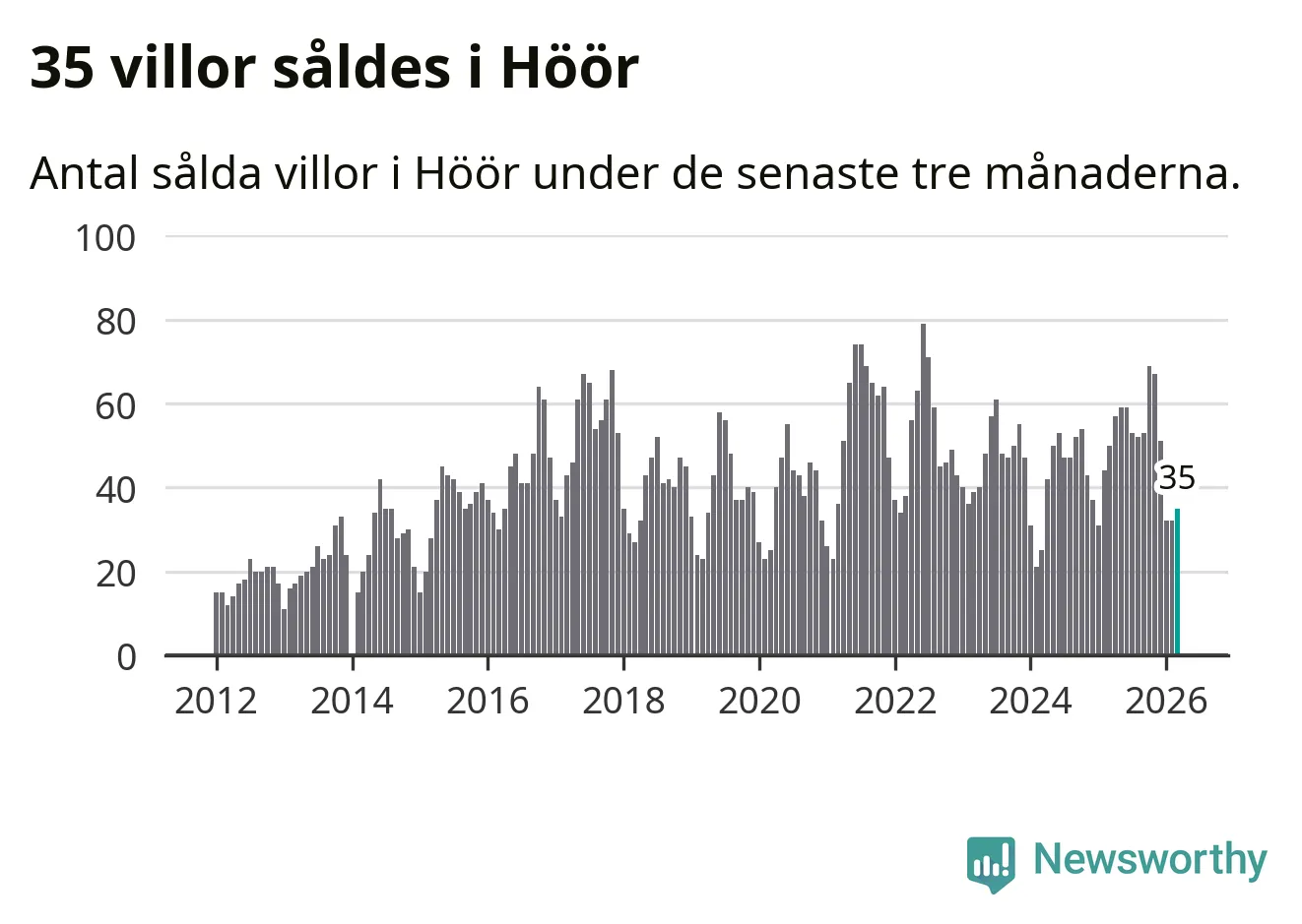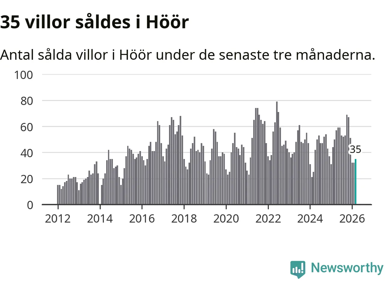 Sammanlagt såldes 35 villor i Höörs kommun mellan januari och mars till ett genomsnittligt pris på 2,7 miljoner kronor. I fjol gjordes 50 affärer vid den här tiden på året.