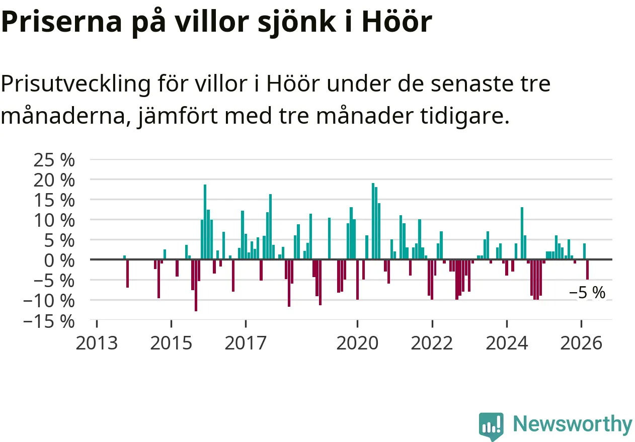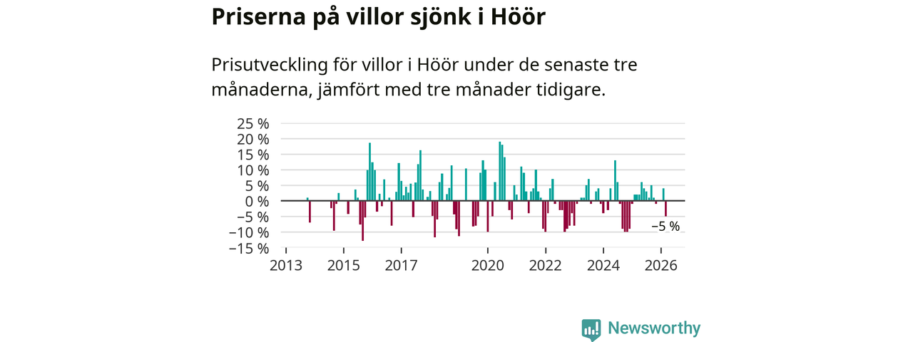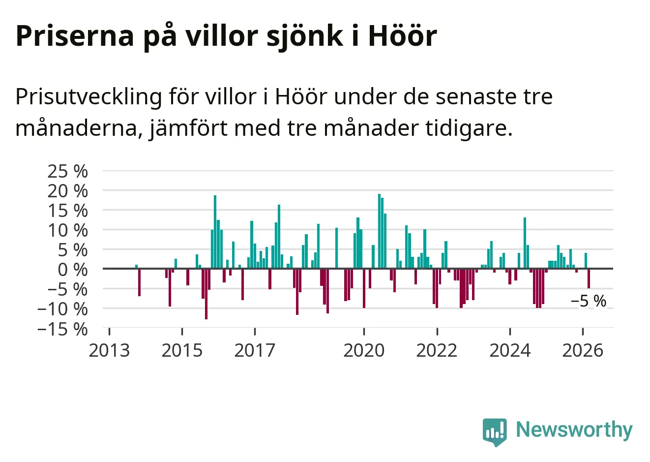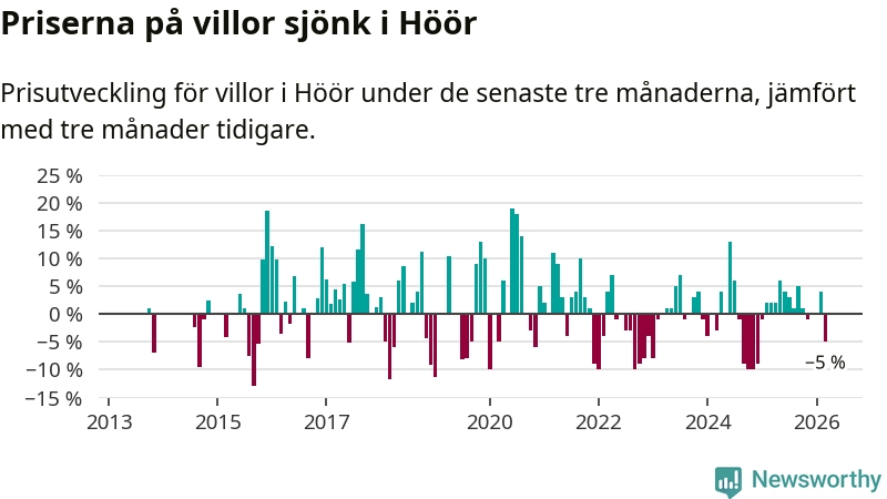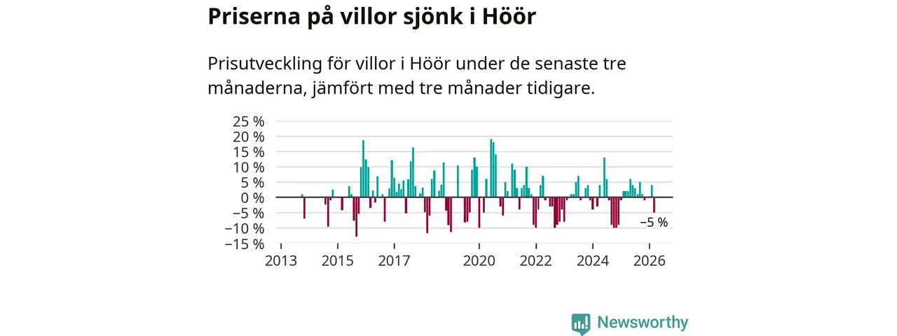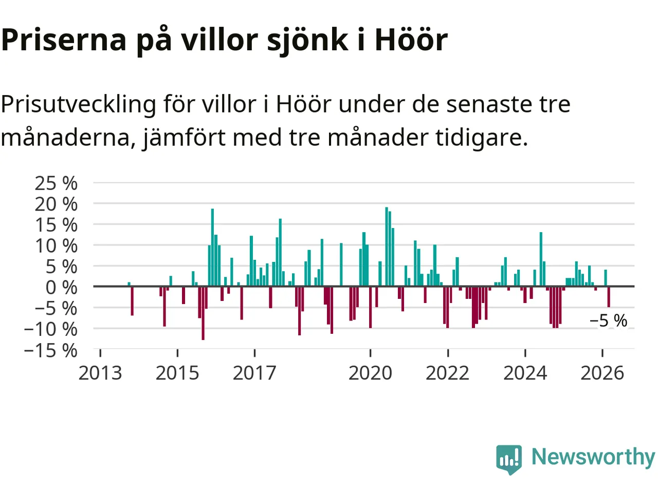 Villapriserna har gått ner i Höörs kommun. Medelpriset på försäljningarna under de senaste tre månaderna visar på en nedgång med 5 procent.