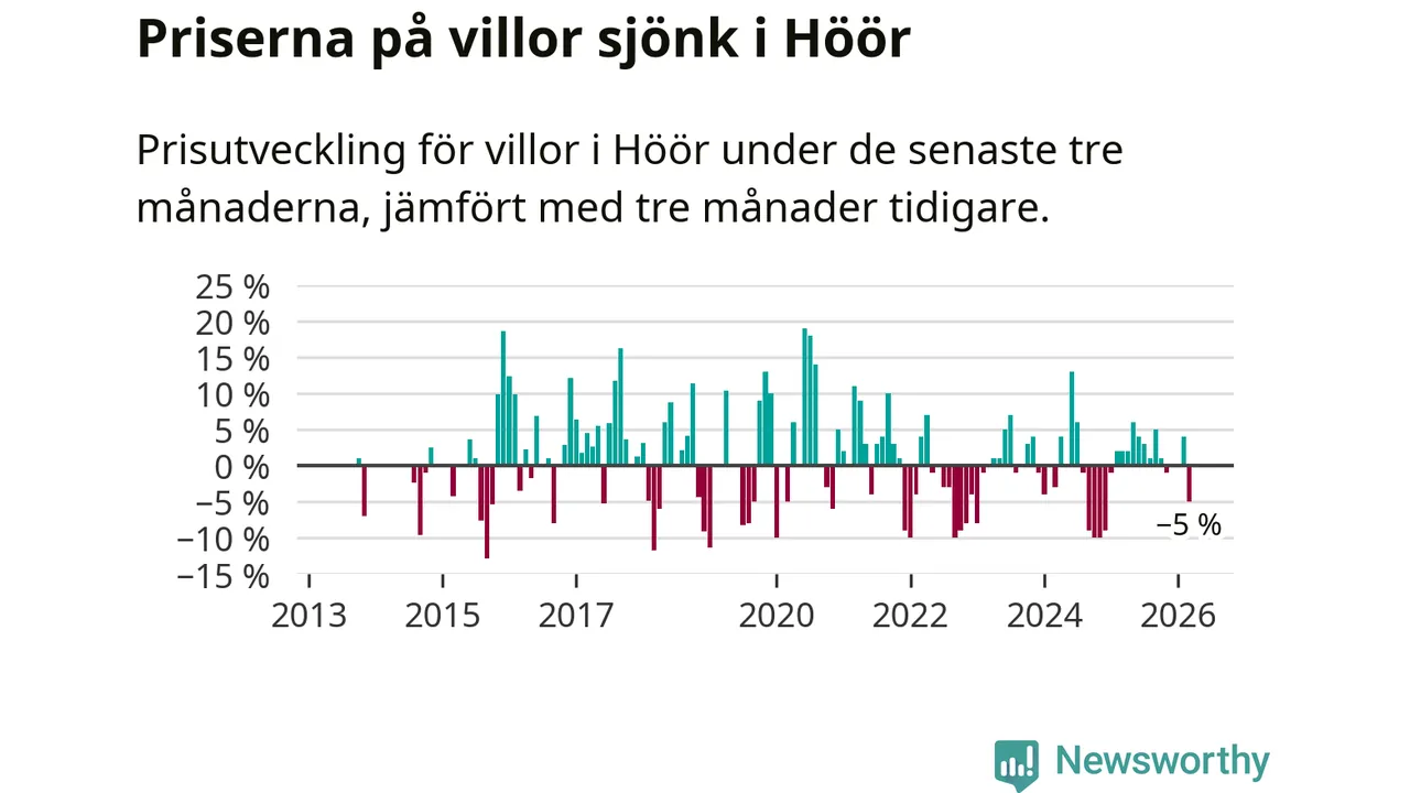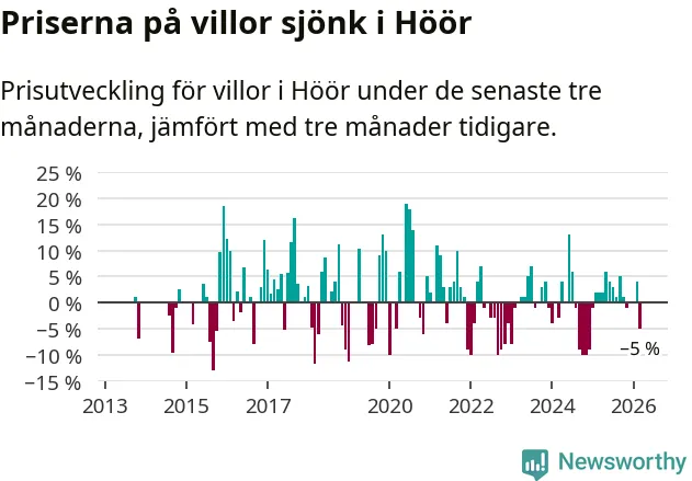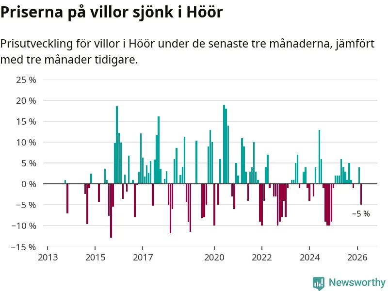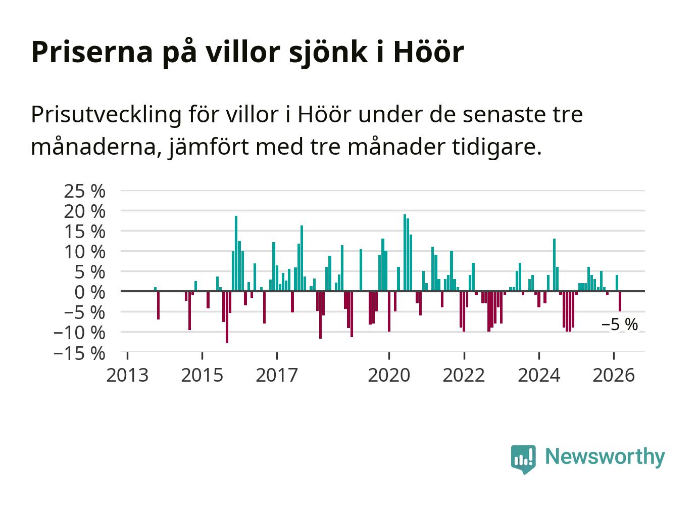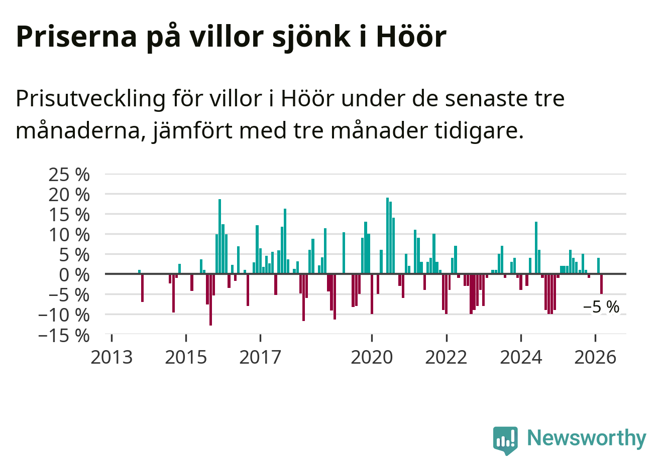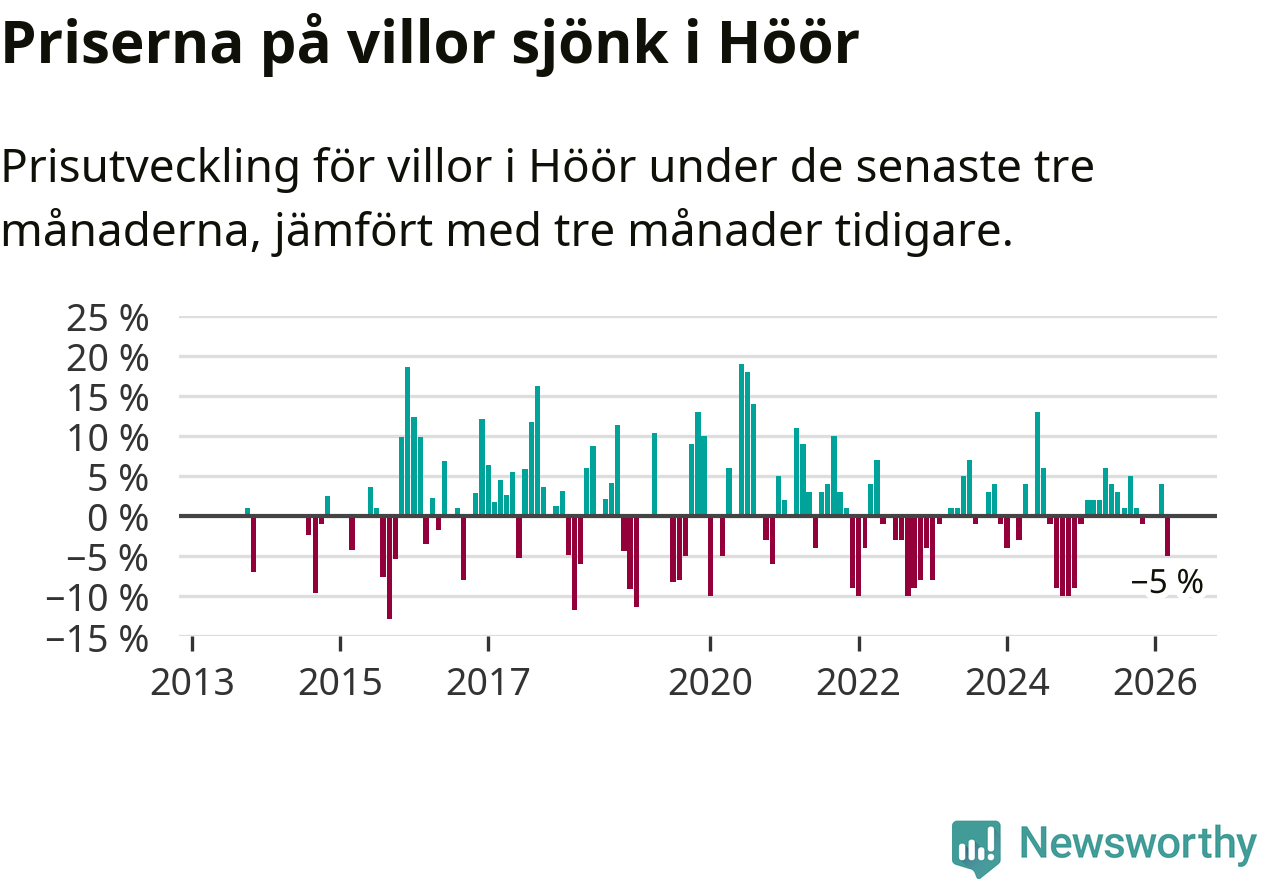 Villapriserna har gått ner i Höörs kommun. Medelpriset på försäljningarna under de senaste tre månaderna visar på en nedgång med 5 procent.
