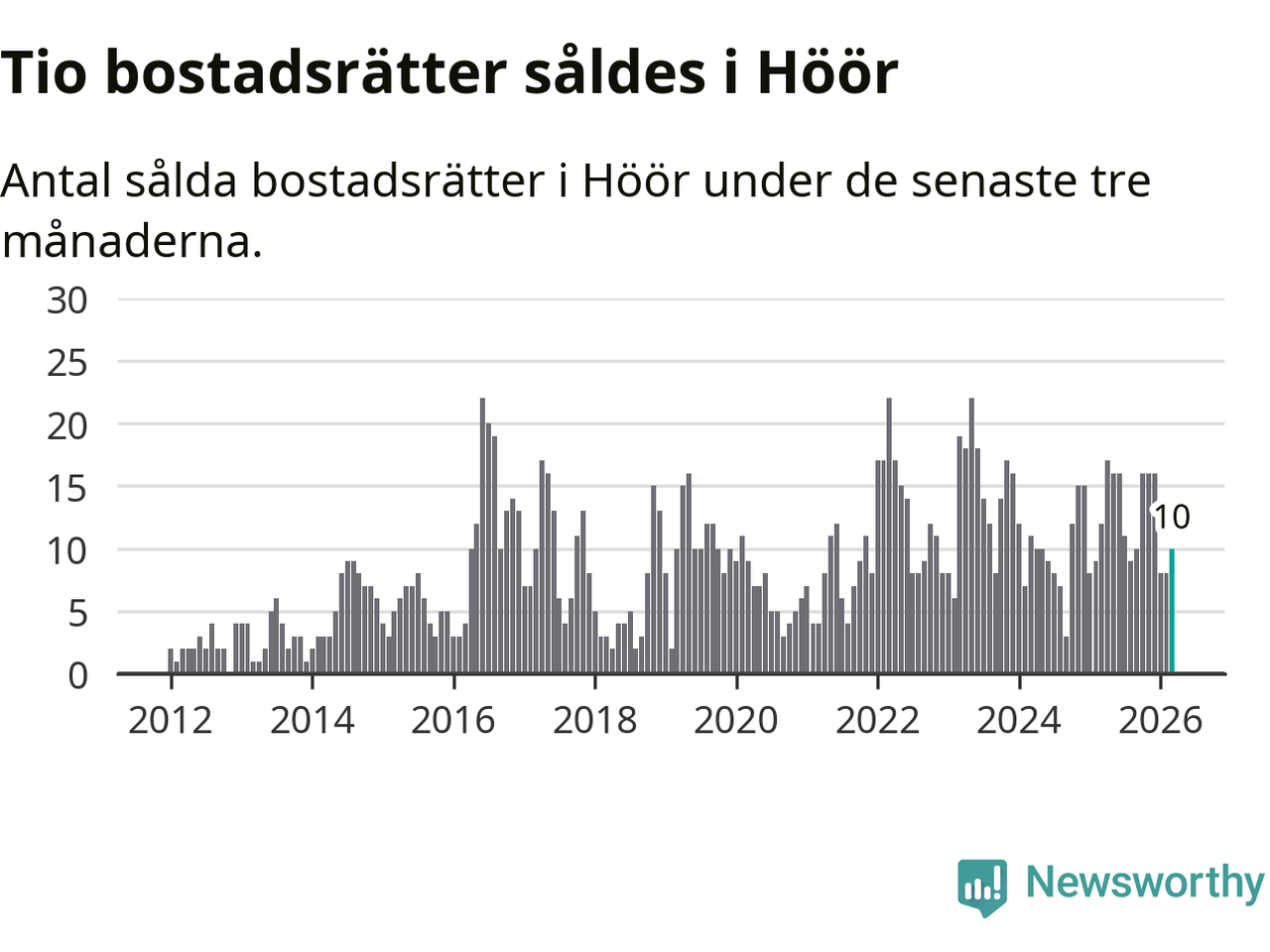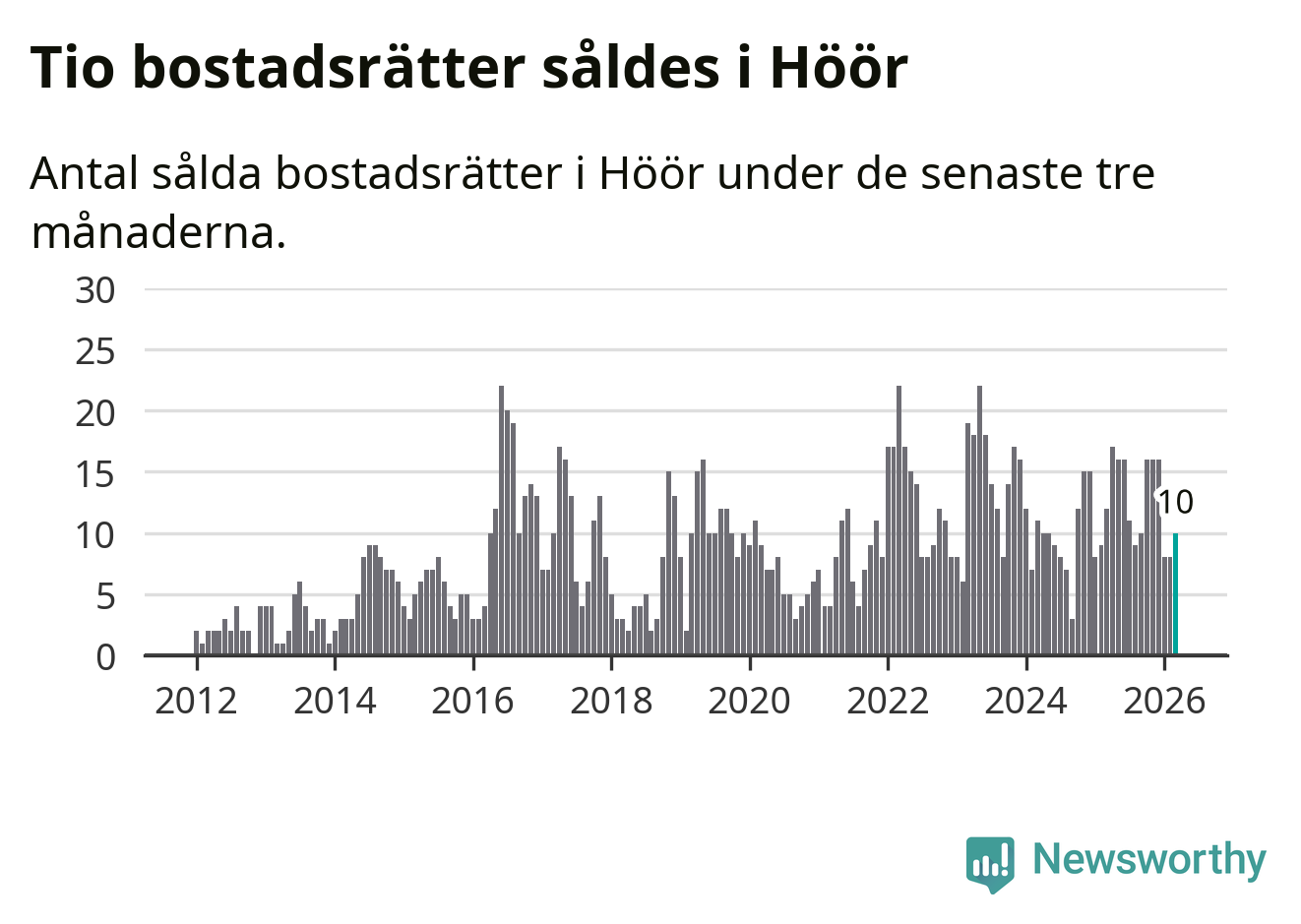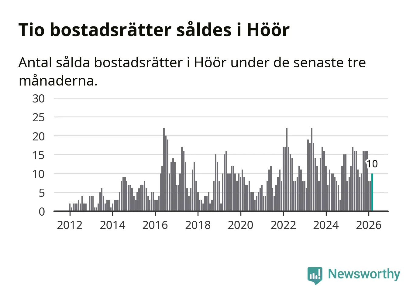 Mellan januari och mars gjordes sammanlagt tio affärer med bostadsrätter i Höörs kommun. Det kan jämföras med tolv vid motsvarande tid i fjol.
