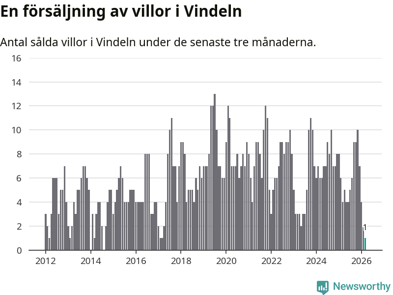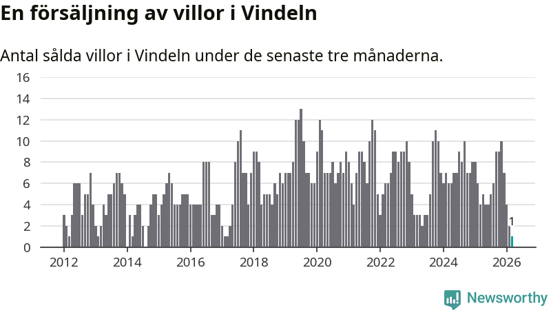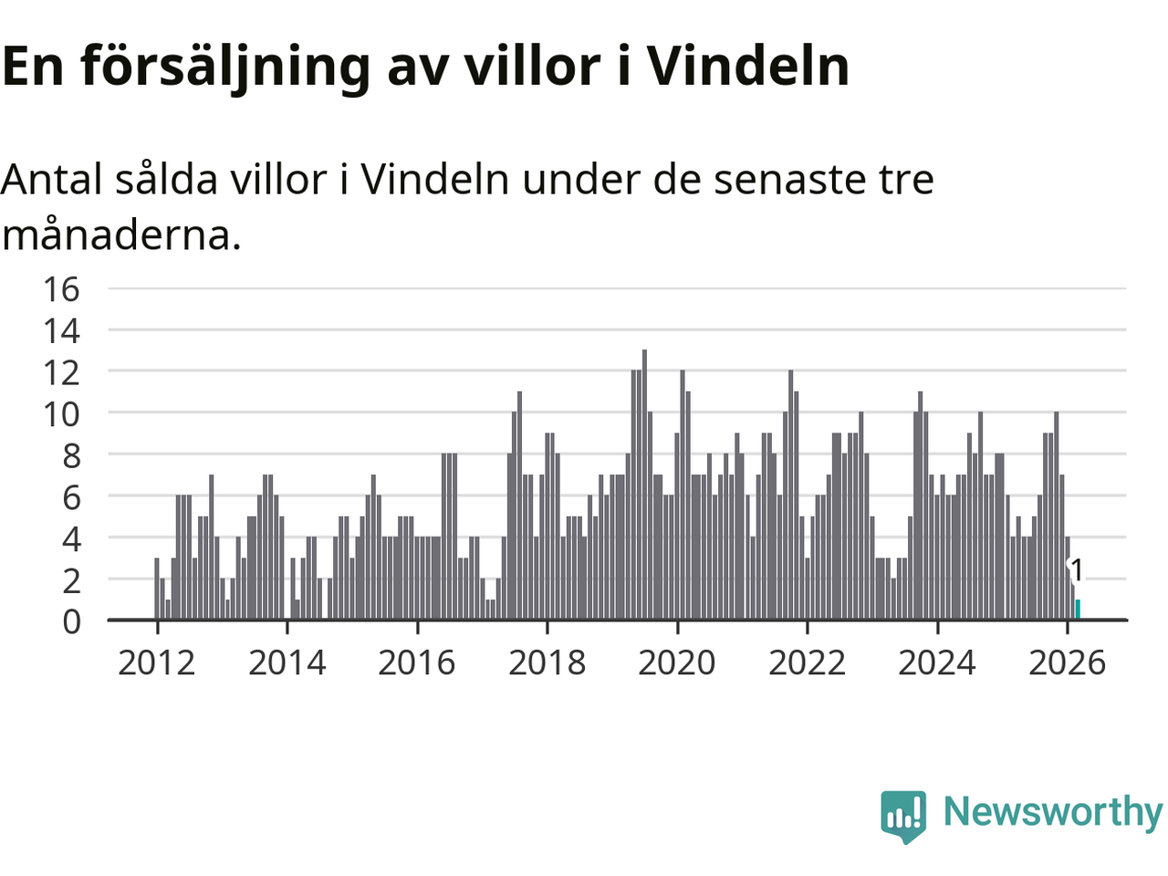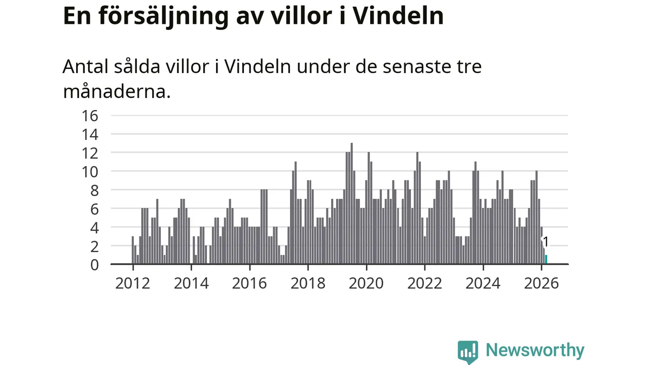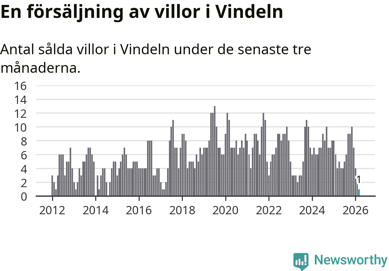 Mellan januari och mars gjordes sammanlagt en affär med villor i Vindelns kommun. Det kan jämföras med fyra vid motsvarande tid i fjol.