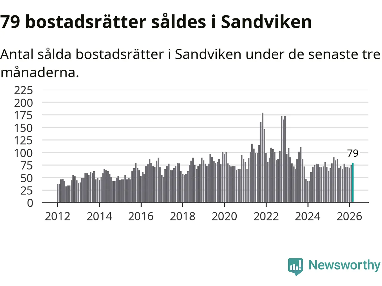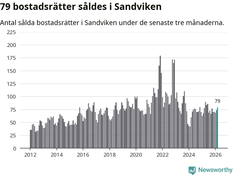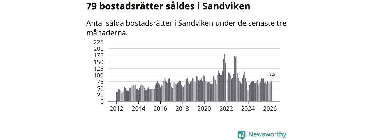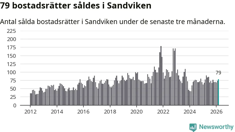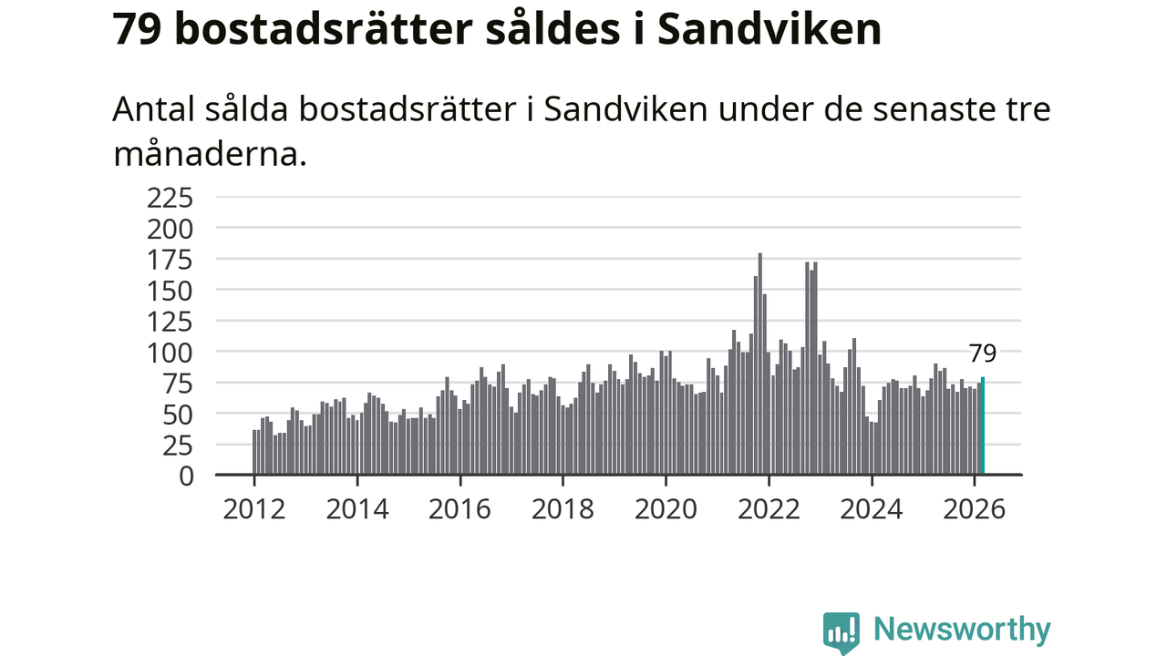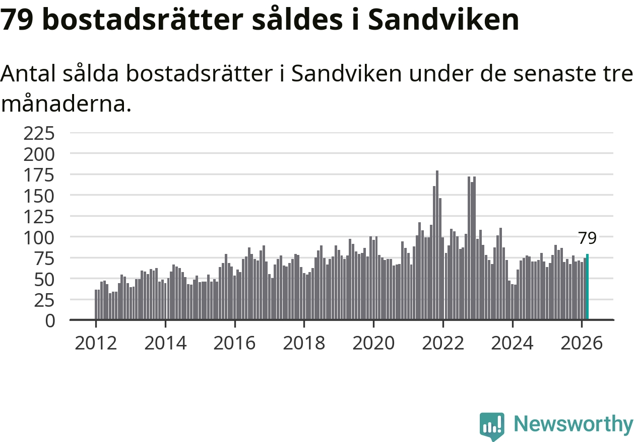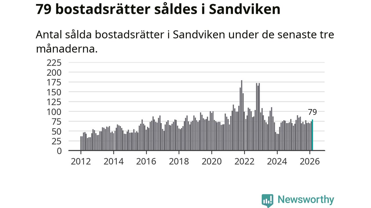 Sammanlagt såldes 79 bostadsrätter i Sandvikens kommun mellan januari och mars till ett genomsnittligt pris på 0,8 miljoner kronor. I fjol gjordes 78 affärer vid den här tiden på året.