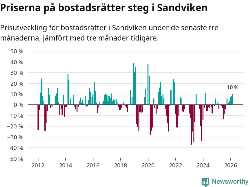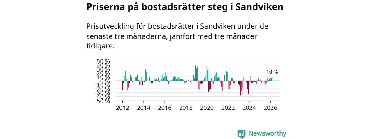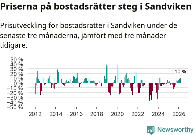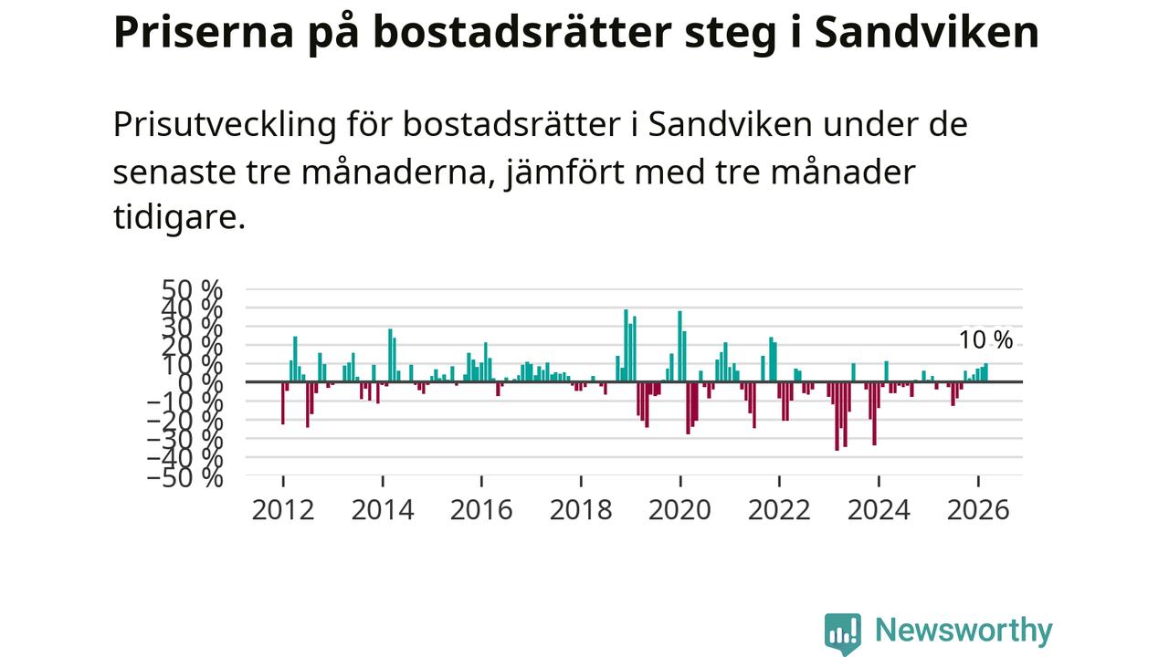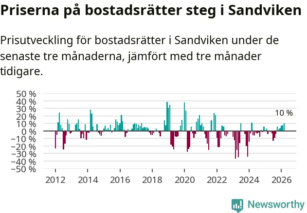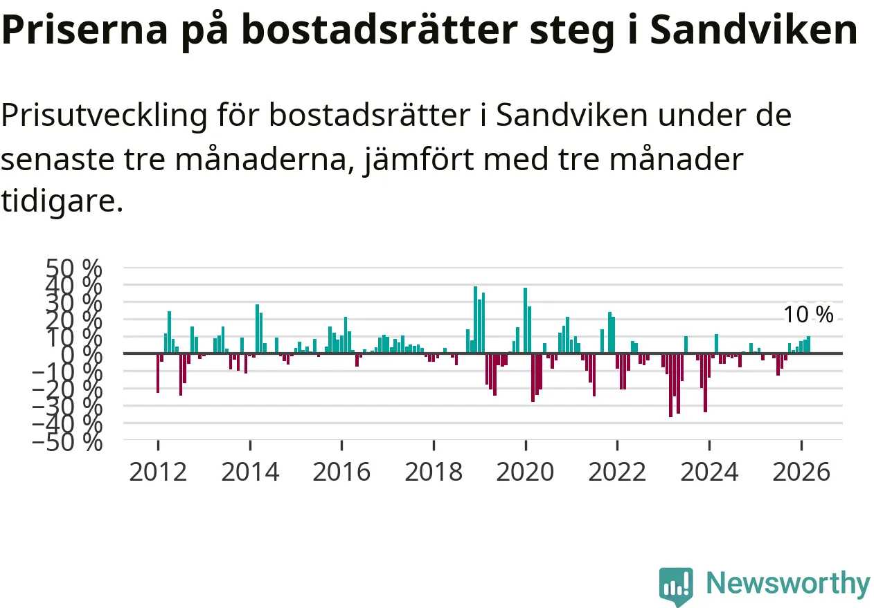 Priserna på bostadsrätter har gått upp i Sandvikens kommun. Medelpriset på försäljningarna under de senaste tre månaderna visar på en uppgång med 10 procent.