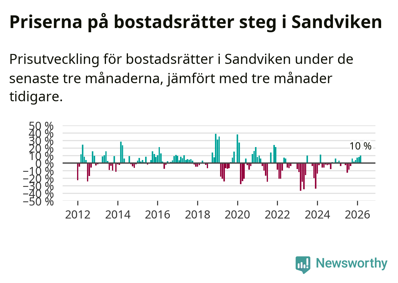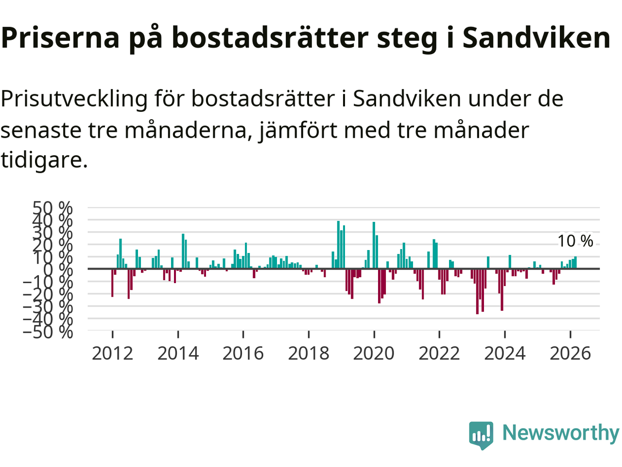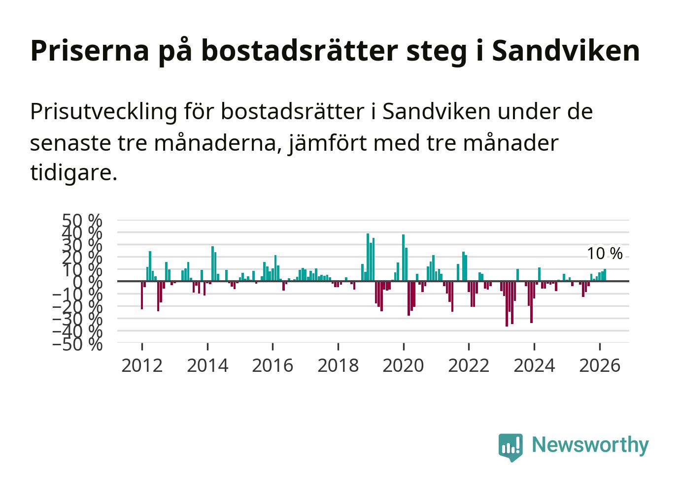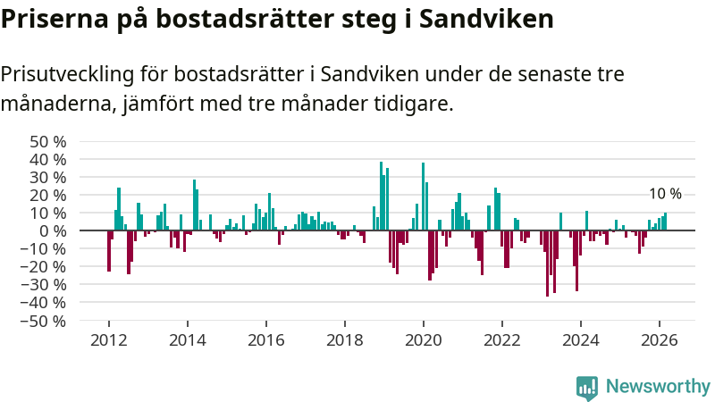 Priserna på bostadsrätter har gått upp i Sandvikens kommun. Medelpriset på försäljningarna under de senaste tre månaderna visar på en uppgång med 10 procent.