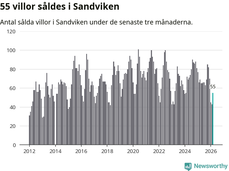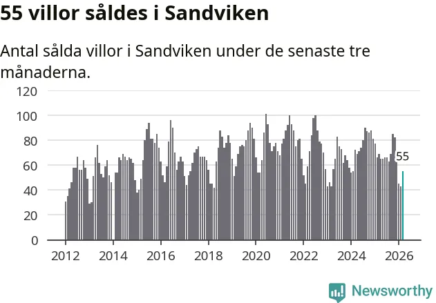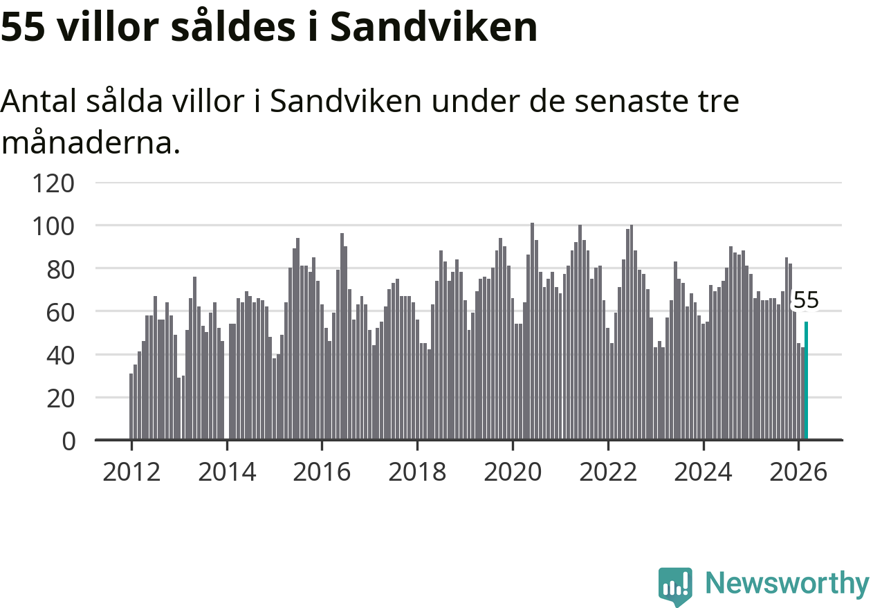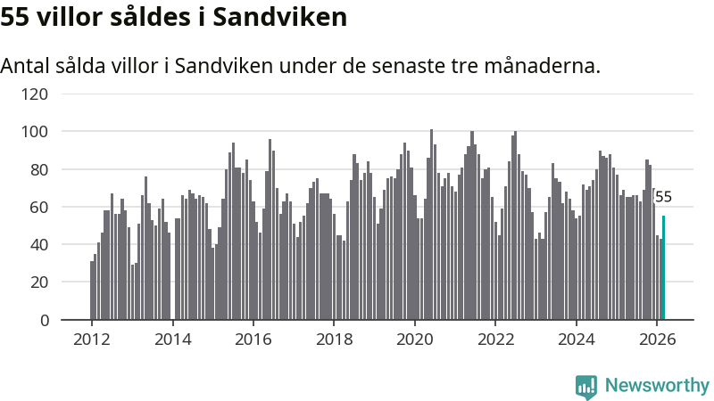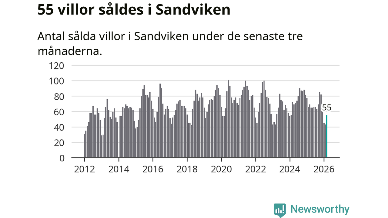 Sammanlagt såldes 55 villor i Sandvikens kommun mellan januari och mars till ett genomsnittligt pris på 2,0 miljoner kronor. I fjol gjordes 69 affärer vid den här tiden på året.