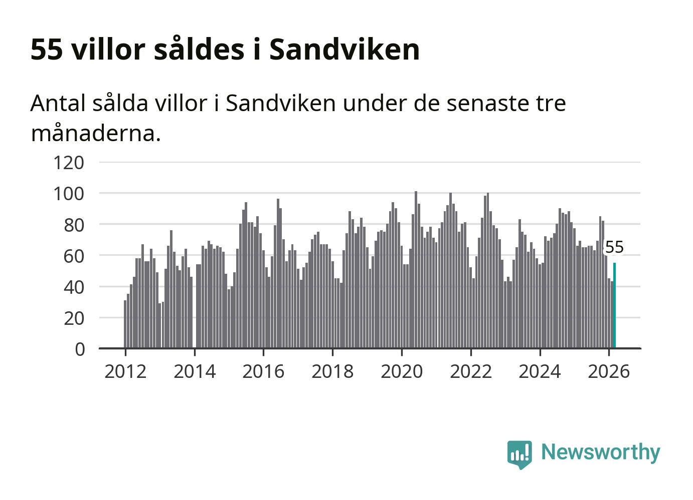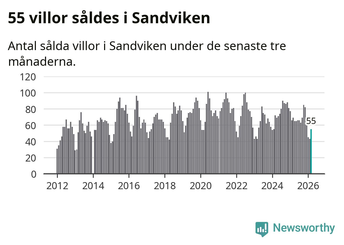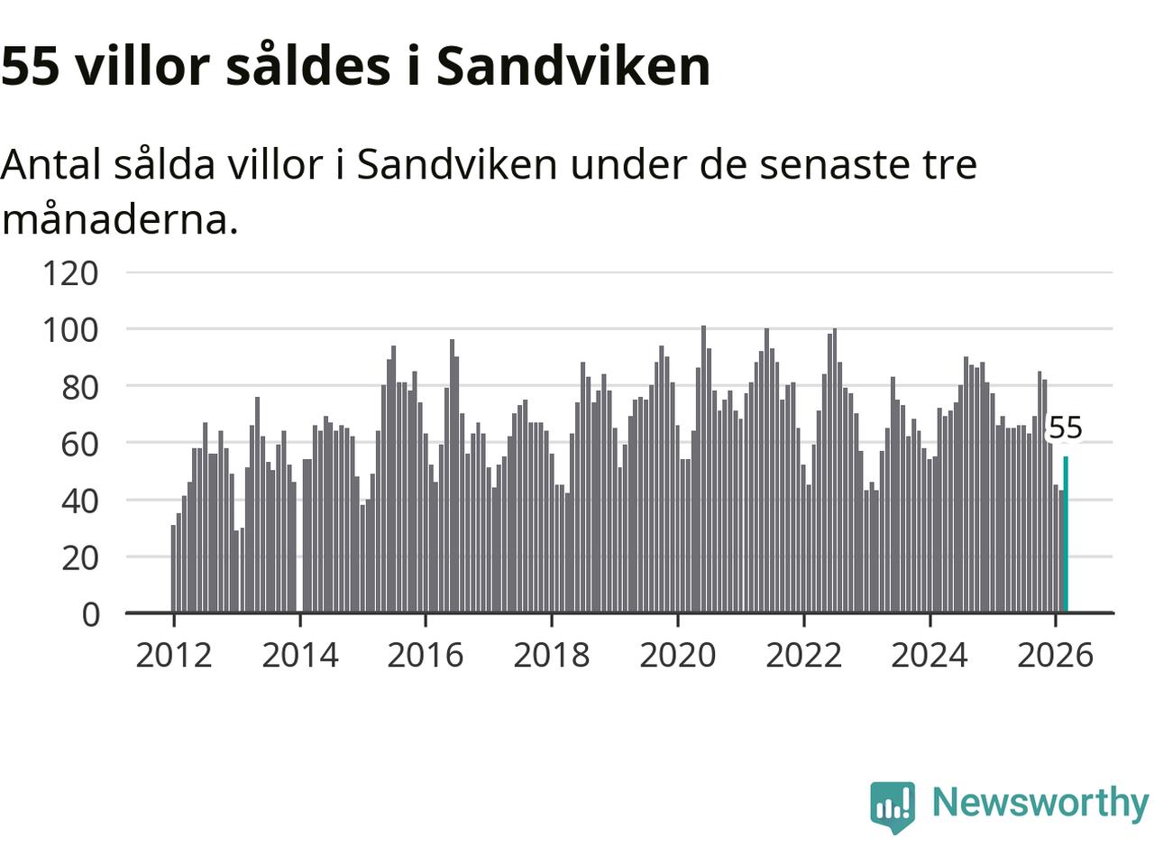 Sammanlagt såldes 55 villor i Sandvikens kommun mellan januari och mars till ett genomsnittligt pris på 2,0 miljoner kronor. I fjol gjordes 69 affärer vid den här tiden på året.