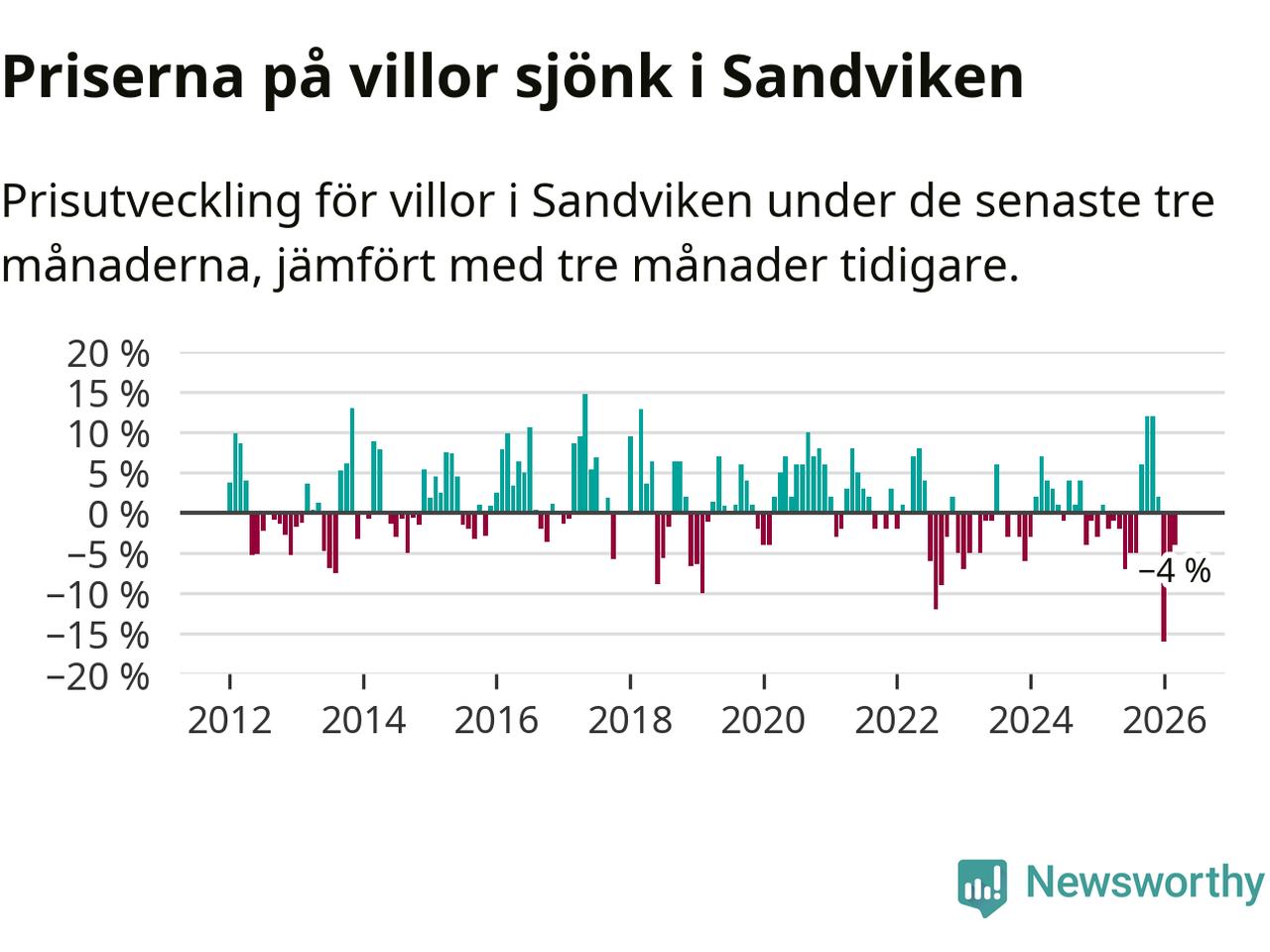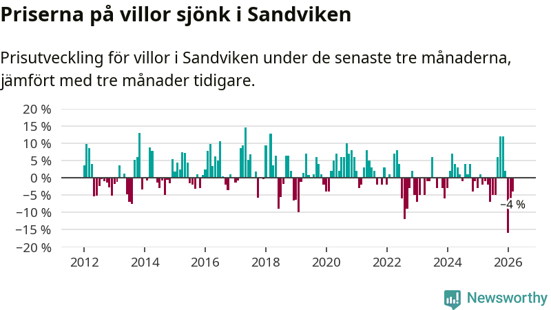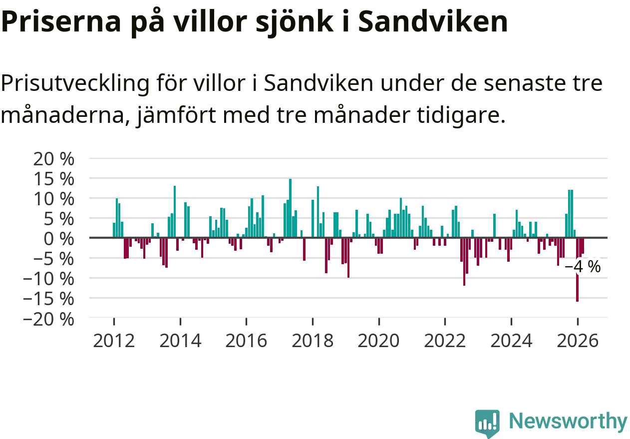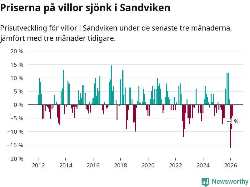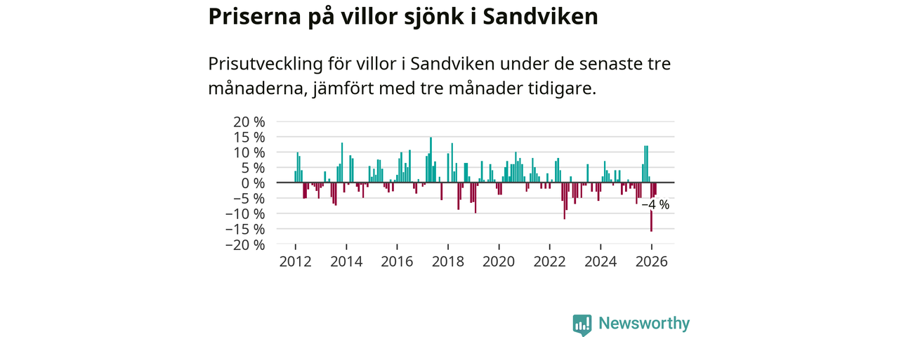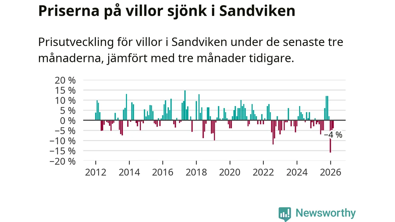 Villapriserna har gått ner i Sandvikens kommun. Medelpriset på försäljningarna under de senaste tre månaderna visar på en nedgång med 4 procent.