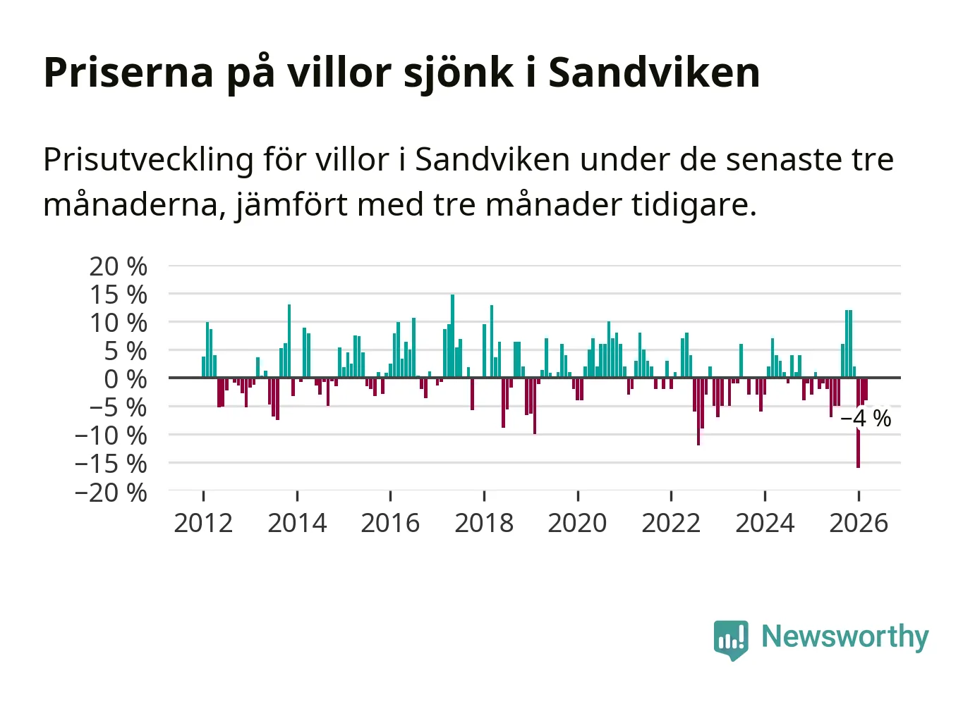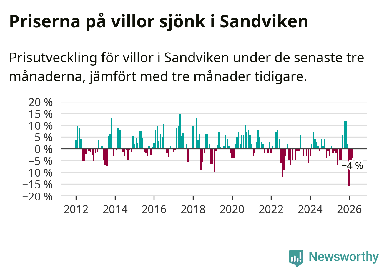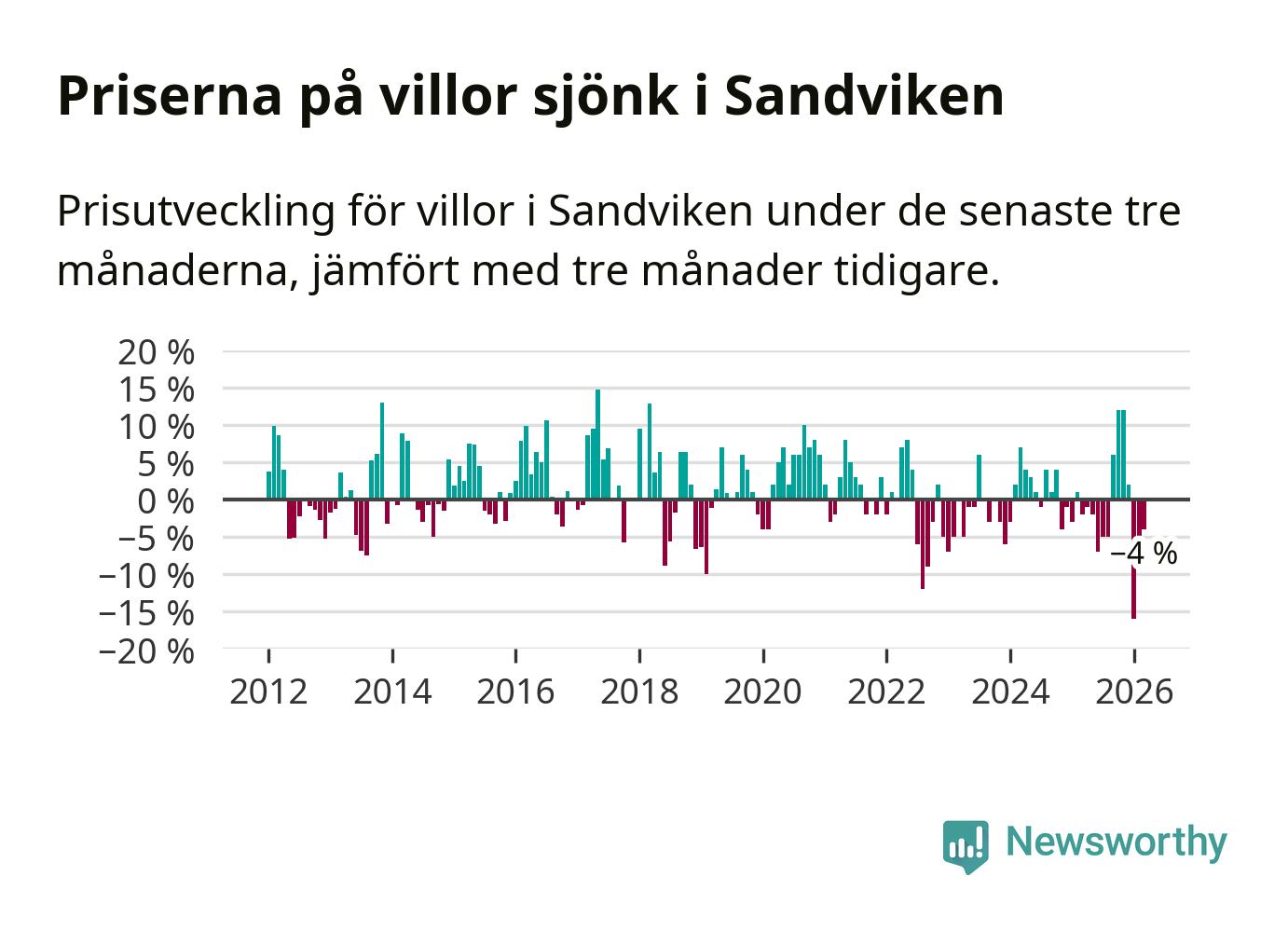 Villapriserna har gått ner i Sandvikens kommun. Medelpriset på försäljningarna under de senaste tre månaderna visar på en nedgång med 4 procent.