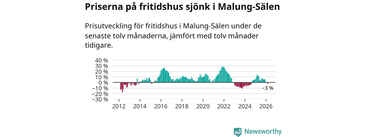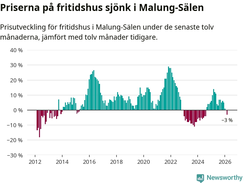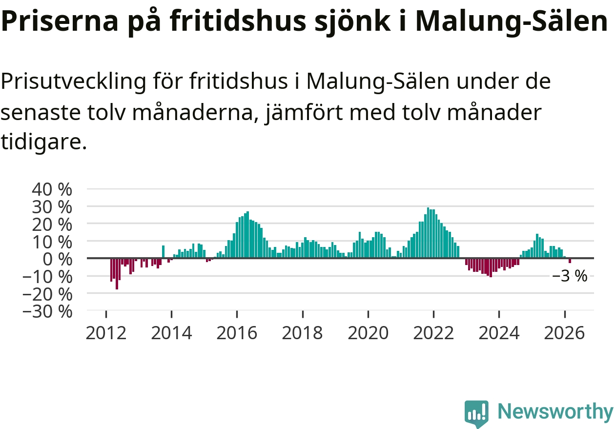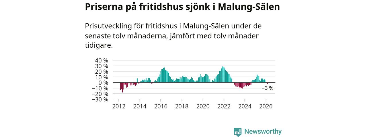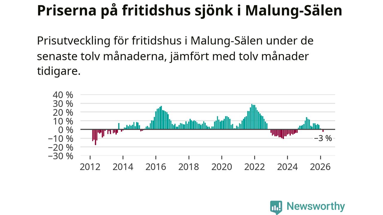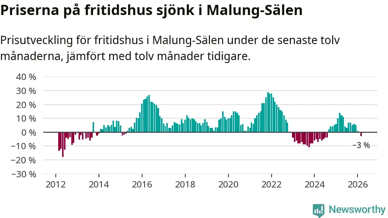 Priserna på fritidshus har gått ner i Malung-Sälens kommun. Medelpriset på försäljningarna under de senaste tolv månaderna visar på en nedgång med 3 procent.