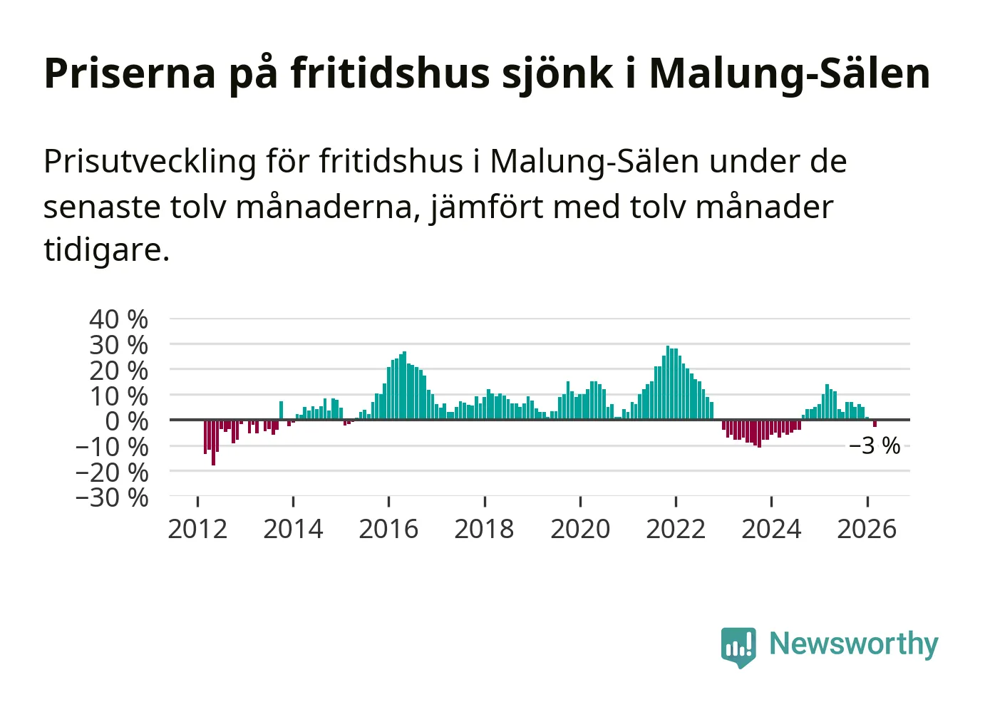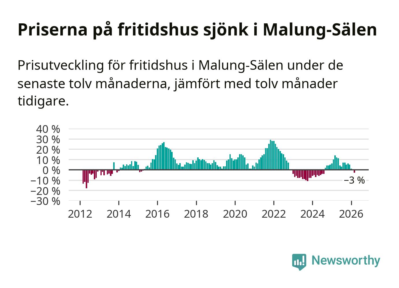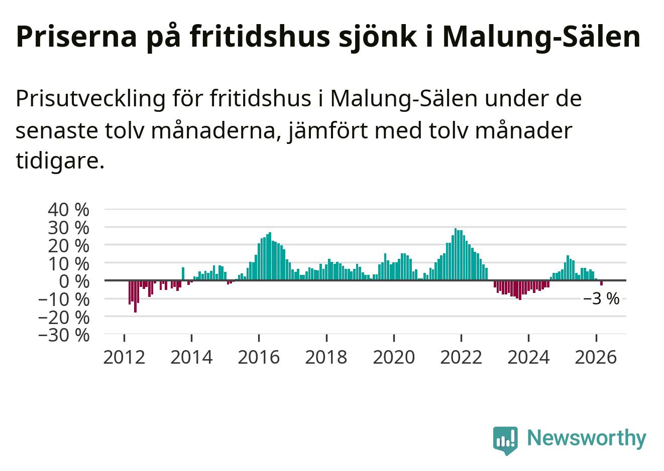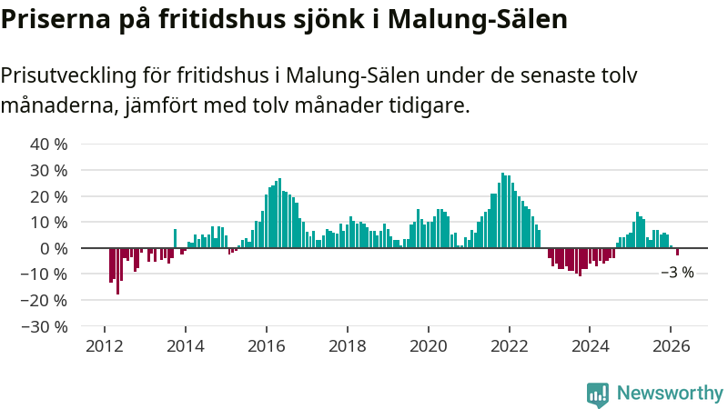 Priserna på fritidshus har gått ner i Malung-Sälens kommun. Medelpriset på försäljningarna under de senaste tolv månaderna visar på en nedgång med 3 procent.