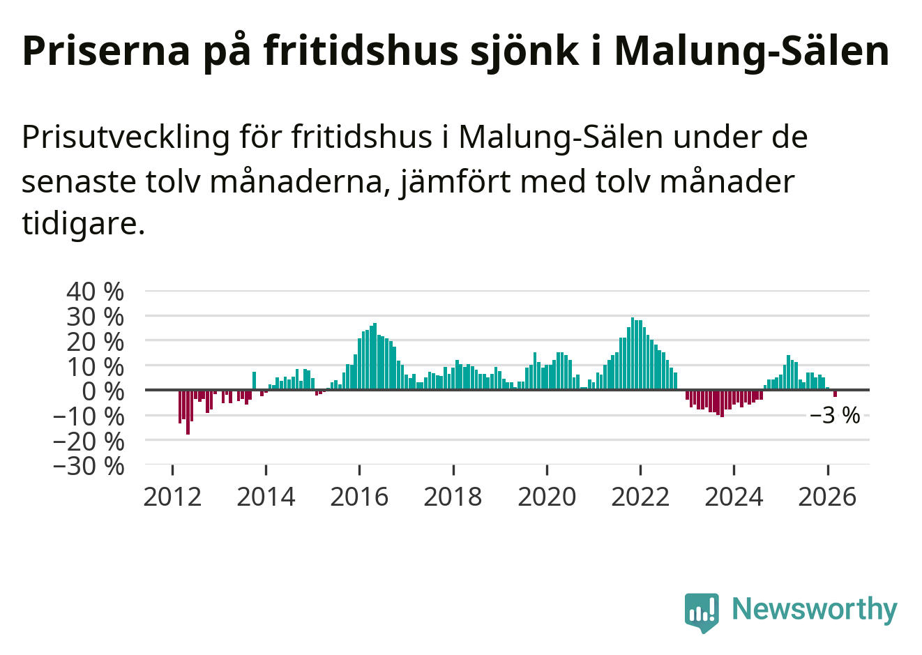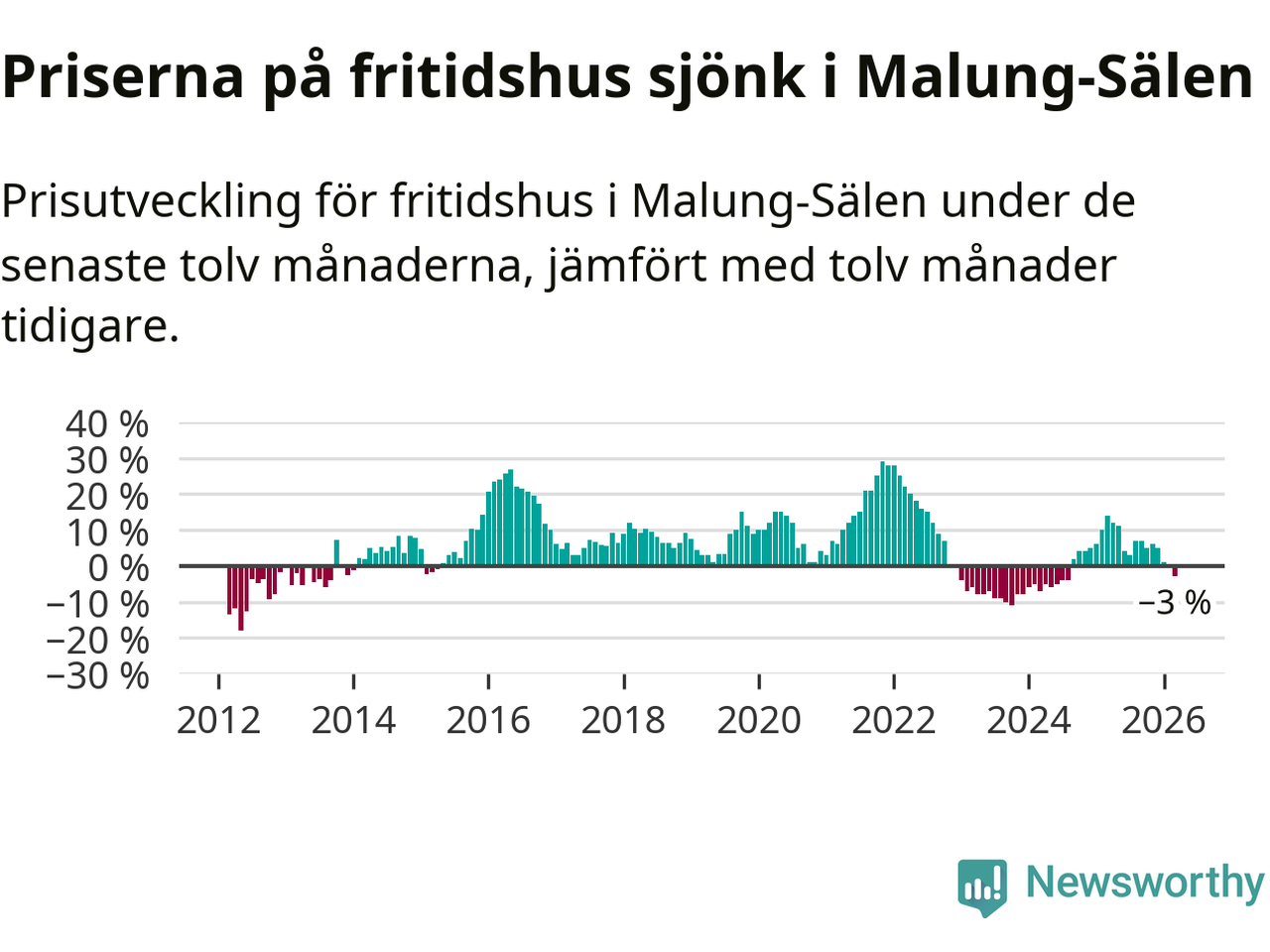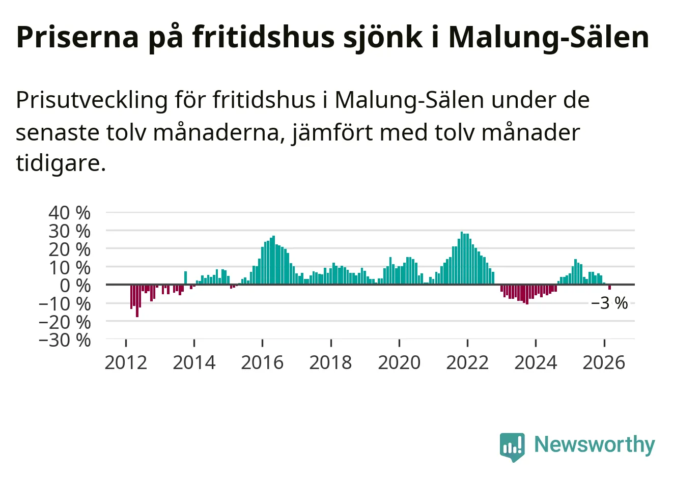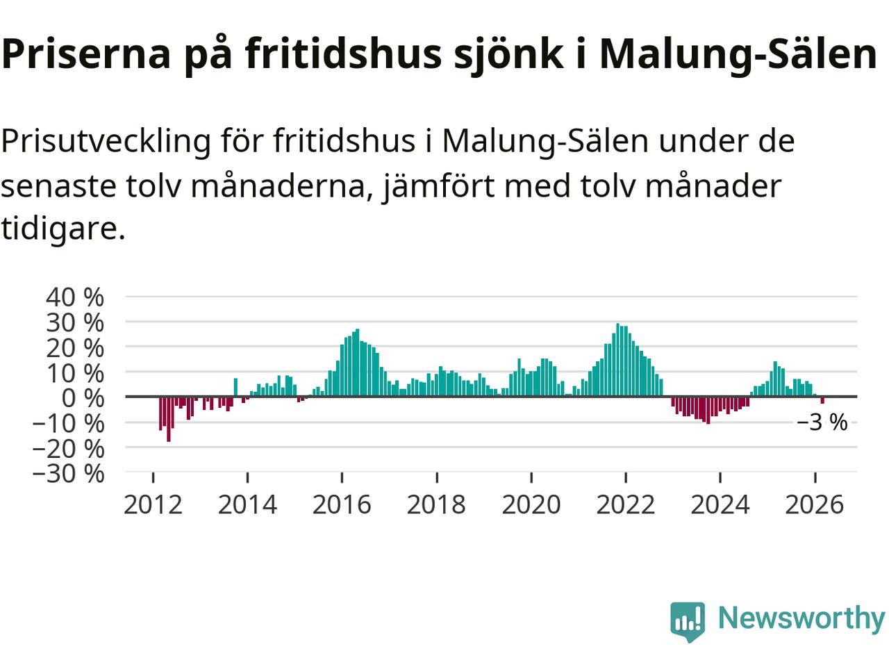 Priserna på fritidshus har gått ner i Malung-Sälens kommun. Medelpriset på försäljningarna under de senaste tolv månaderna visar på en nedgång med 3 procent.