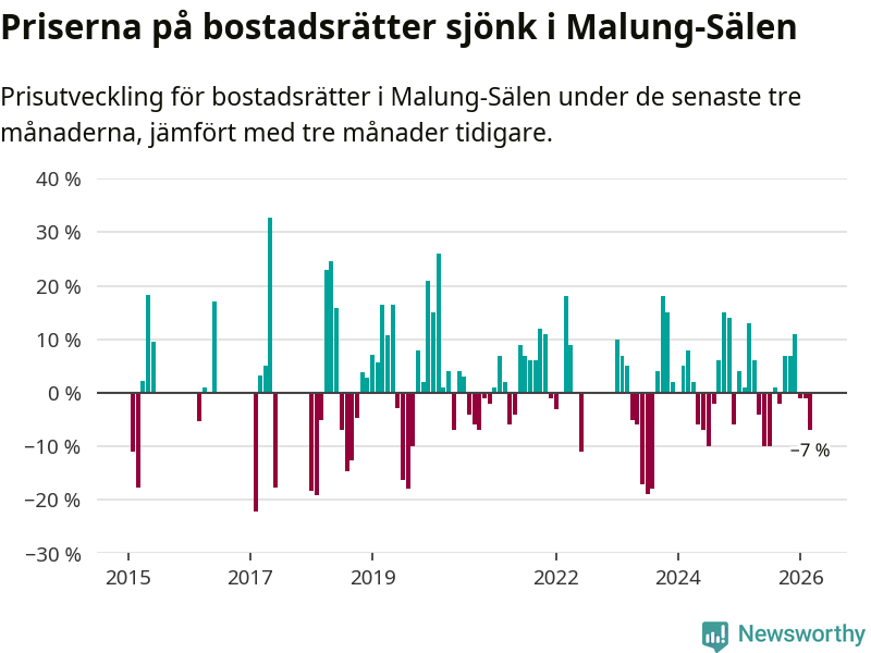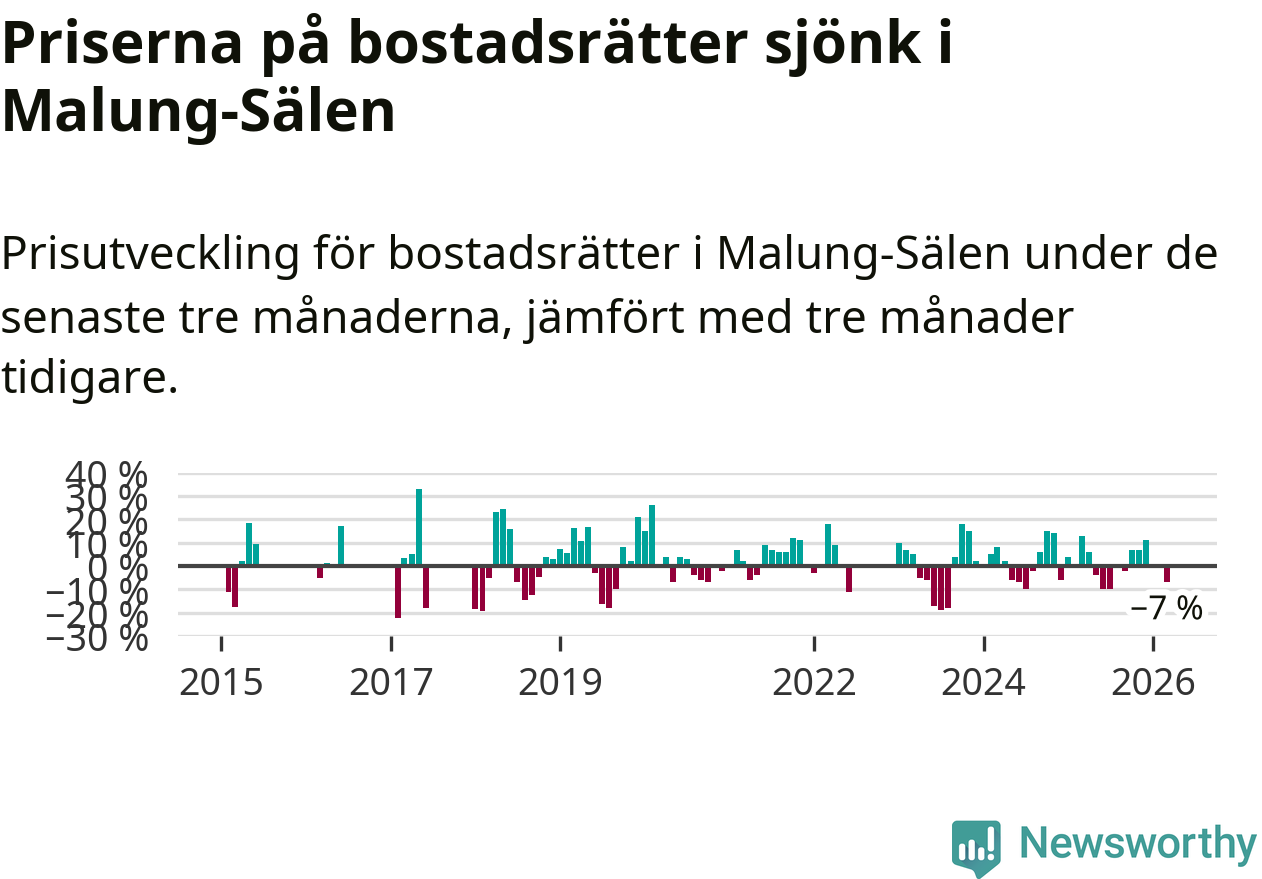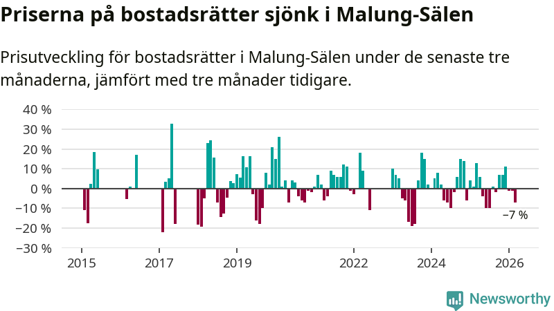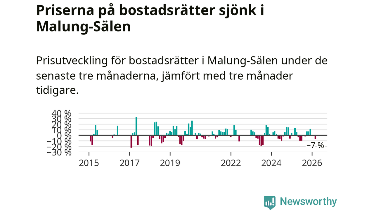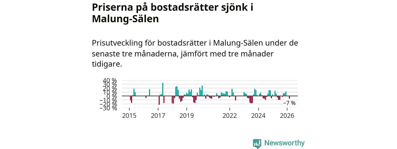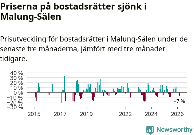 Priserna på bostadsrätter har gått ner i Malung-Sälens kommun. Medelpriset på försäljningarna under de senaste tre månaderna visar på en nedgång med 7 procent.