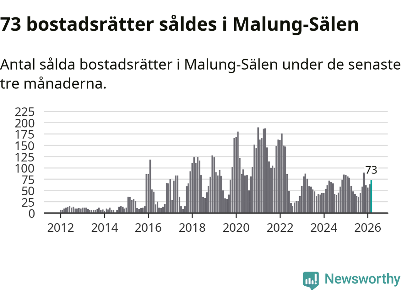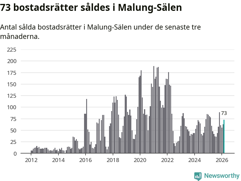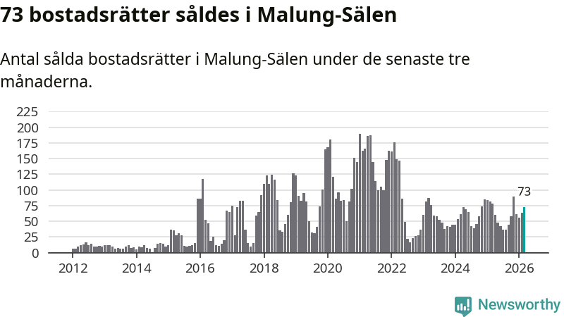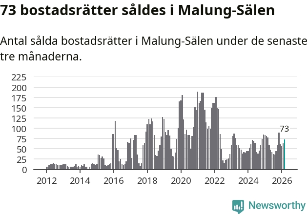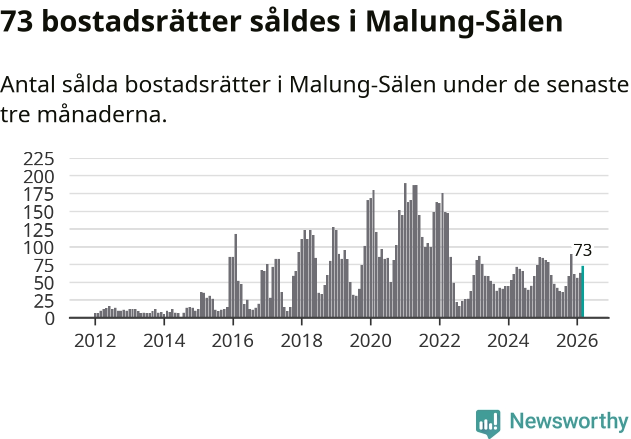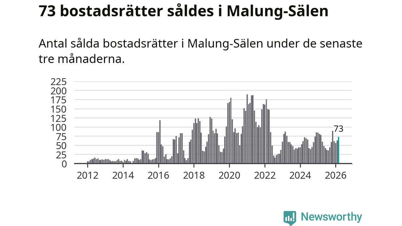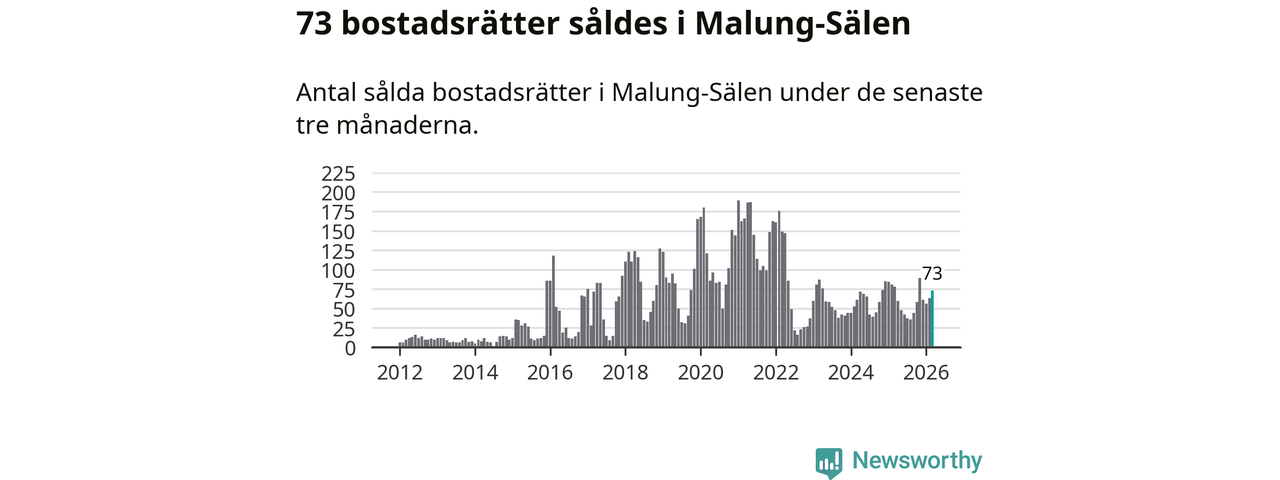 Sammanlagt såldes 73 bostadsrätter i Malung-Sälens kommun mellan januari och mars till ett genomsnittligt pris på 2,9 miljoner kronor. I fjol gjordes 78 affärer vid den här tiden på året.