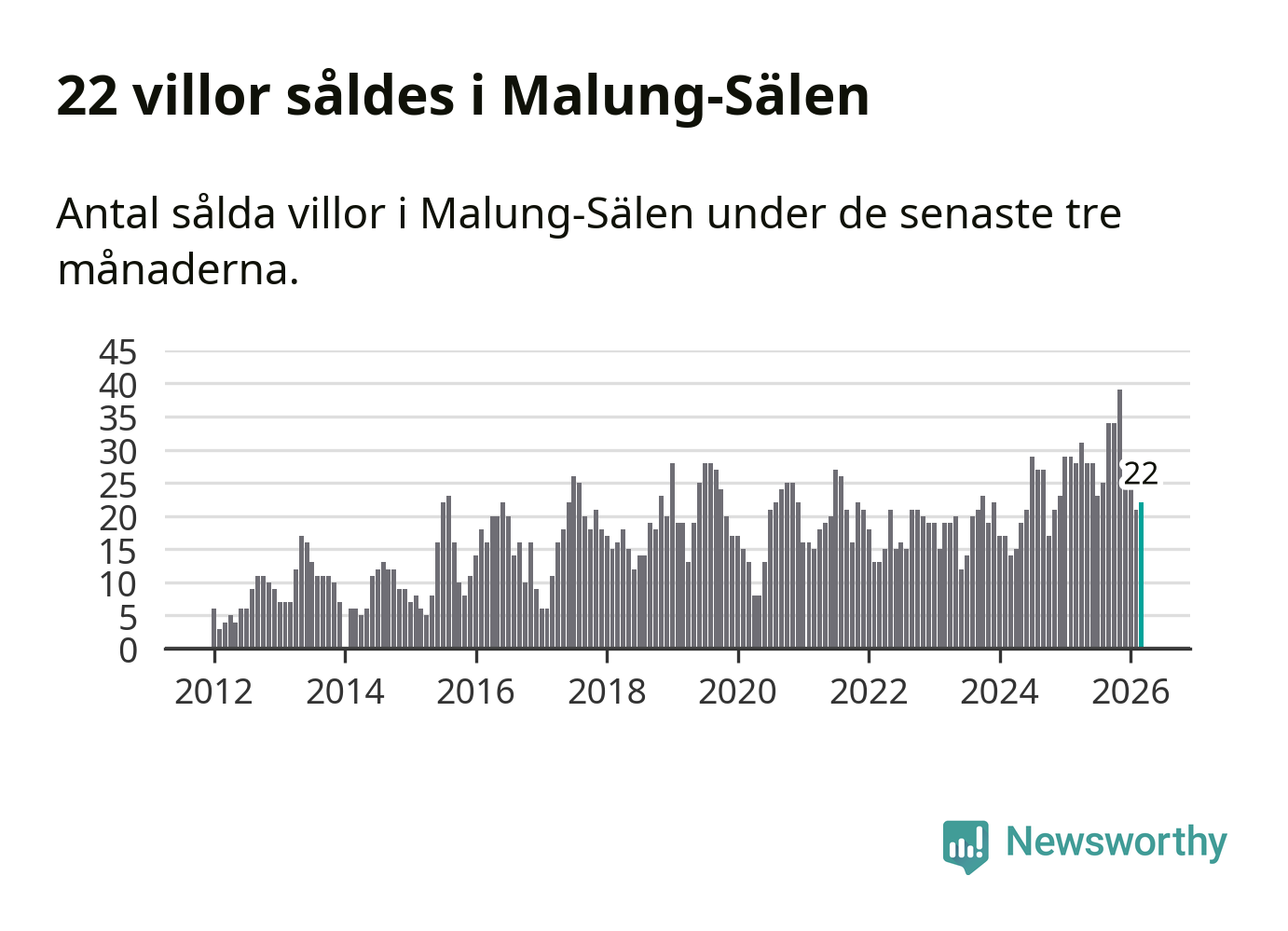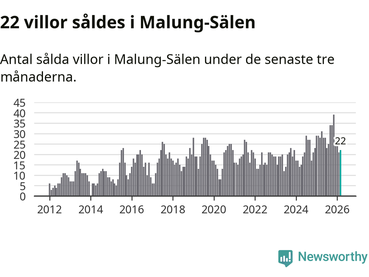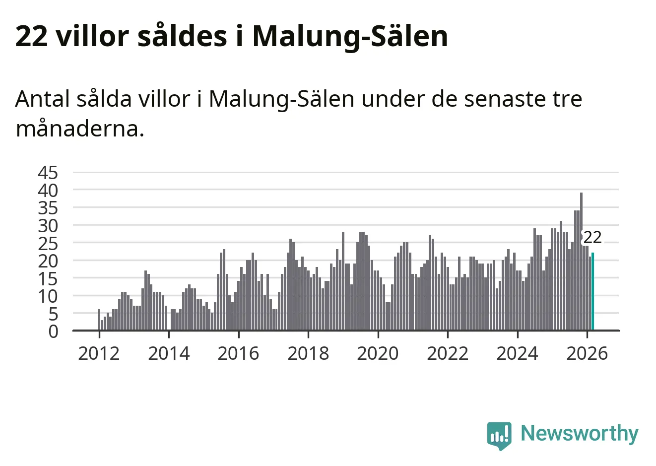 Mellan januari och mars gjordes sammanlagt 22 affärer med villor i Malung-Sälens kommun. Det kan jämföras med 28 vid motsvarande tid i fjol.