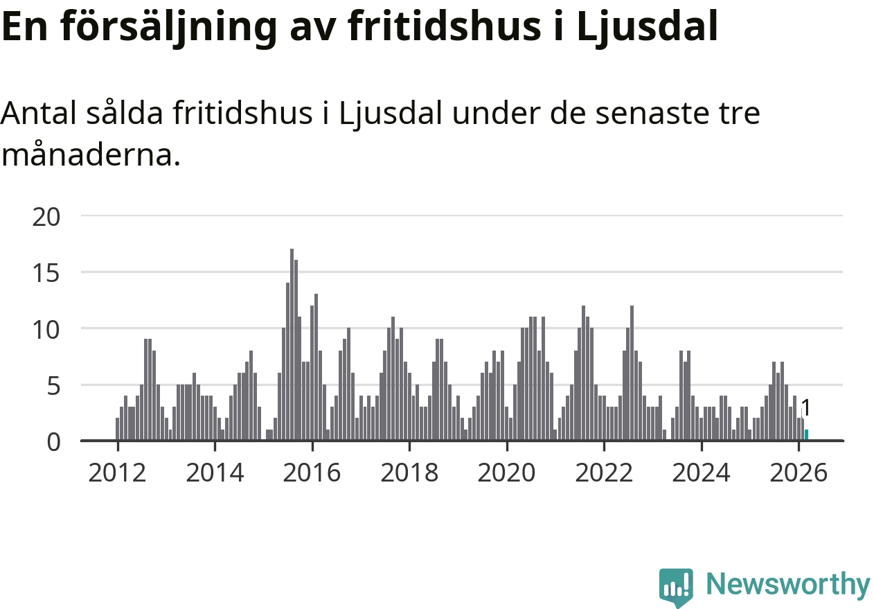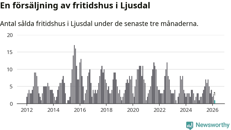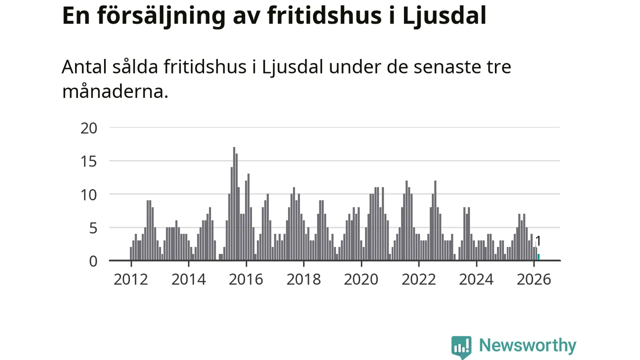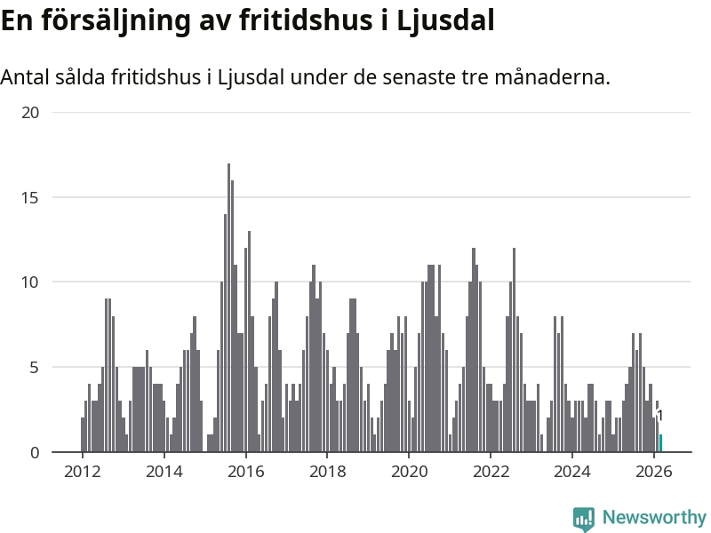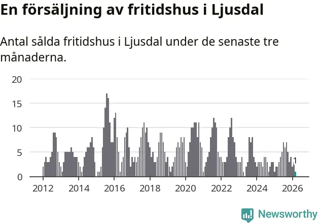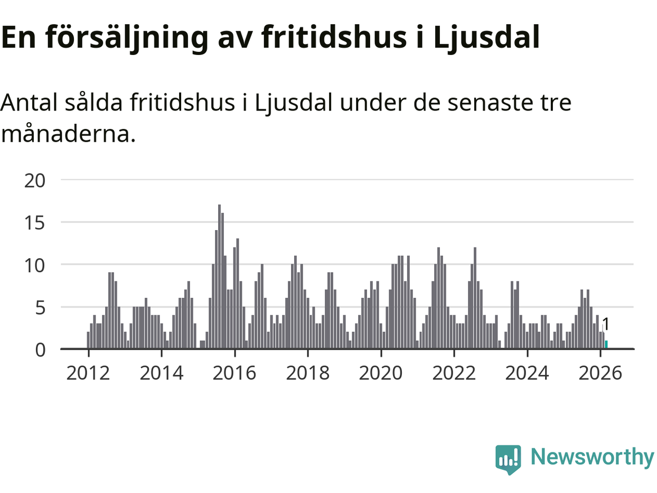 Mellan januari och mars gjordes sammanlagt en affär med fritidshus i Ljusdals kommun. Det kan jämföras med två vid motsvarande tid i fjol.