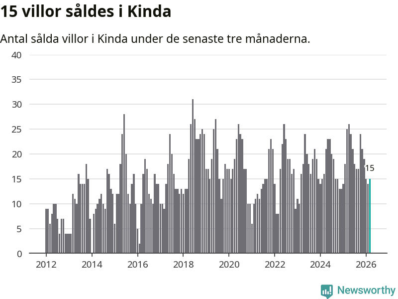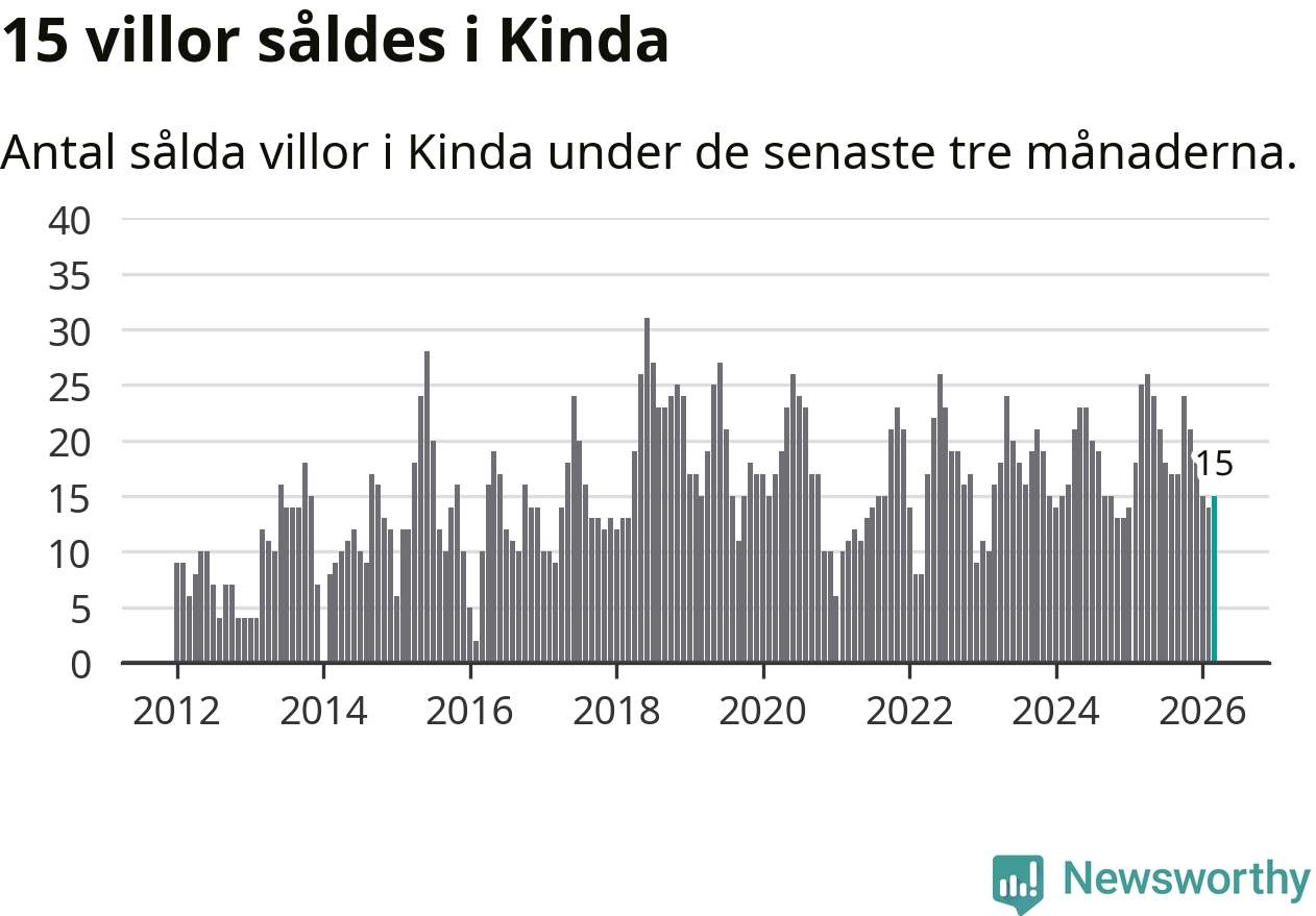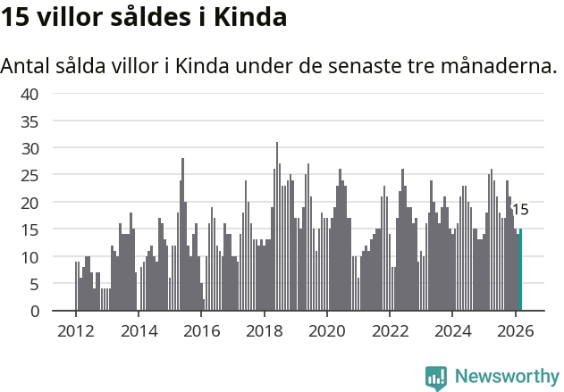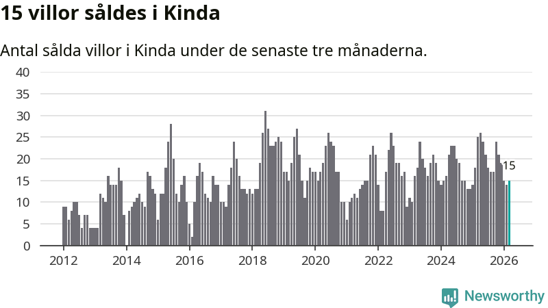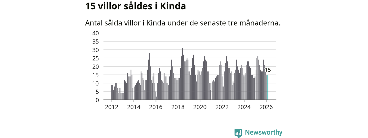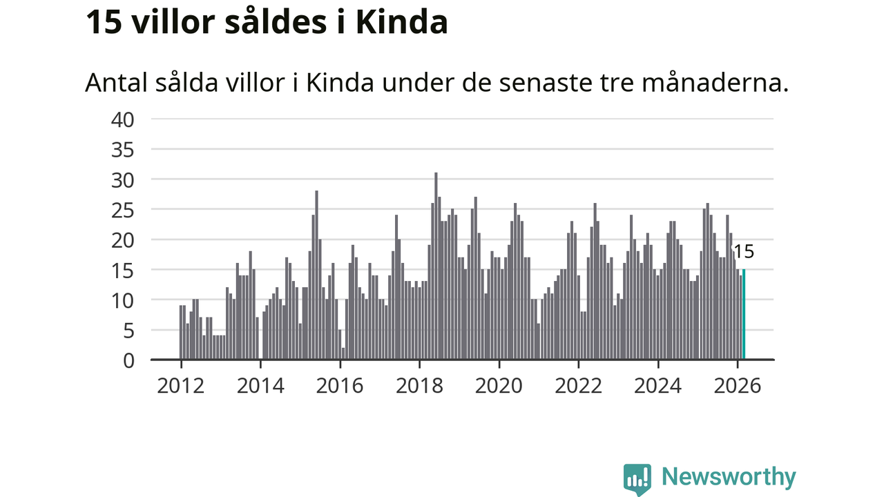 Mellan januari och mars gjordes sammanlagt 15 affärer med villor i Kinda kommun. Det kan jämföras med 25 vid motsvarande tid i fjol.