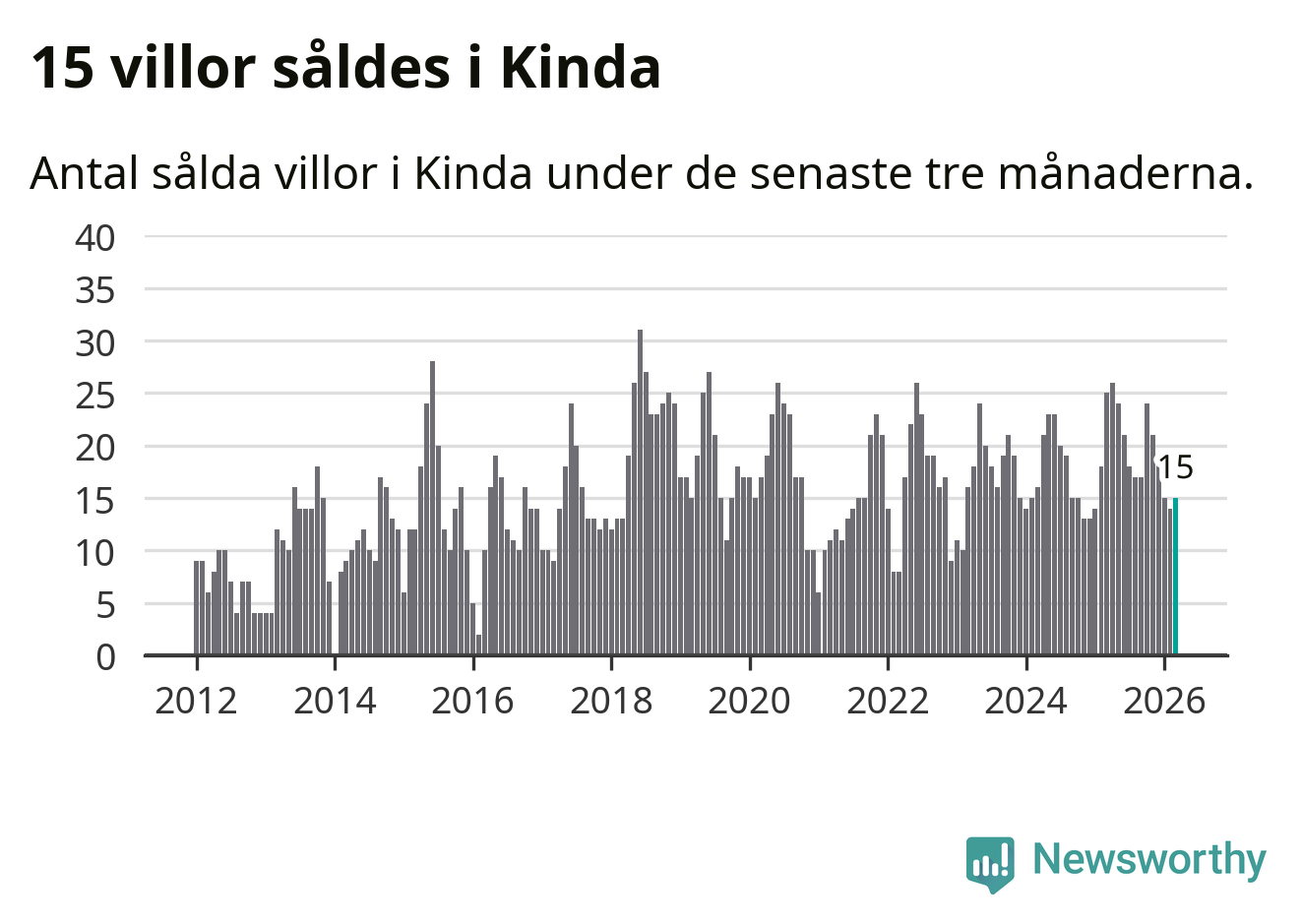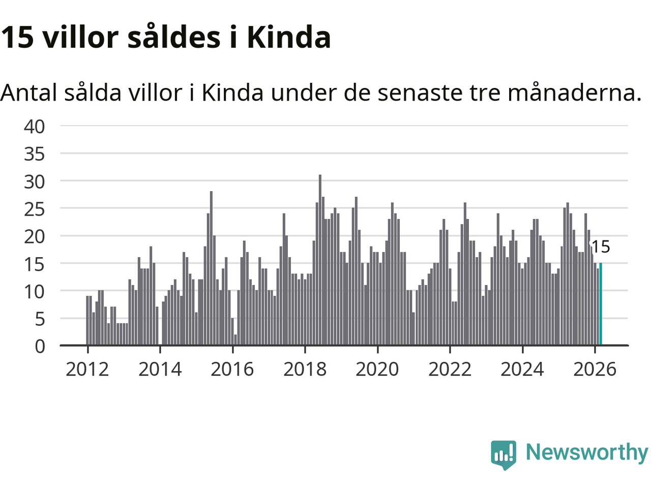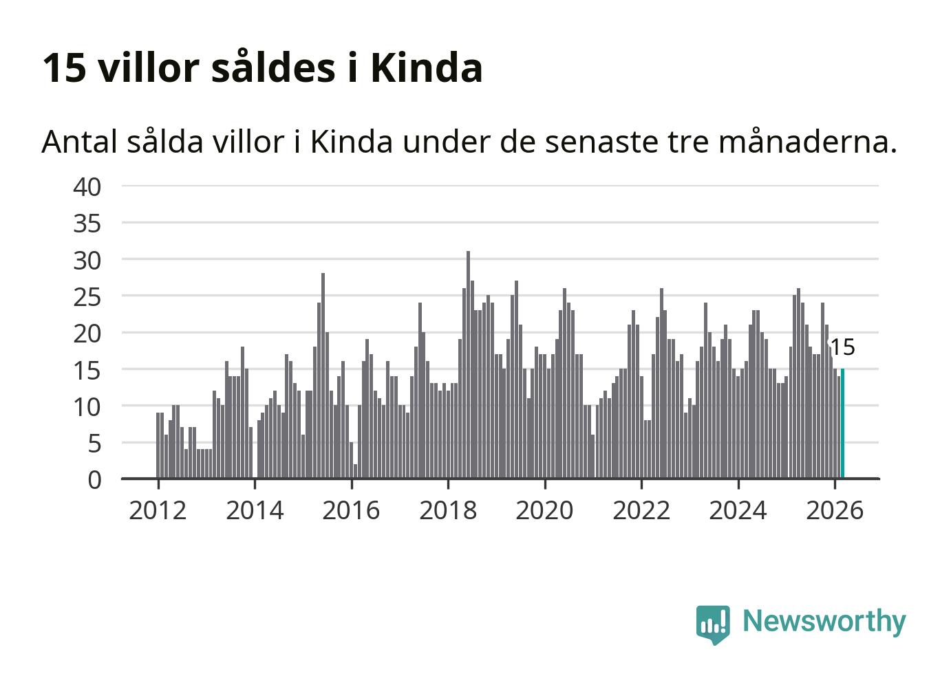 Mellan januari och mars gjordes sammanlagt 15 affärer med villor i Kinda kommun. Det kan jämföras med 25 vid motsvarande tid i fjol.