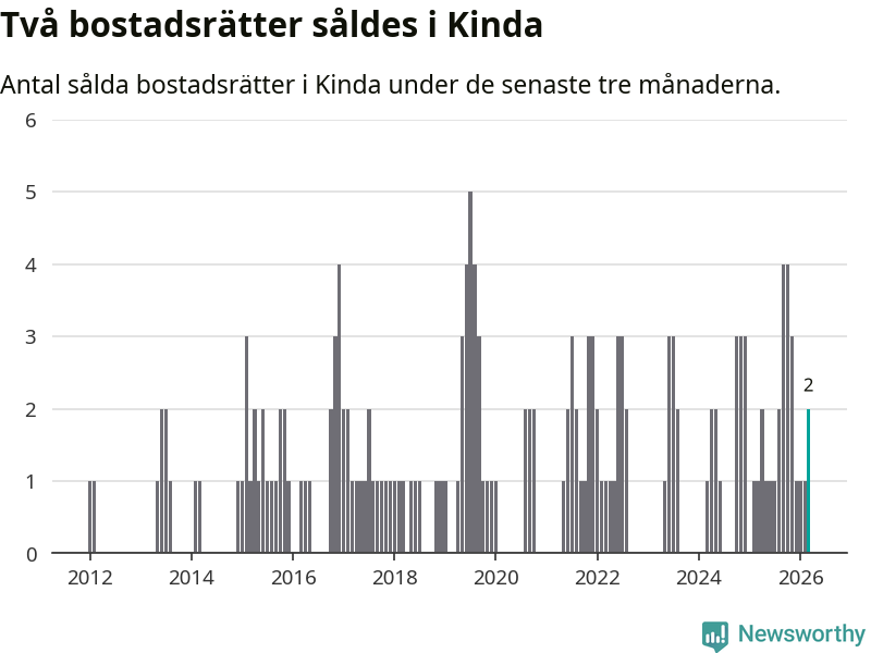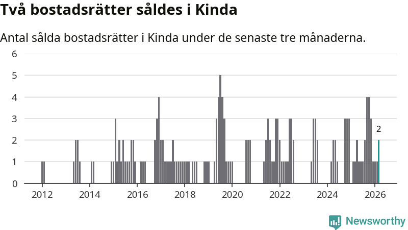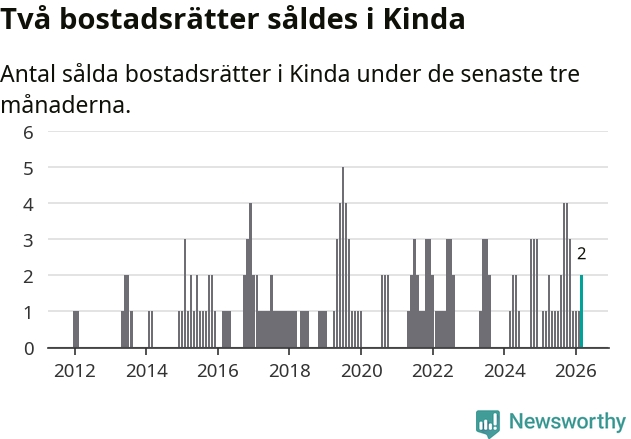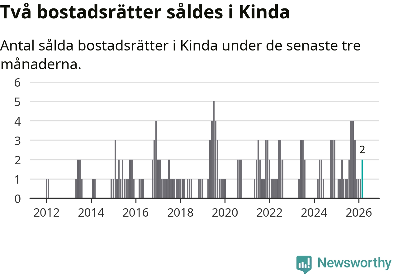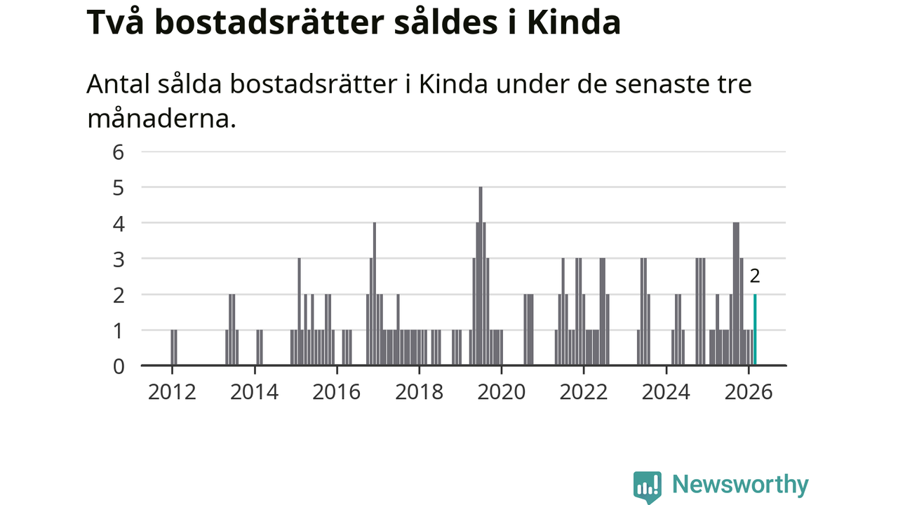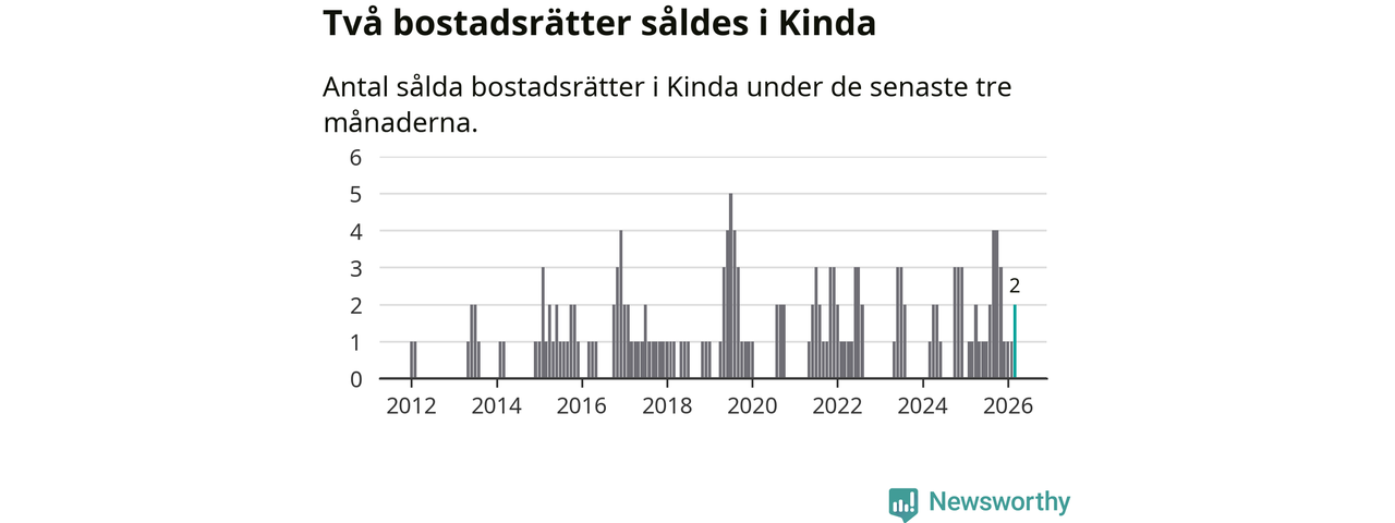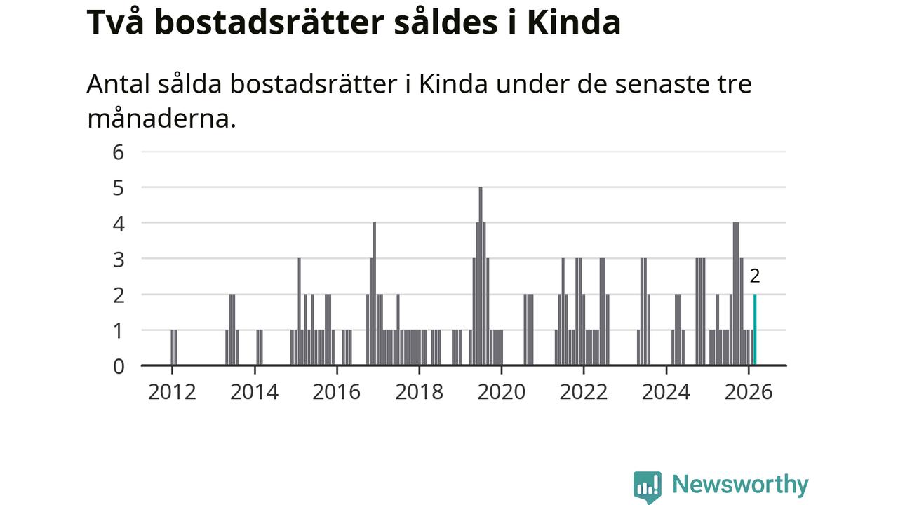 Mellan januari och mars gjordes sammanlagt två affärer med bostadsrätter i Kinda kommun. Det kan jämföras med ett vid motsvarande tid i fjol.