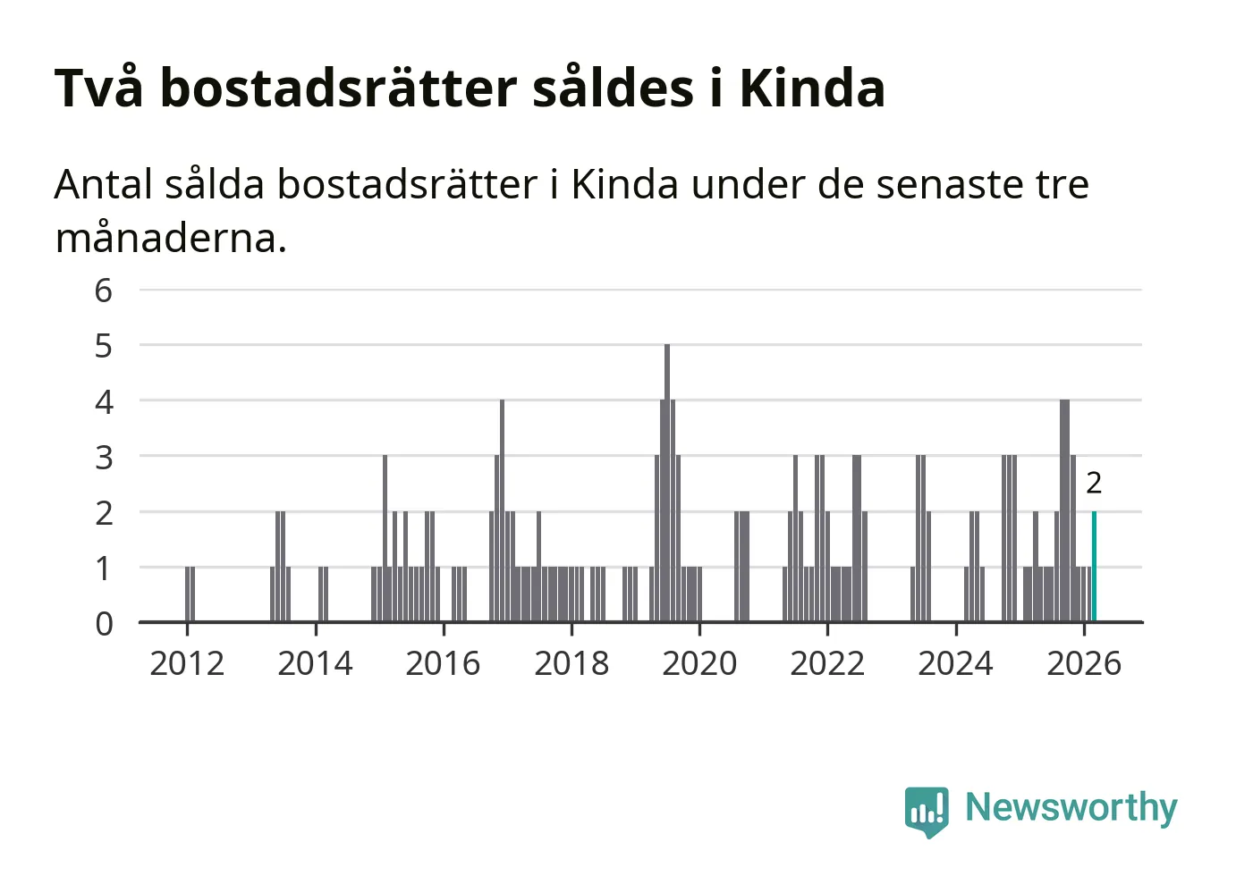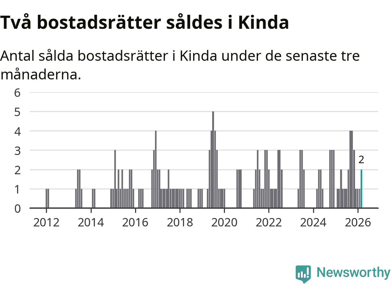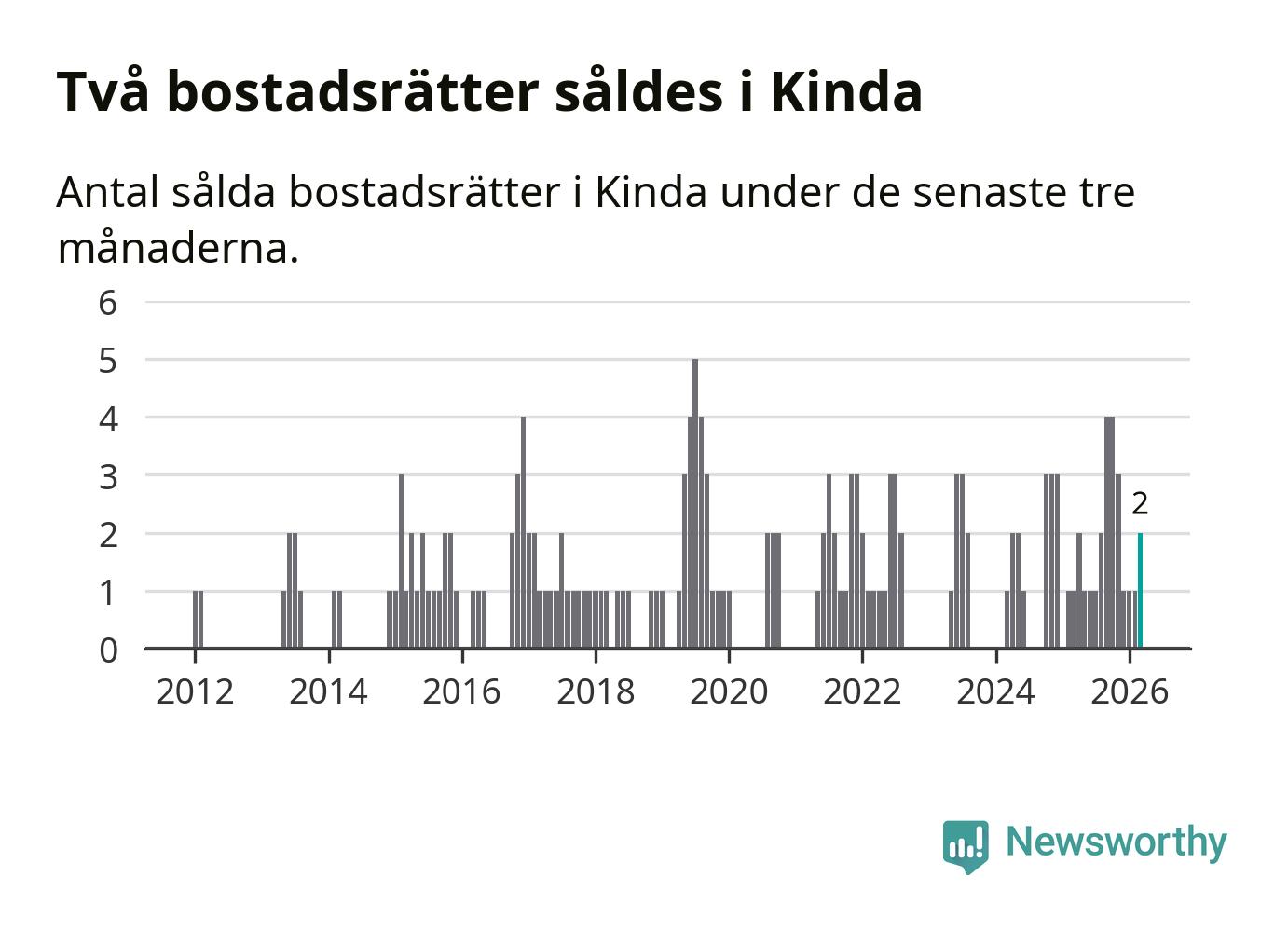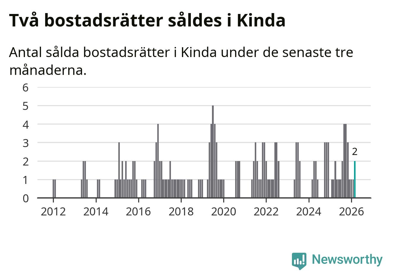 Mellan januari och mars gjordes sammanlagt två affärer med bostadsrätter i Kinda kommun. Det kan jämföras med ett vid motsvarande tid i fjol.