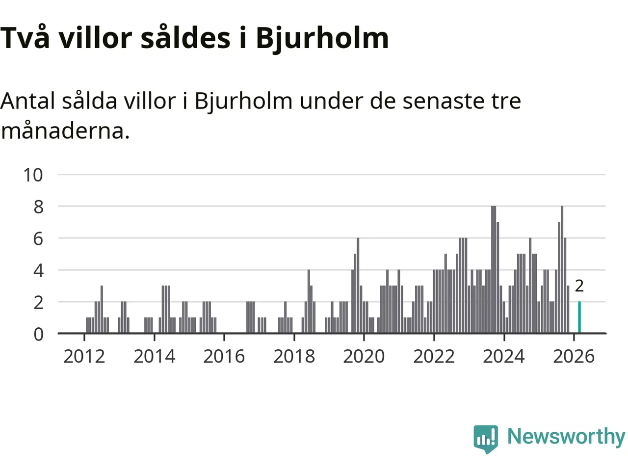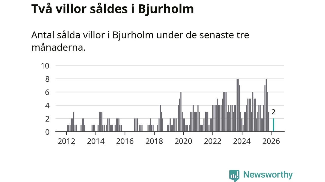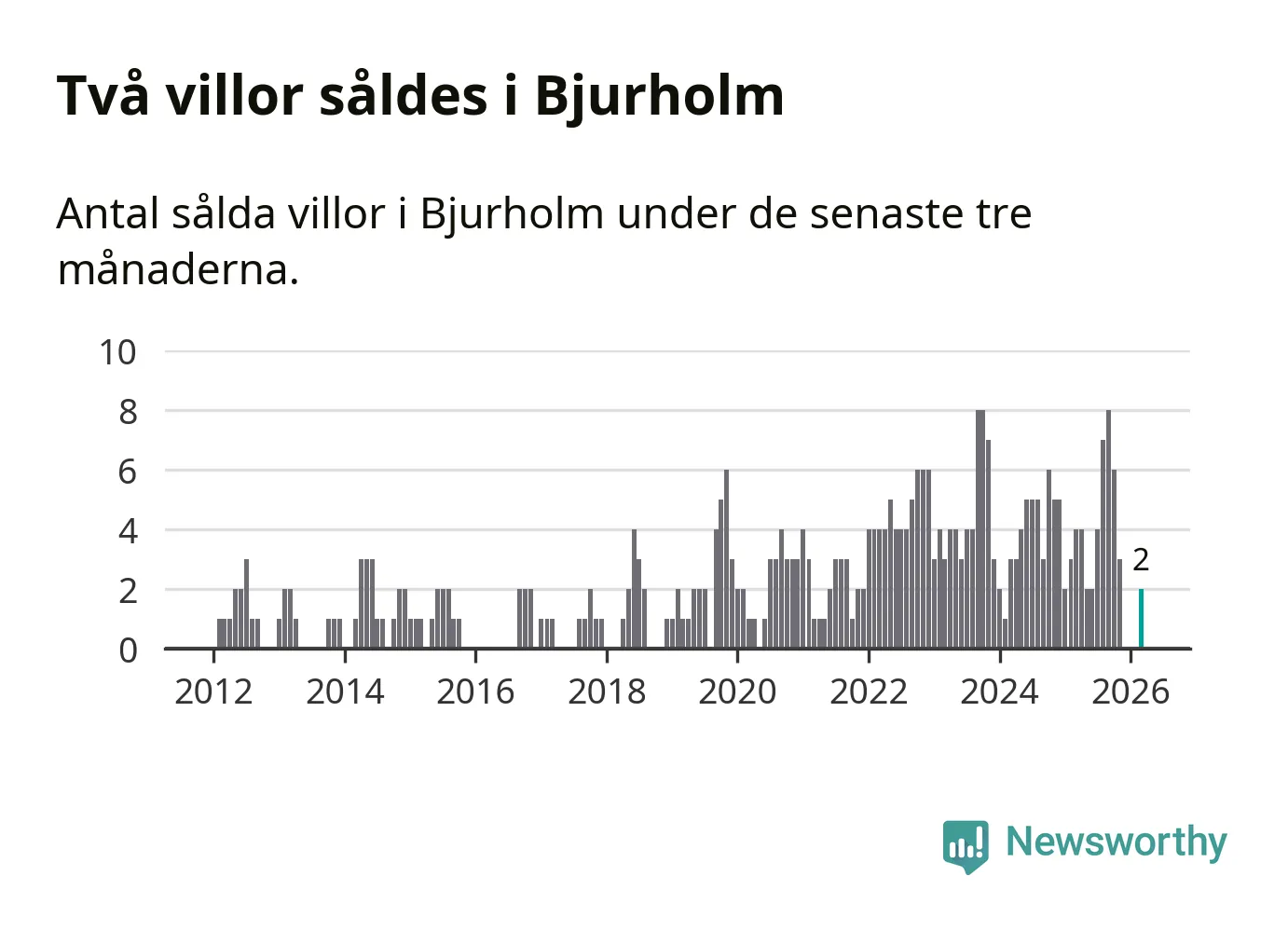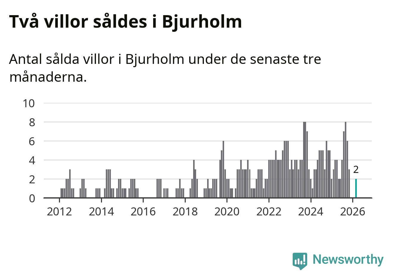 Mellan januari och mars gjordes sammanlagt två affärer med villor i Bjurholms kommun. Det kan jämföras med fyra vid motsvarande tid i fjol.