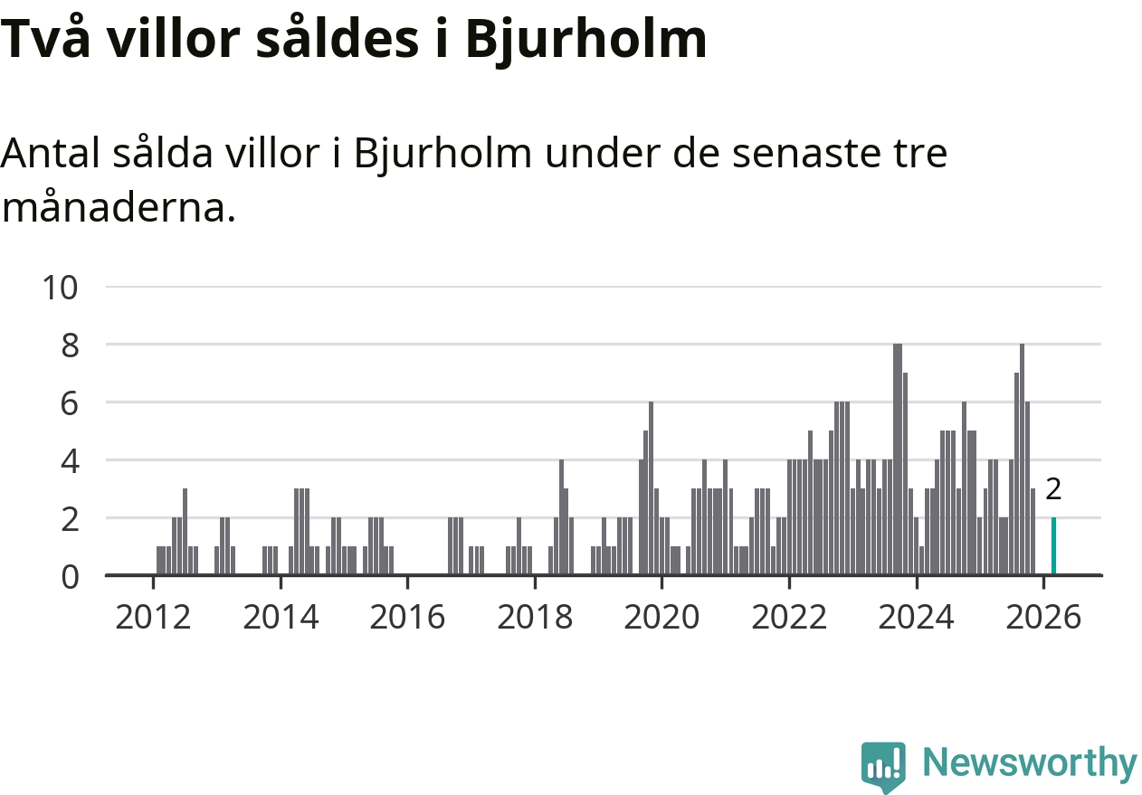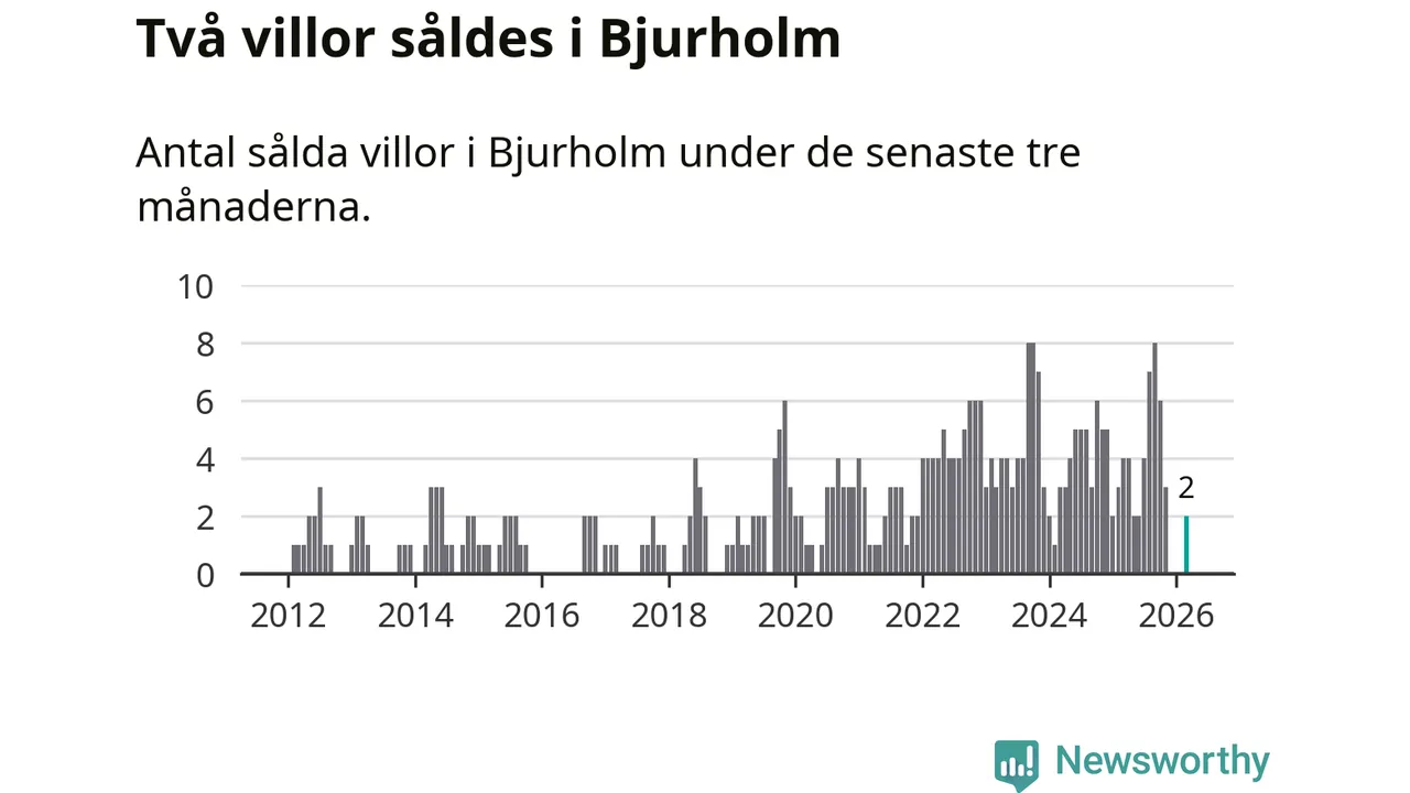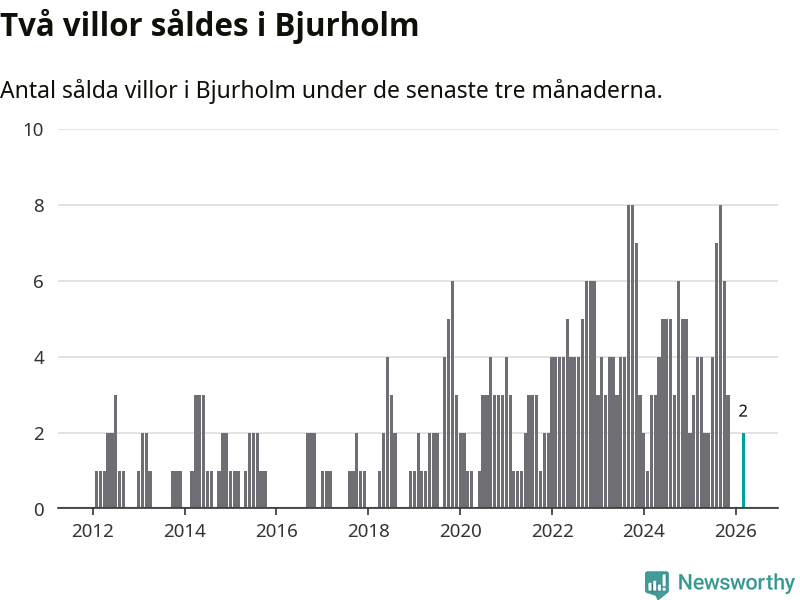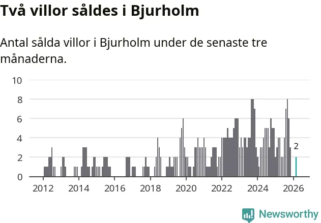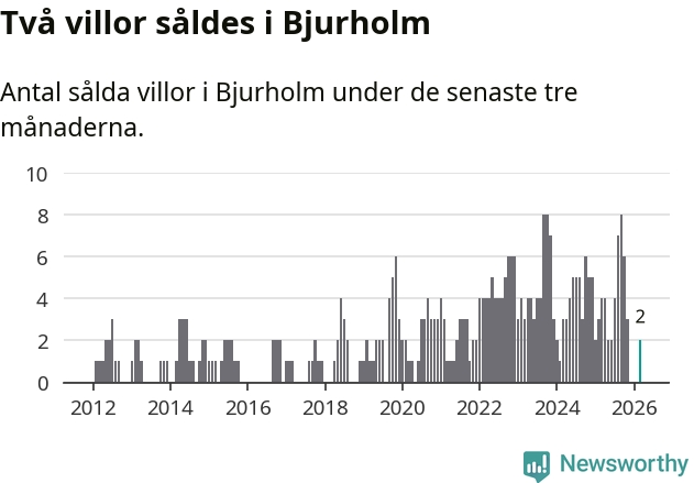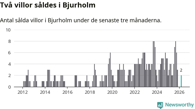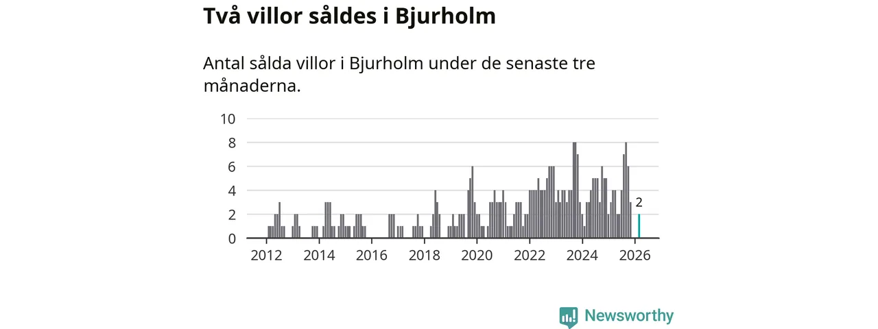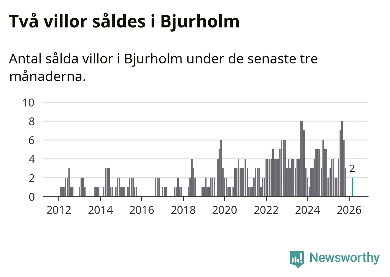 Mellan januari och mars gjordes sammanlagt två affärer med villor i Bjurholms kommun. Det kan jämföras med fyra vid motsvarande tid i fjol.