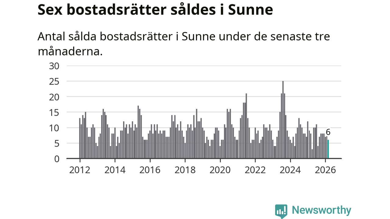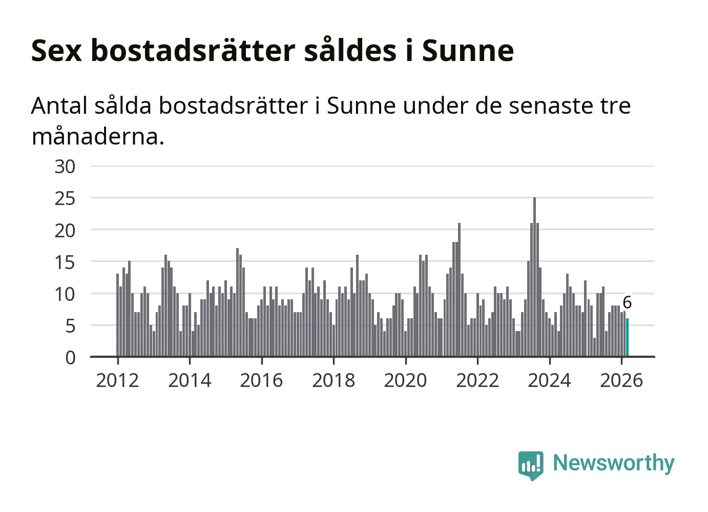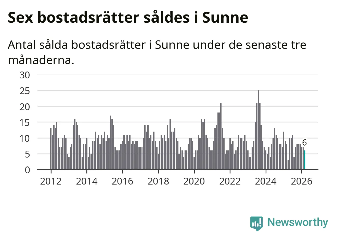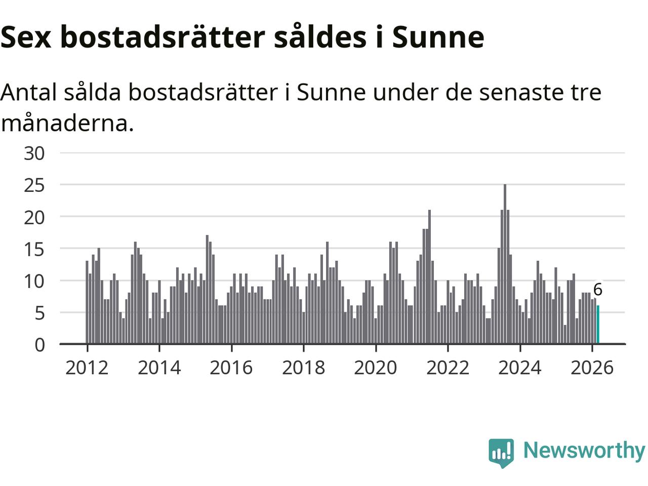 Mellan januari och mars gjordes sammanlagt sex affärer med bostadsrätter i Sunne kommun. Det kan jämföras med åtta vid motsvarande tid i fjol.