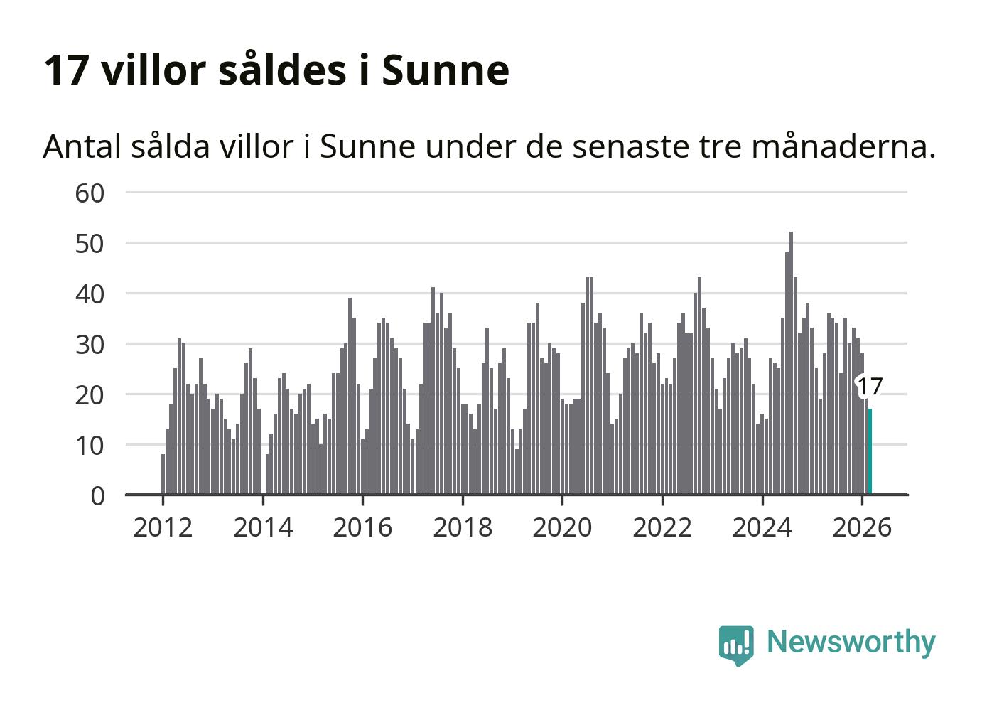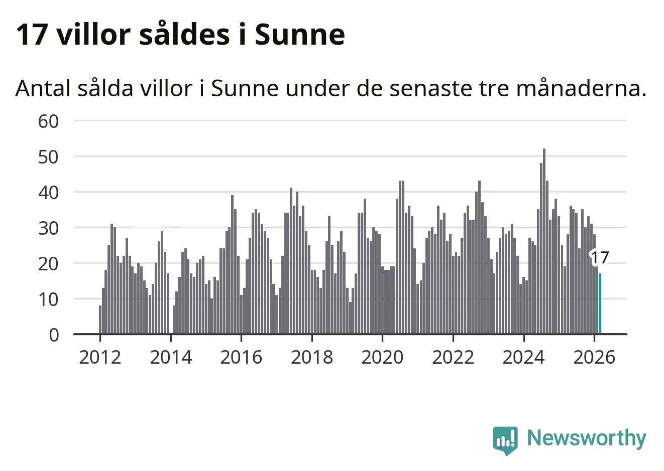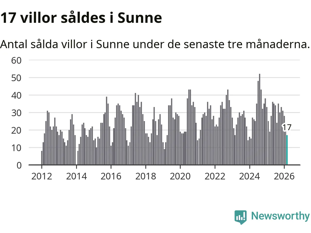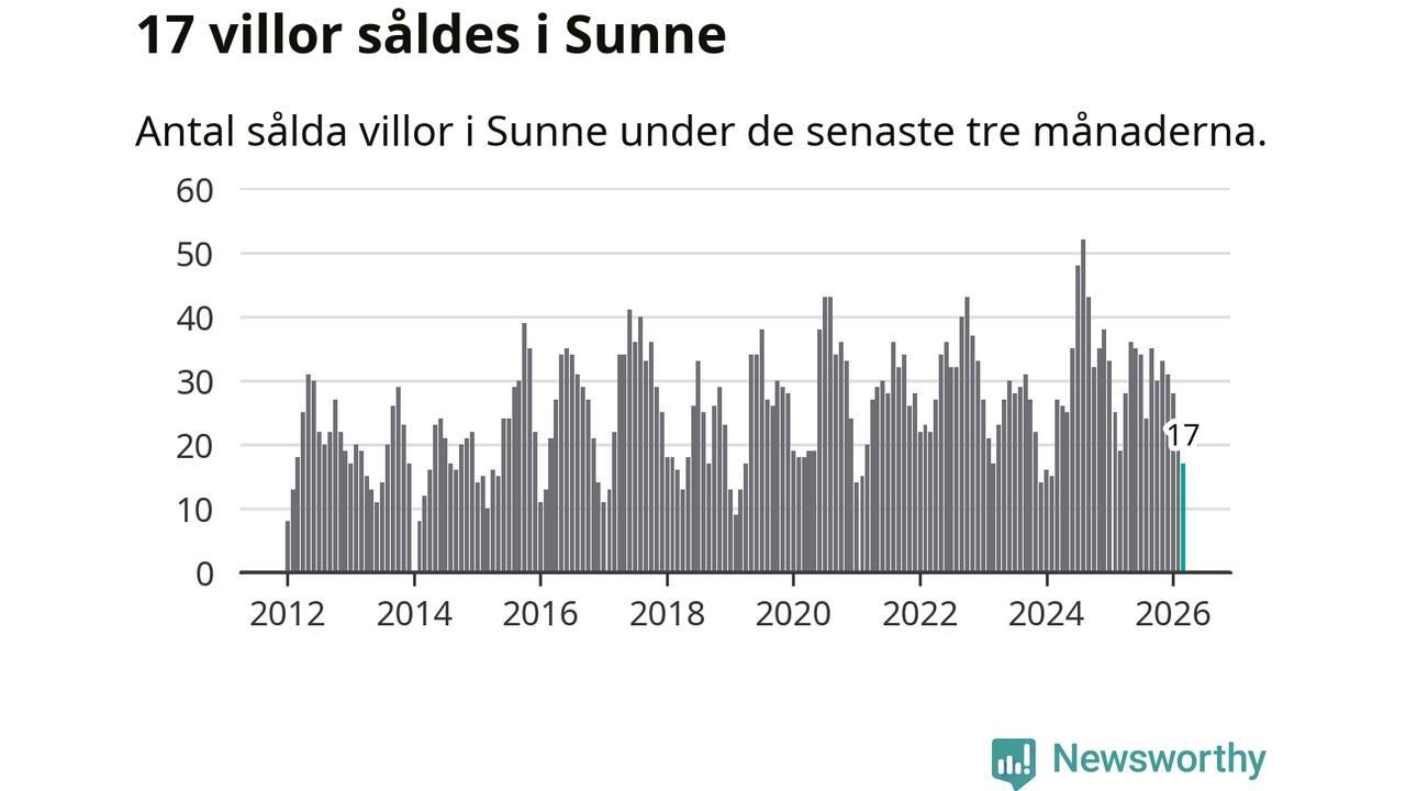Mellan januari och mars gjordes sammanlagt 17 affärer med villor i Sunne kommun. Det kan jämföras med 19 vid motsvarande tid i fjol.