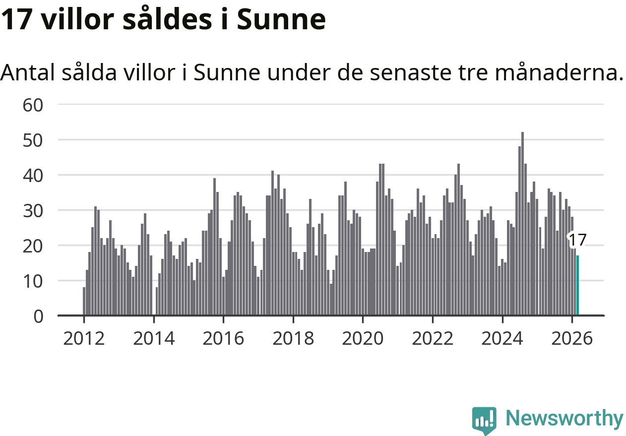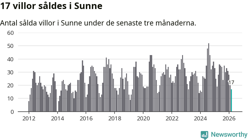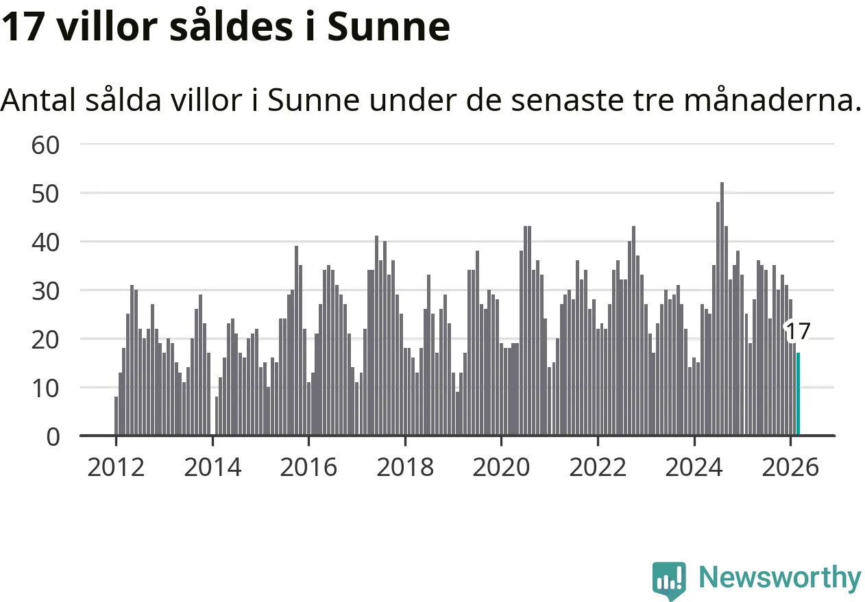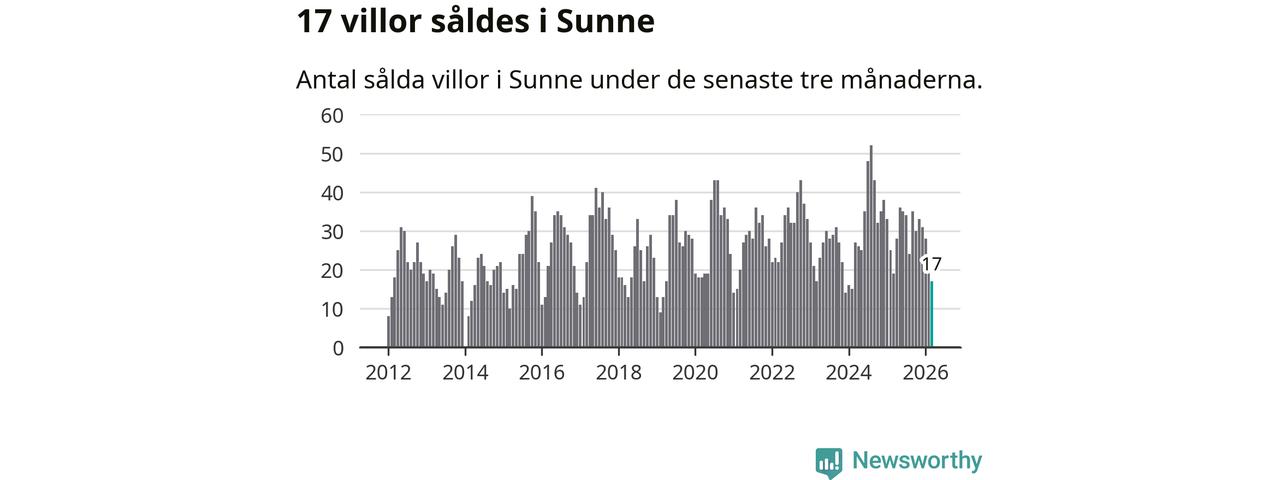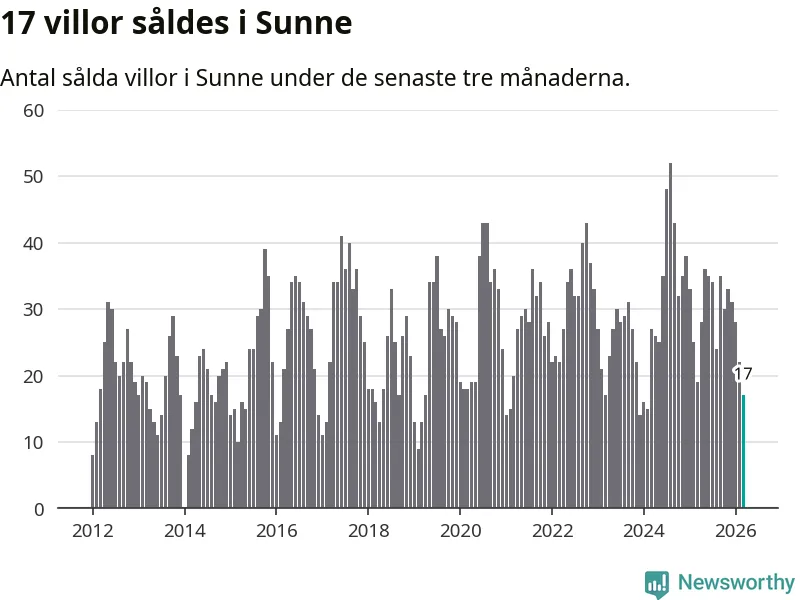 Mellan januari och mars gjordes sammanlagt 17 affärer med villor i Sunne kommun. Det kan jämföras med 19 vid motsvarande tid i fjol.