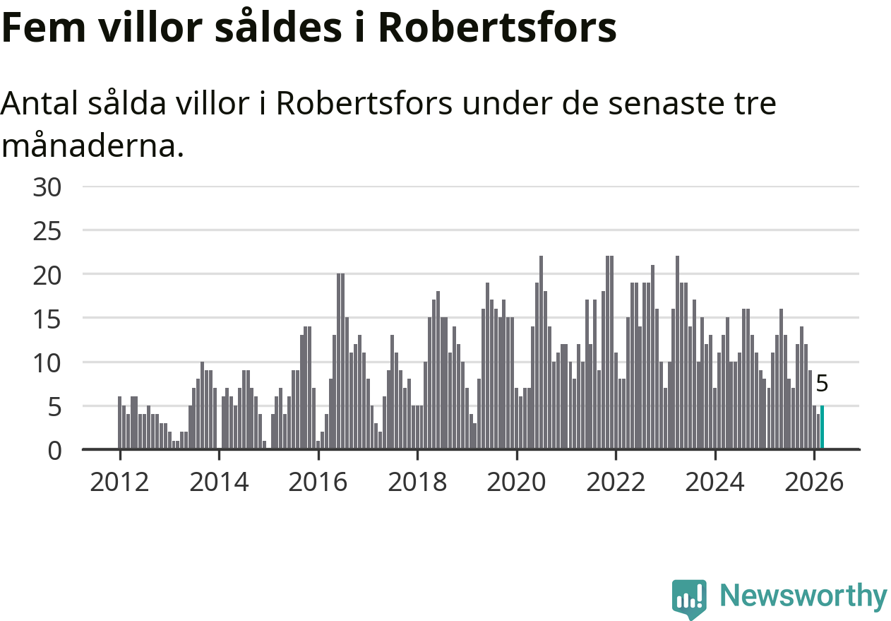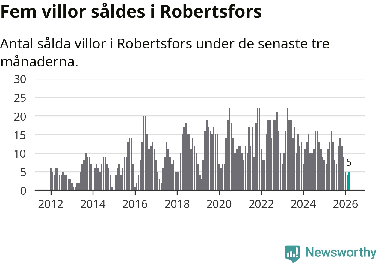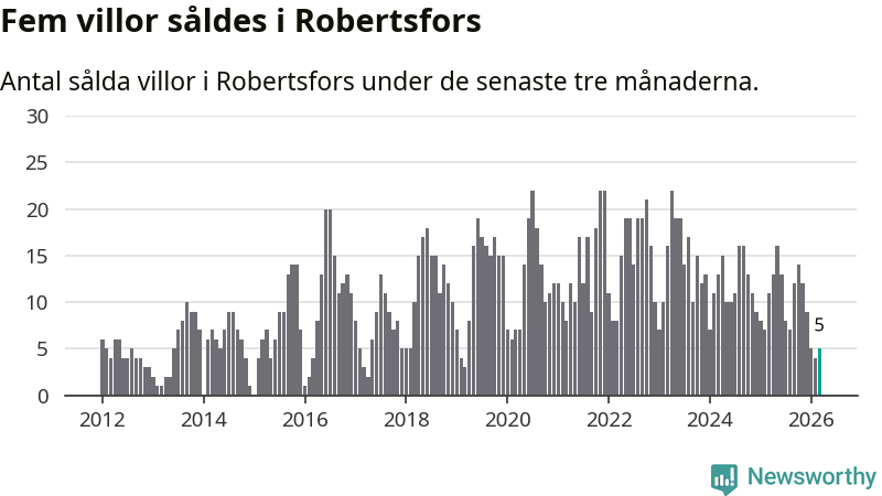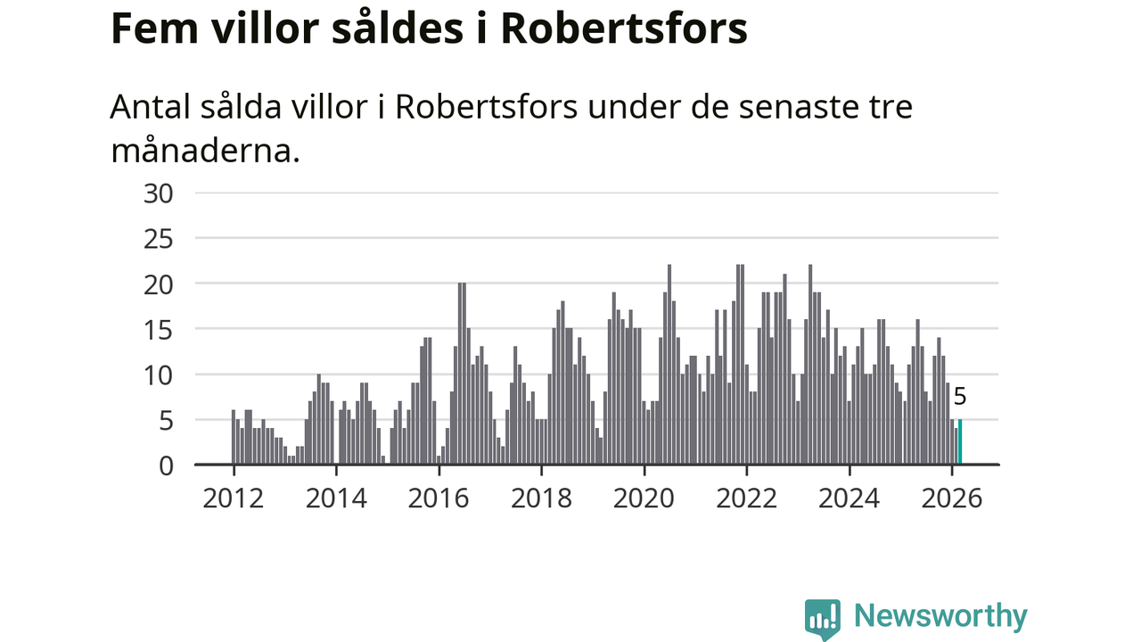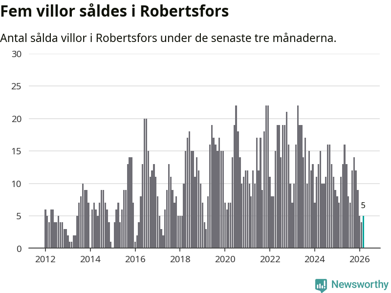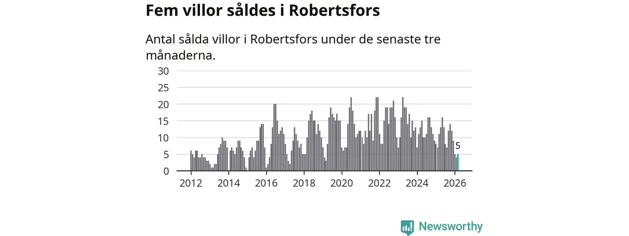 Mellan januari och mars gjordes sammanlagt fem affärer med villor i Robertsfors kommun. Det kan jämföras med elva vid motsvarande tid i fjol.