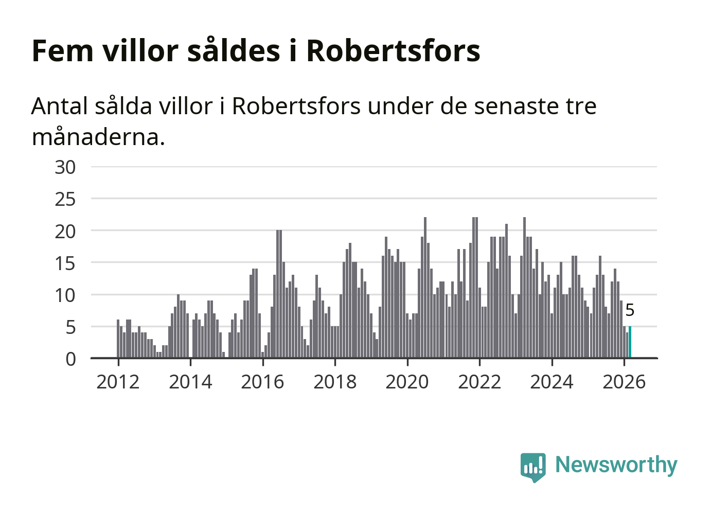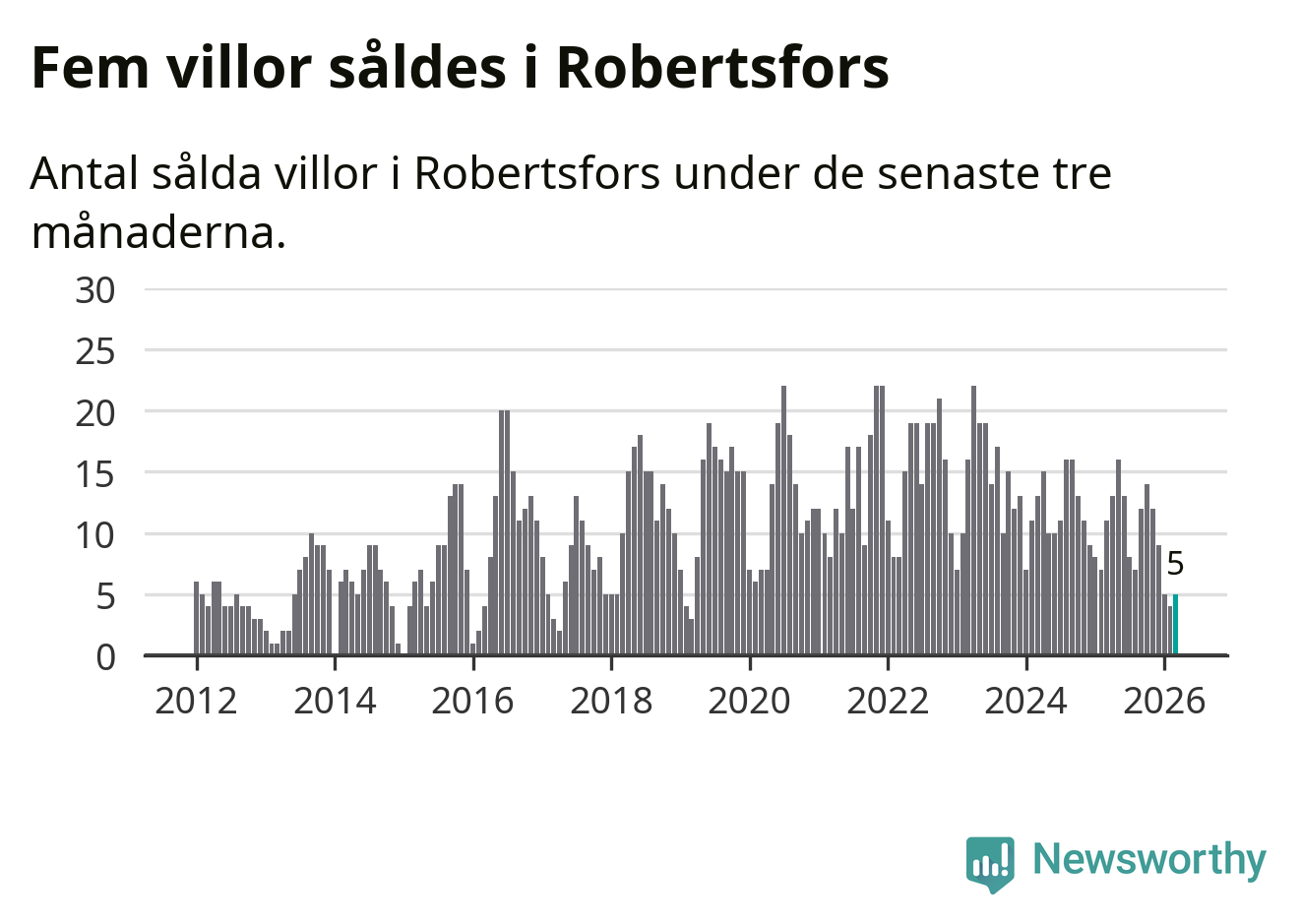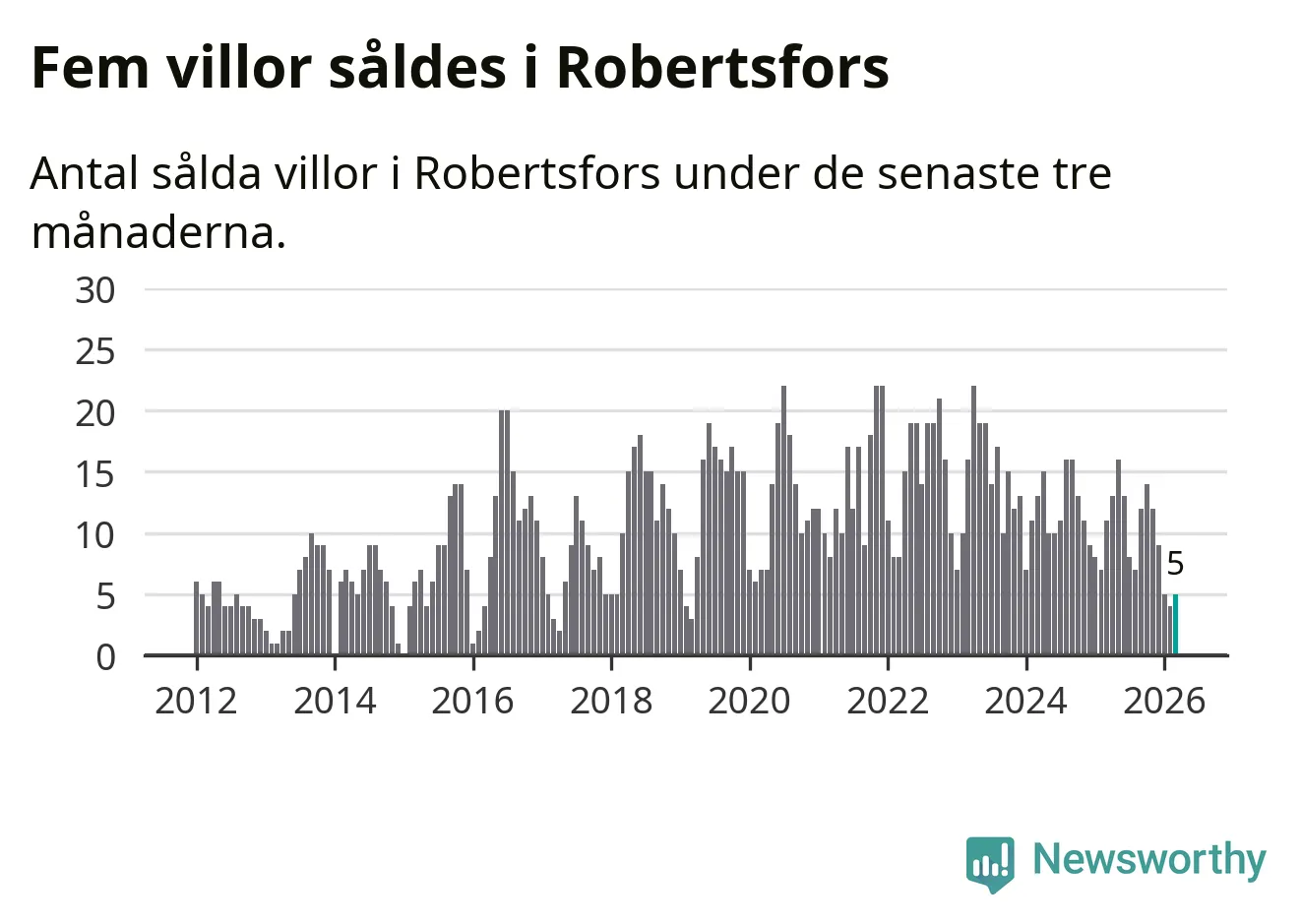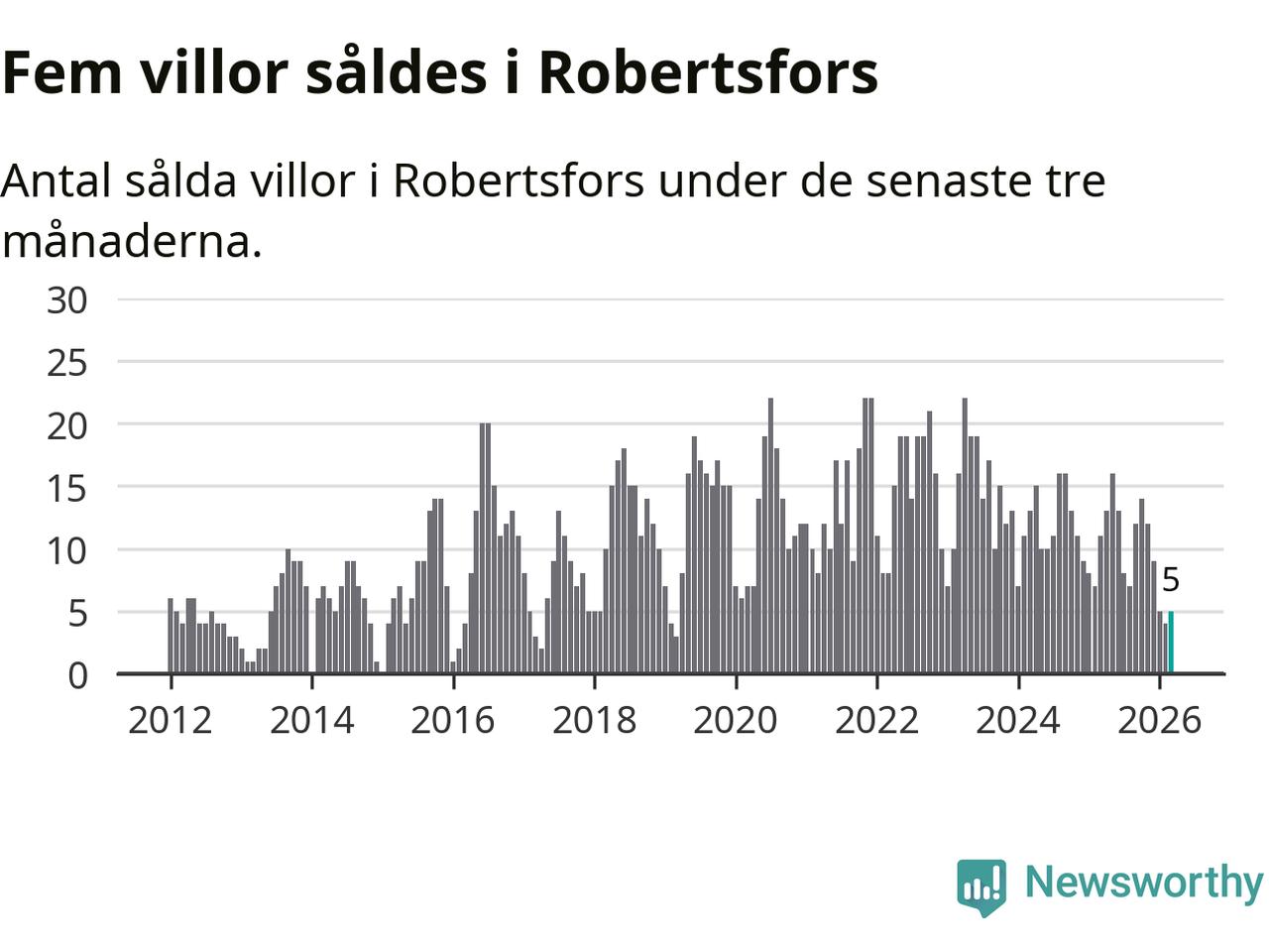 Mellan januari och mars gjordes sammanlagt fem affärer med villor i Robertsfors kommun. Det kan jämföras med elva vid motsvarande tid i fjol.