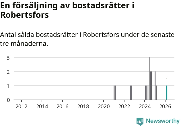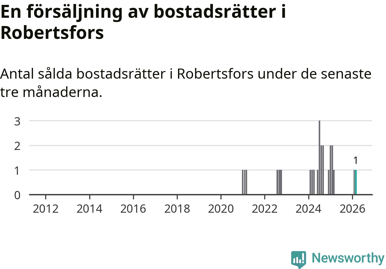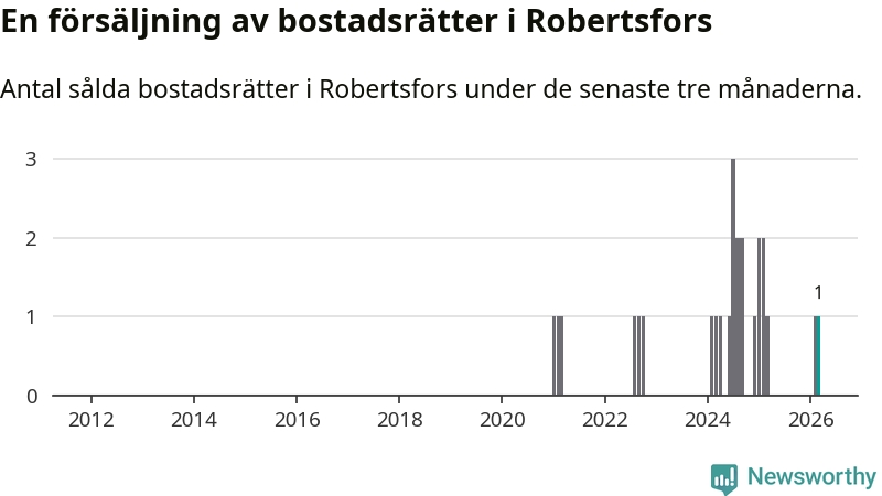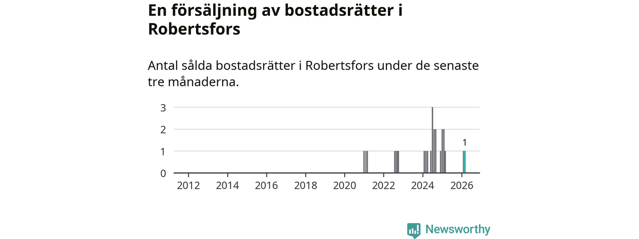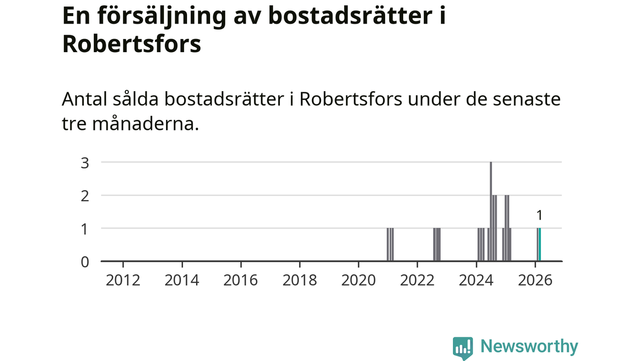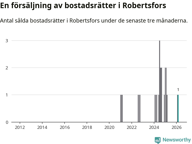 Mellan januari och mars gjordes sammanlagt en affär med bostadsrätter i Robertsfors kommun. Det är lika många affärer som vid motsvarande tid i fjol.