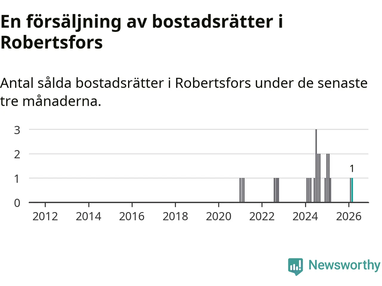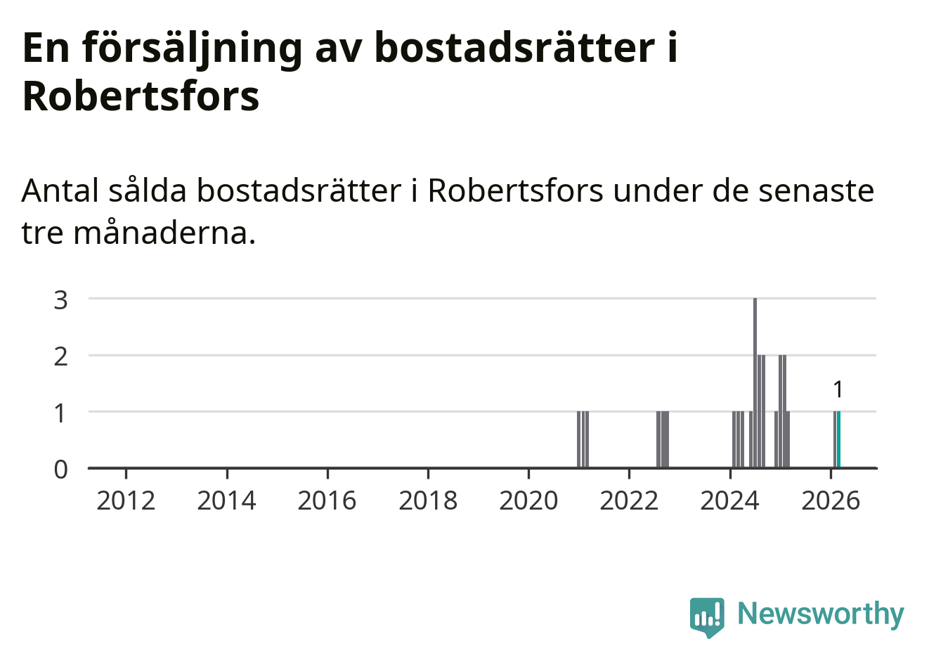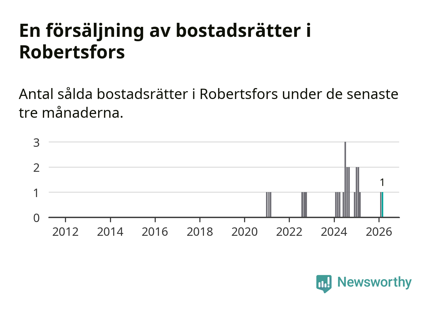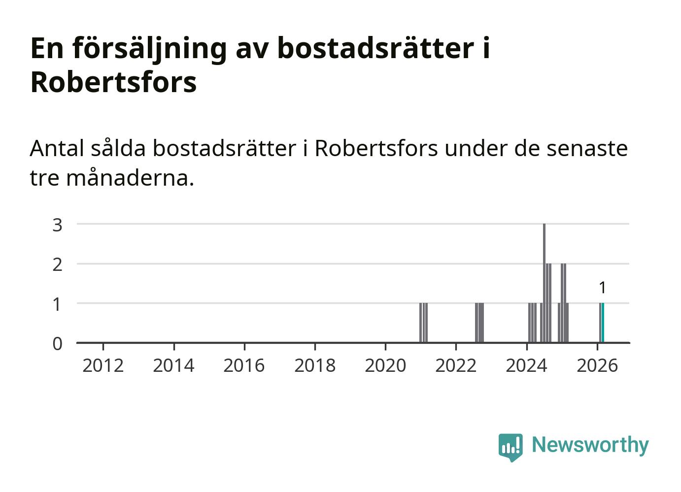 Mellan januari och mars gjordes sammanlagt en affär med bostadsrätter i Robertsfors kommun. Det är lika många affärer som vid motsvarande tid i fjol.