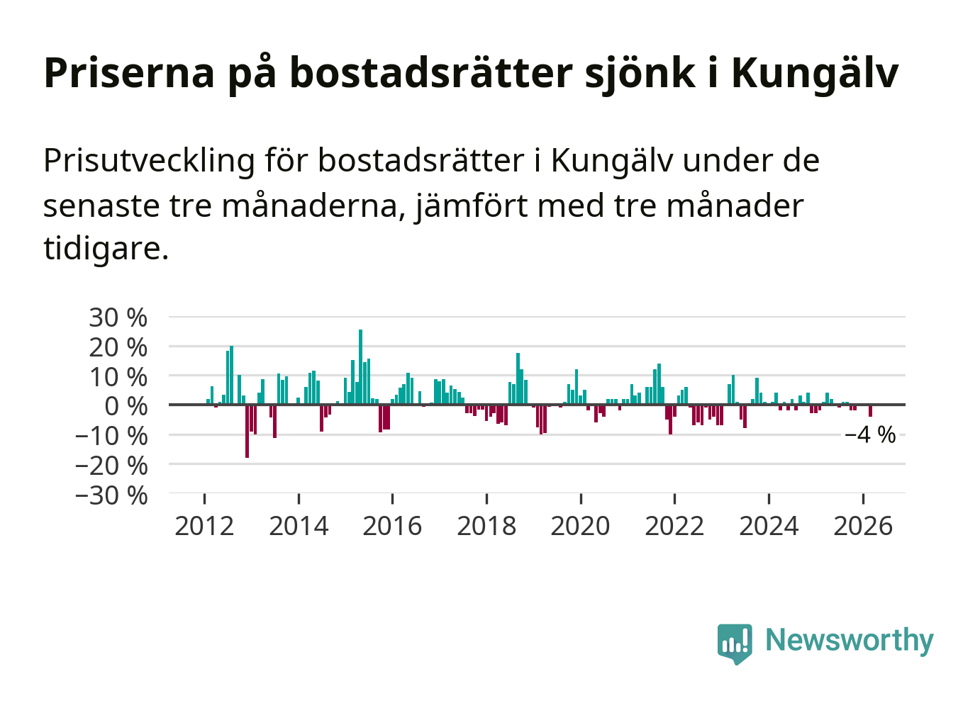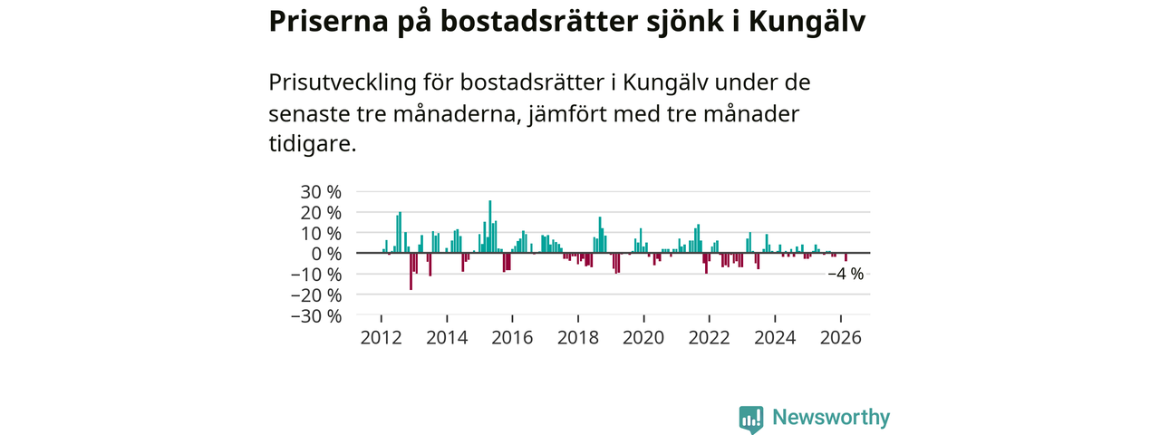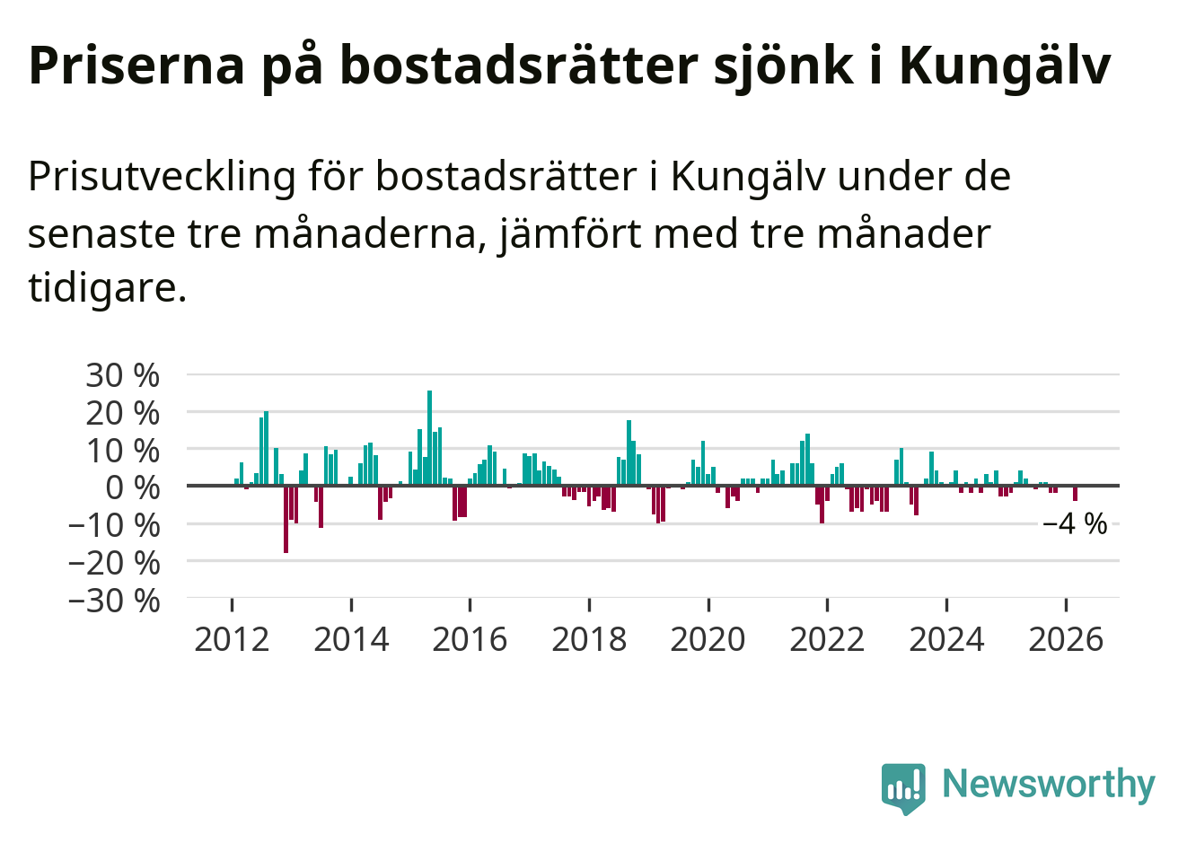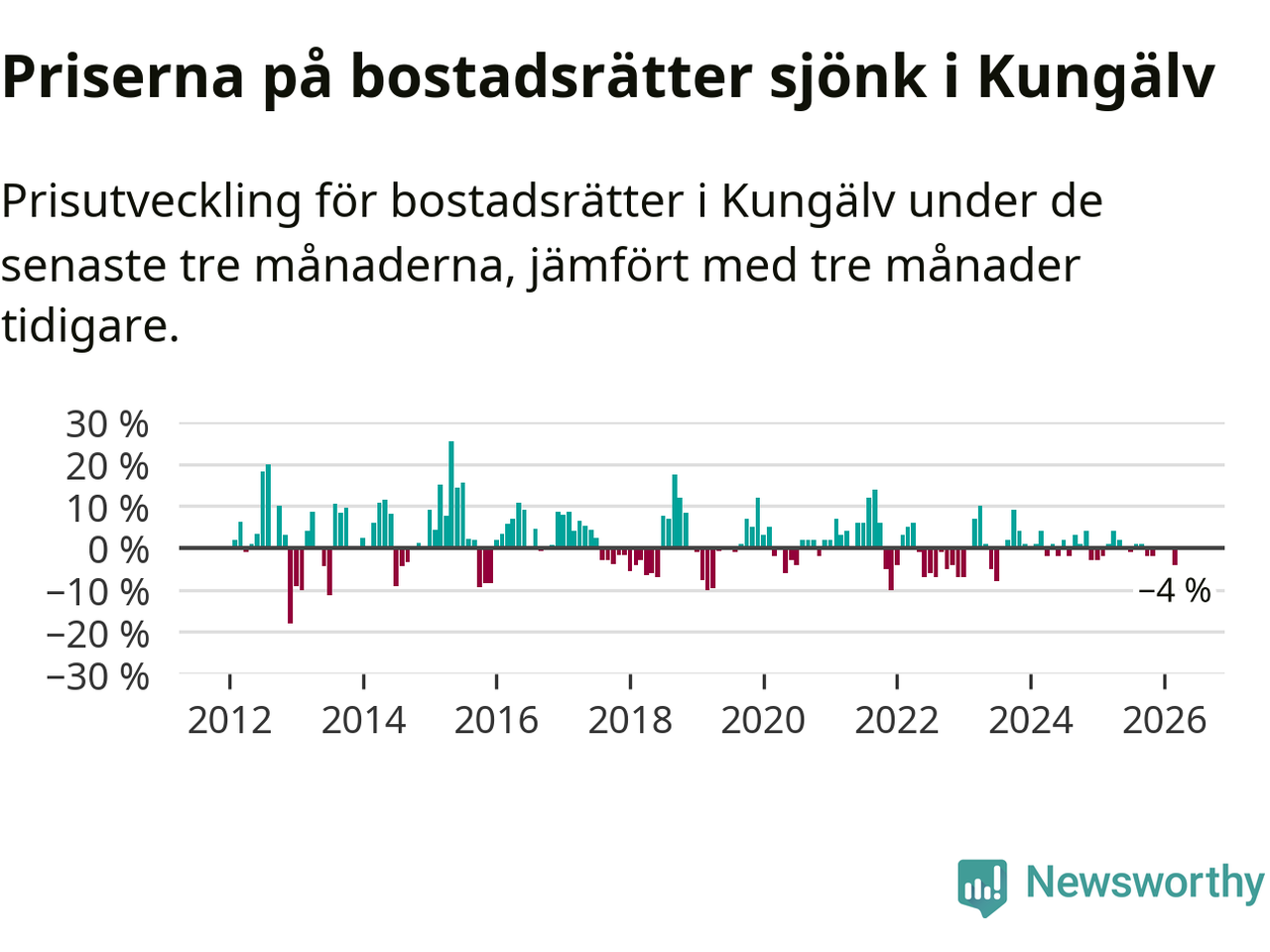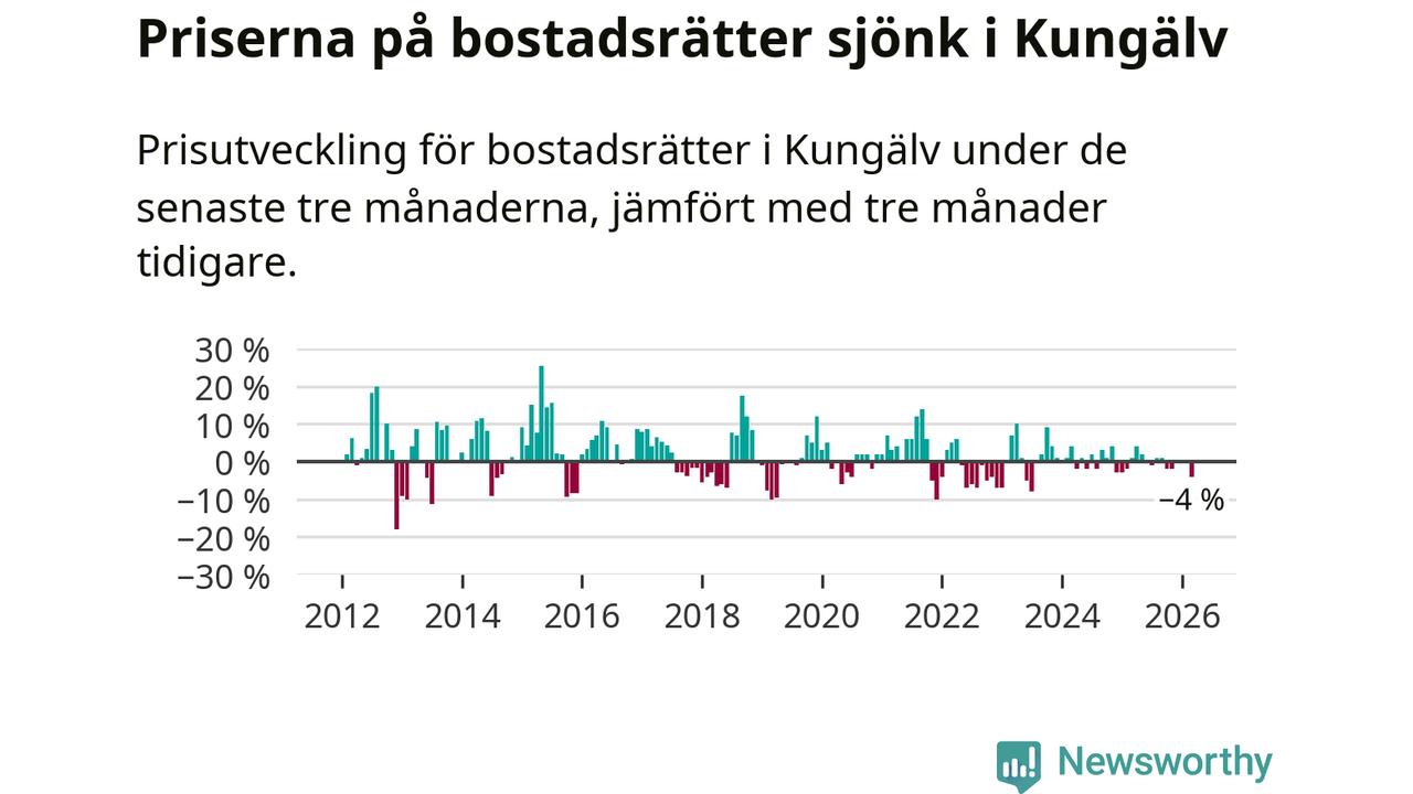 Priserna på bostadsrätter har gått ner i Kungälvs kommun. Medelpriset på försäljningarna under de senaste tre månaderna visar på en nedgång med 4 procent.