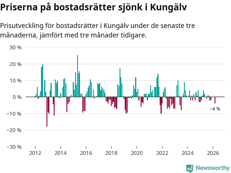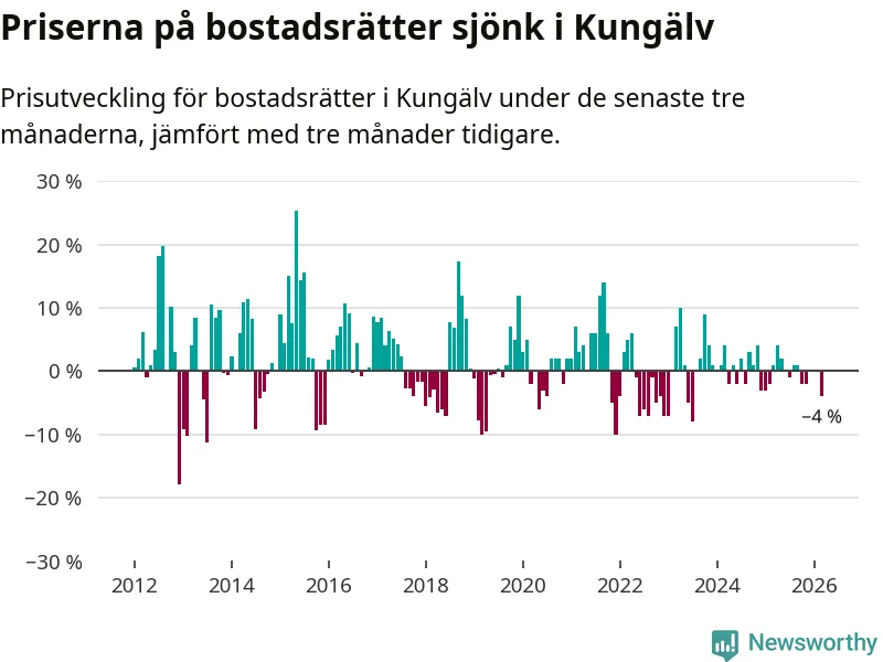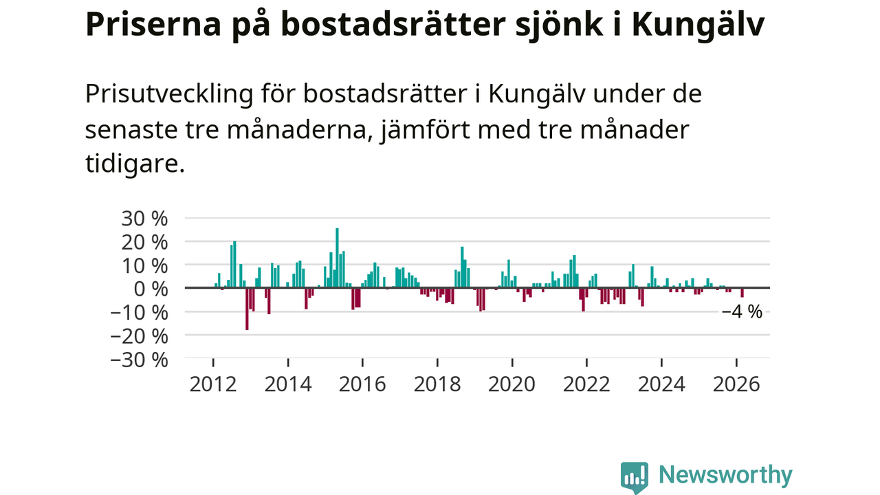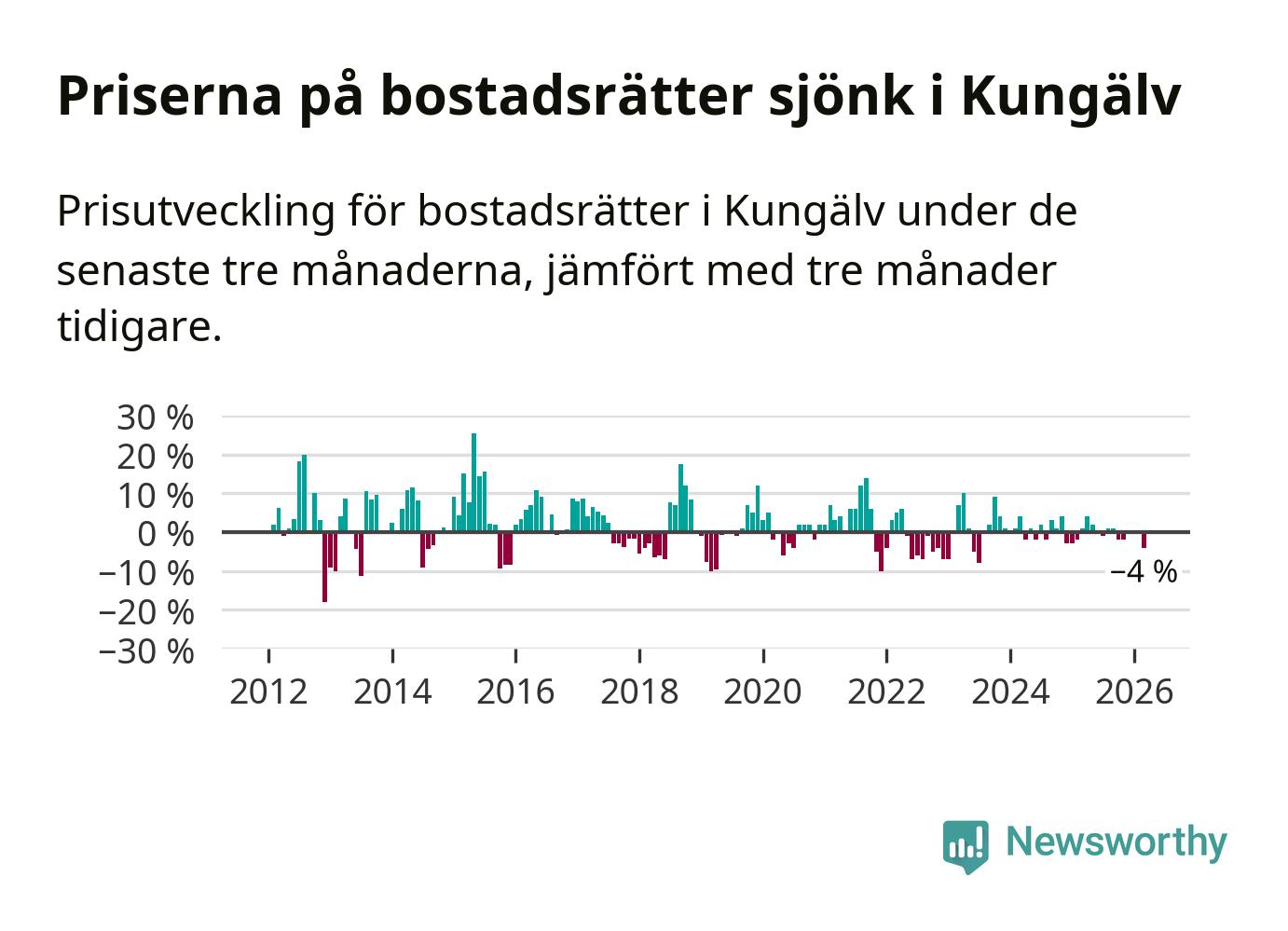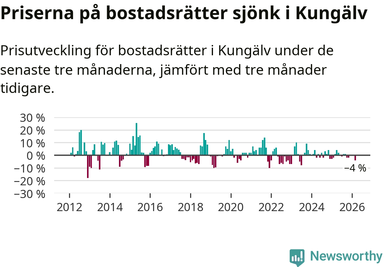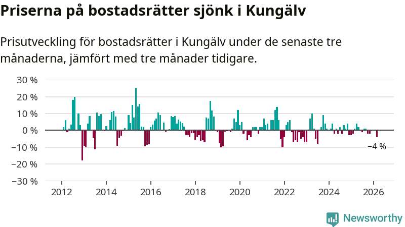 Priserna på bostadsrätter har gått ner i Kungälvs kommun. Medelpriset på försäljningarna under de senaste tre månaderna visar på en nedgång med 4 procent.